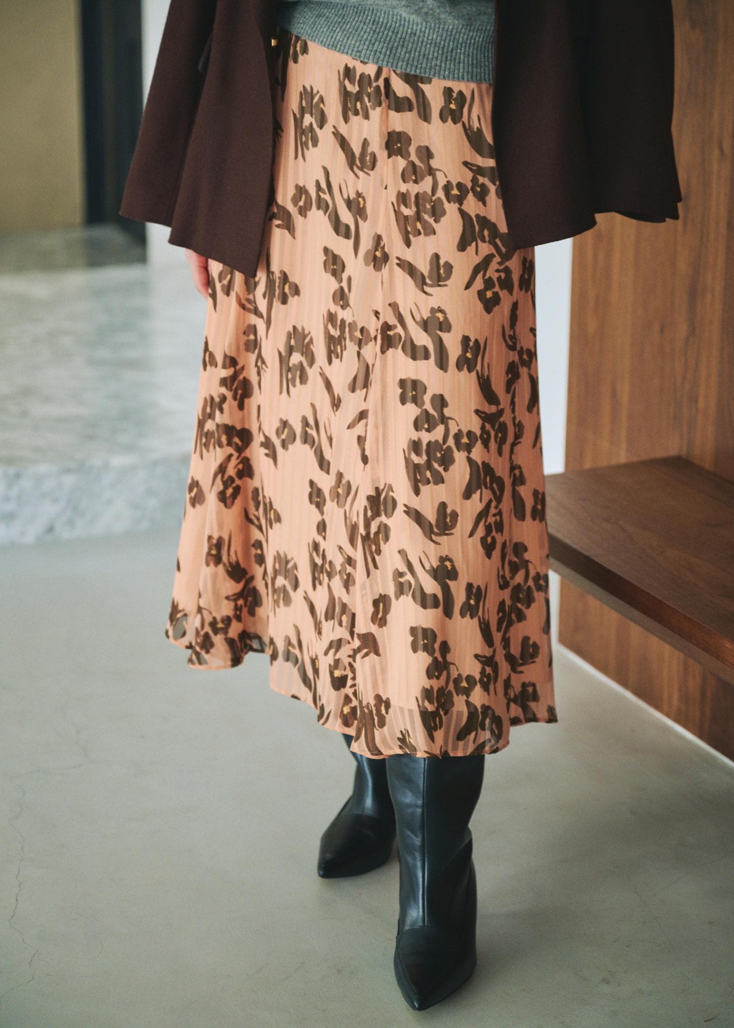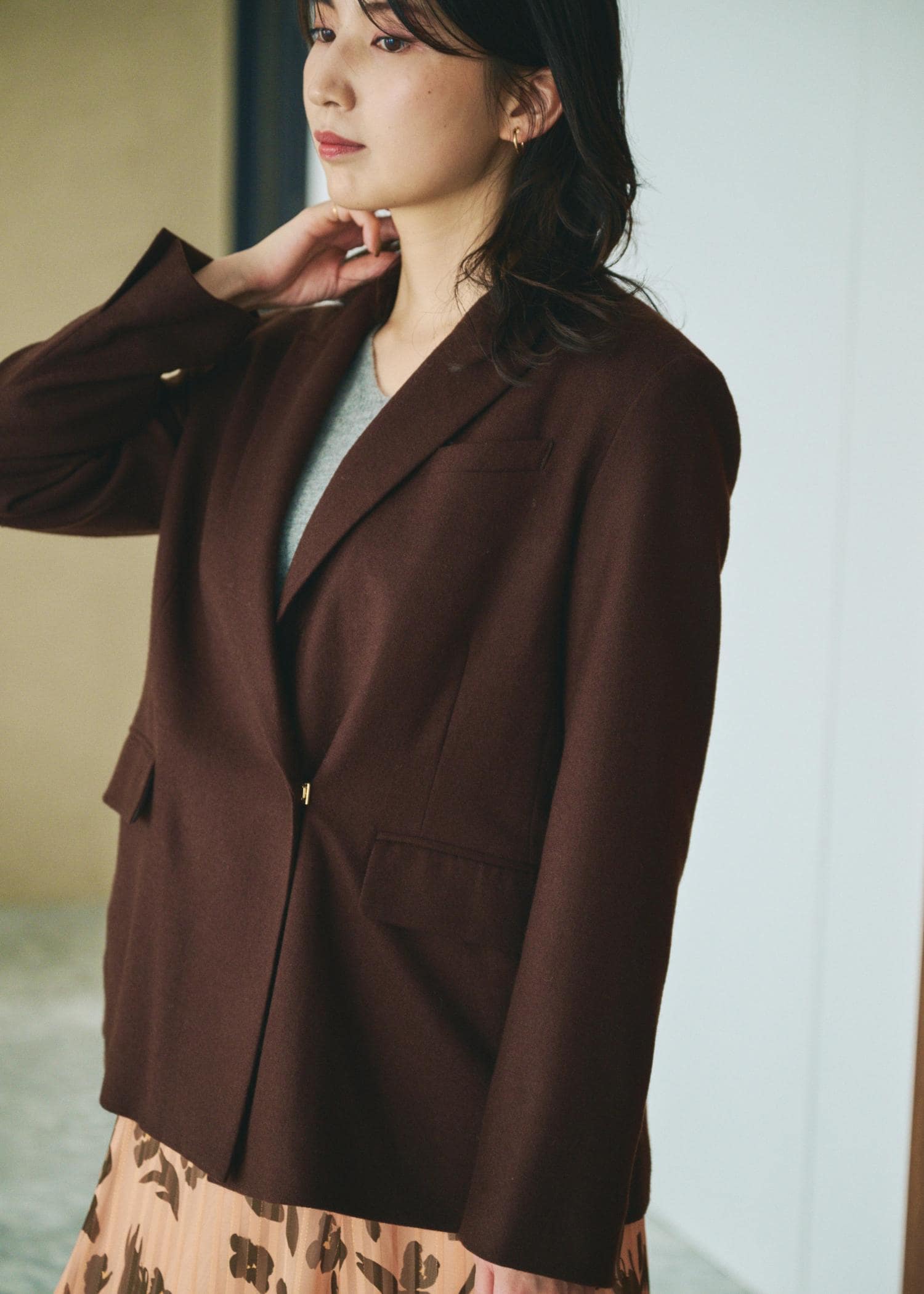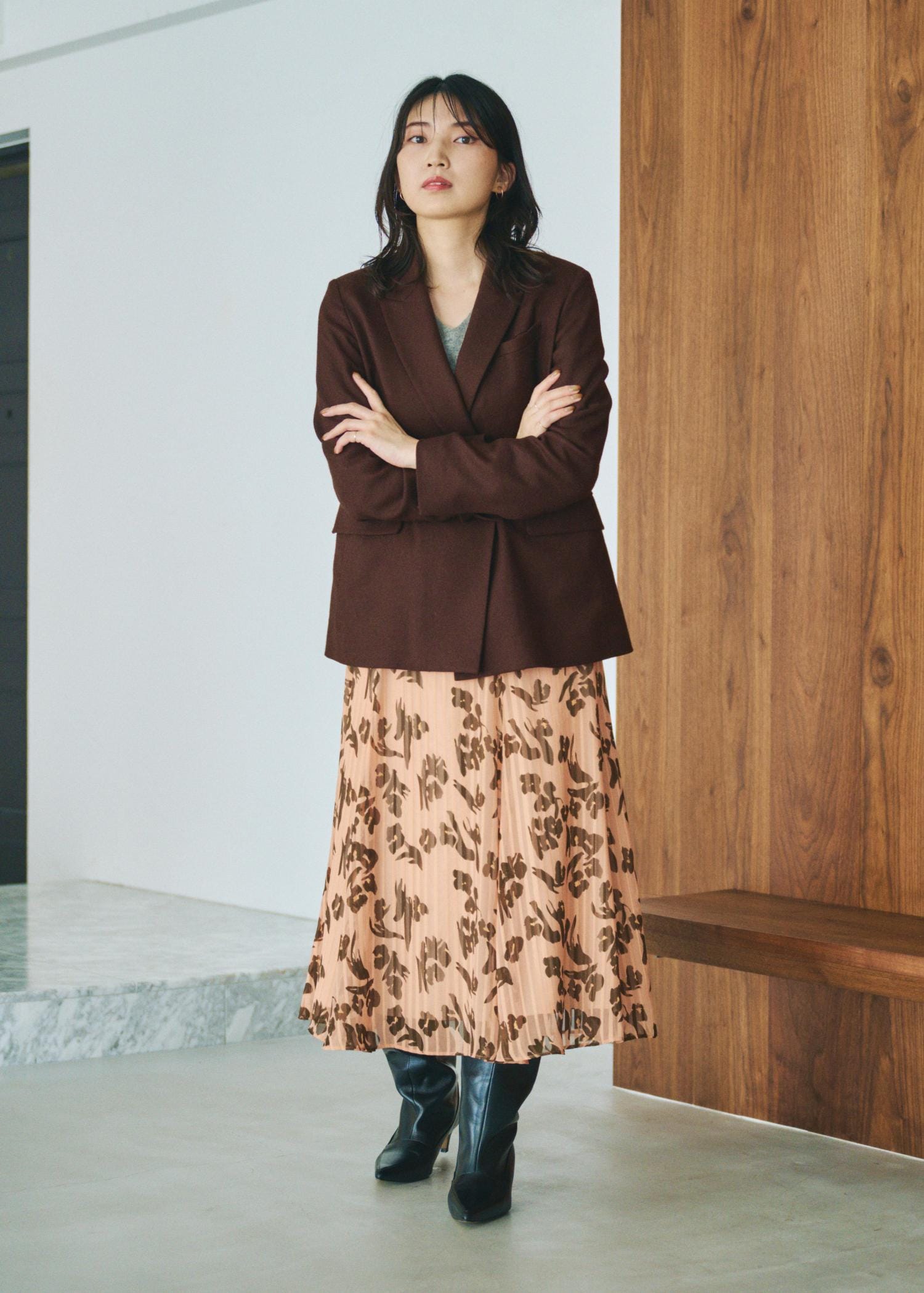 上品ブラウン×オレンジでつくる、秋冬の華やぎスタイル。