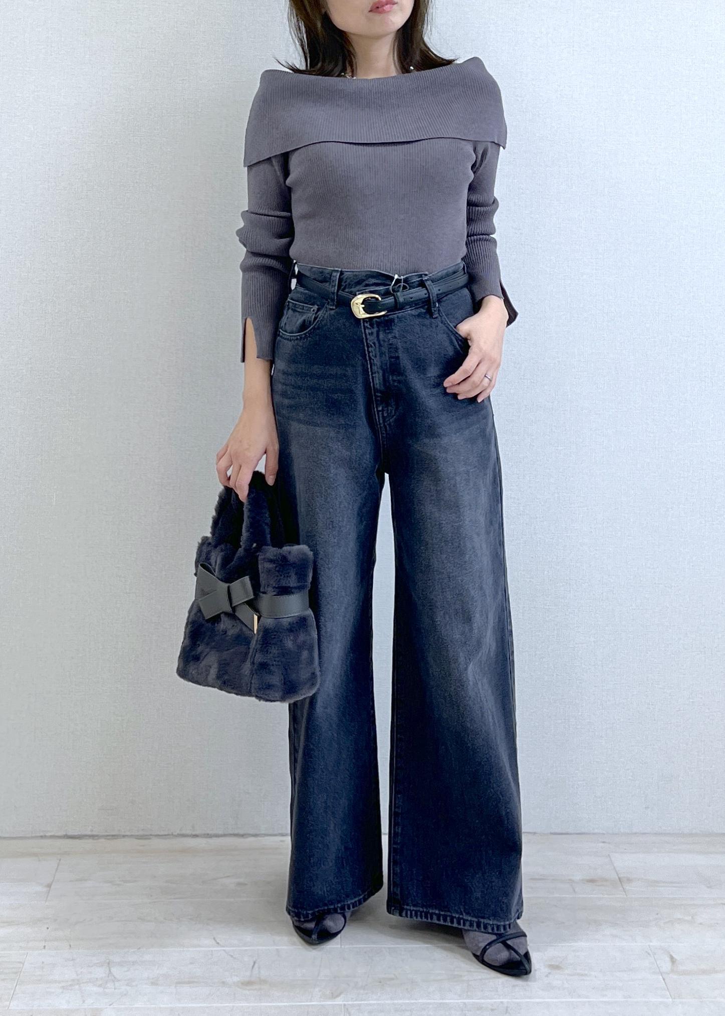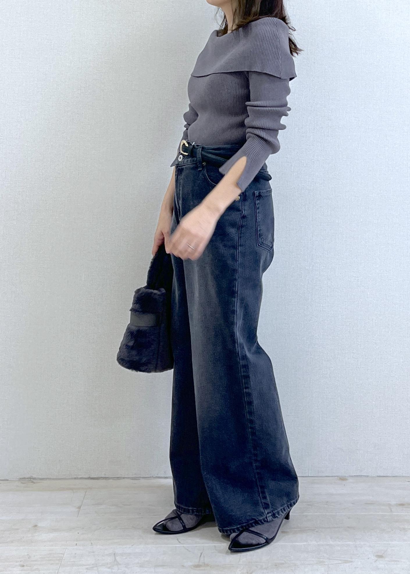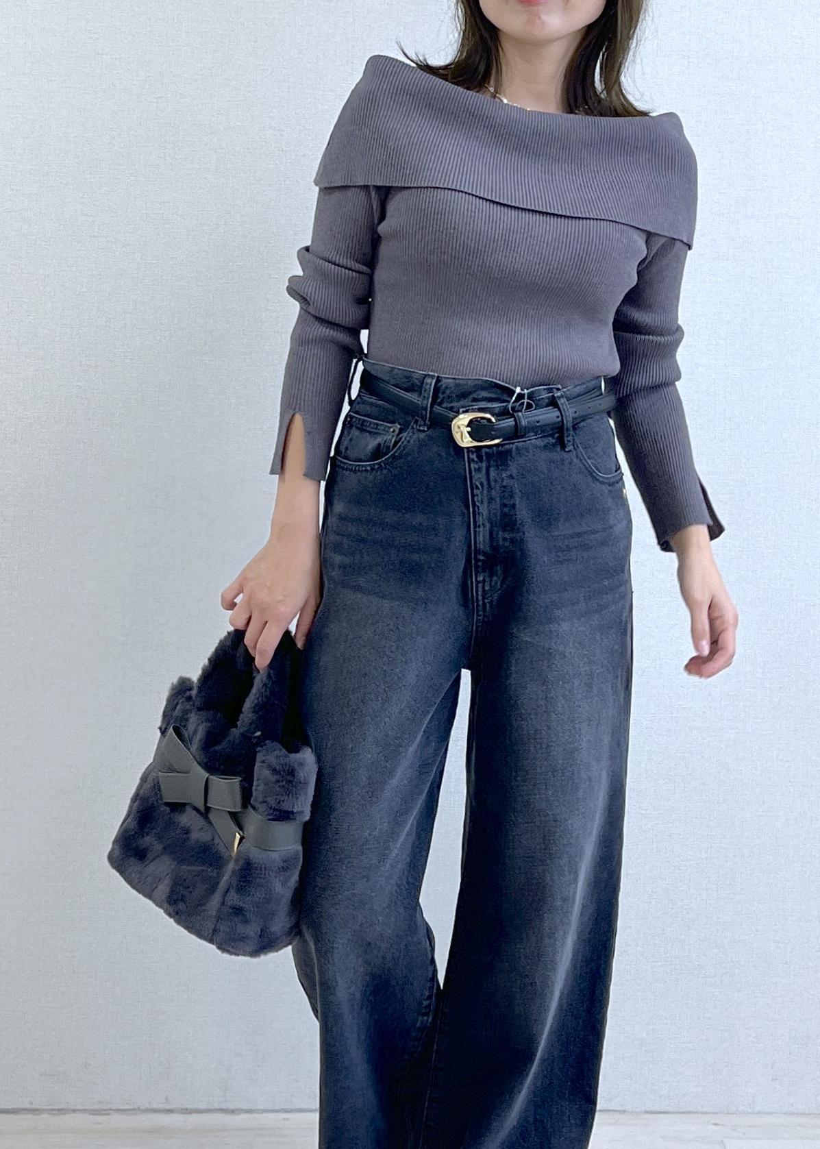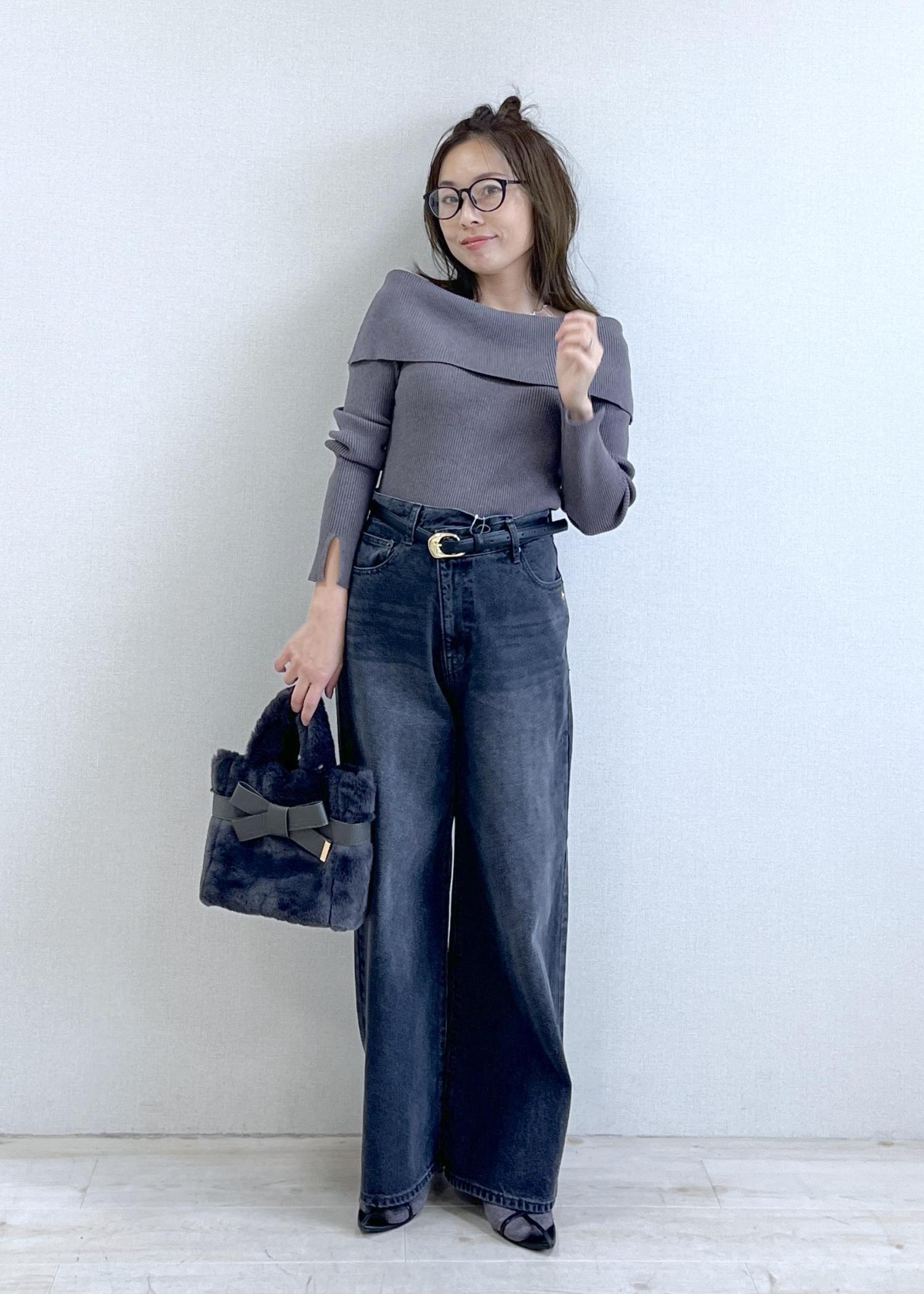 オフショル風ニットで首元すっきり、ちょっと大人っぽい雰囲気に。
