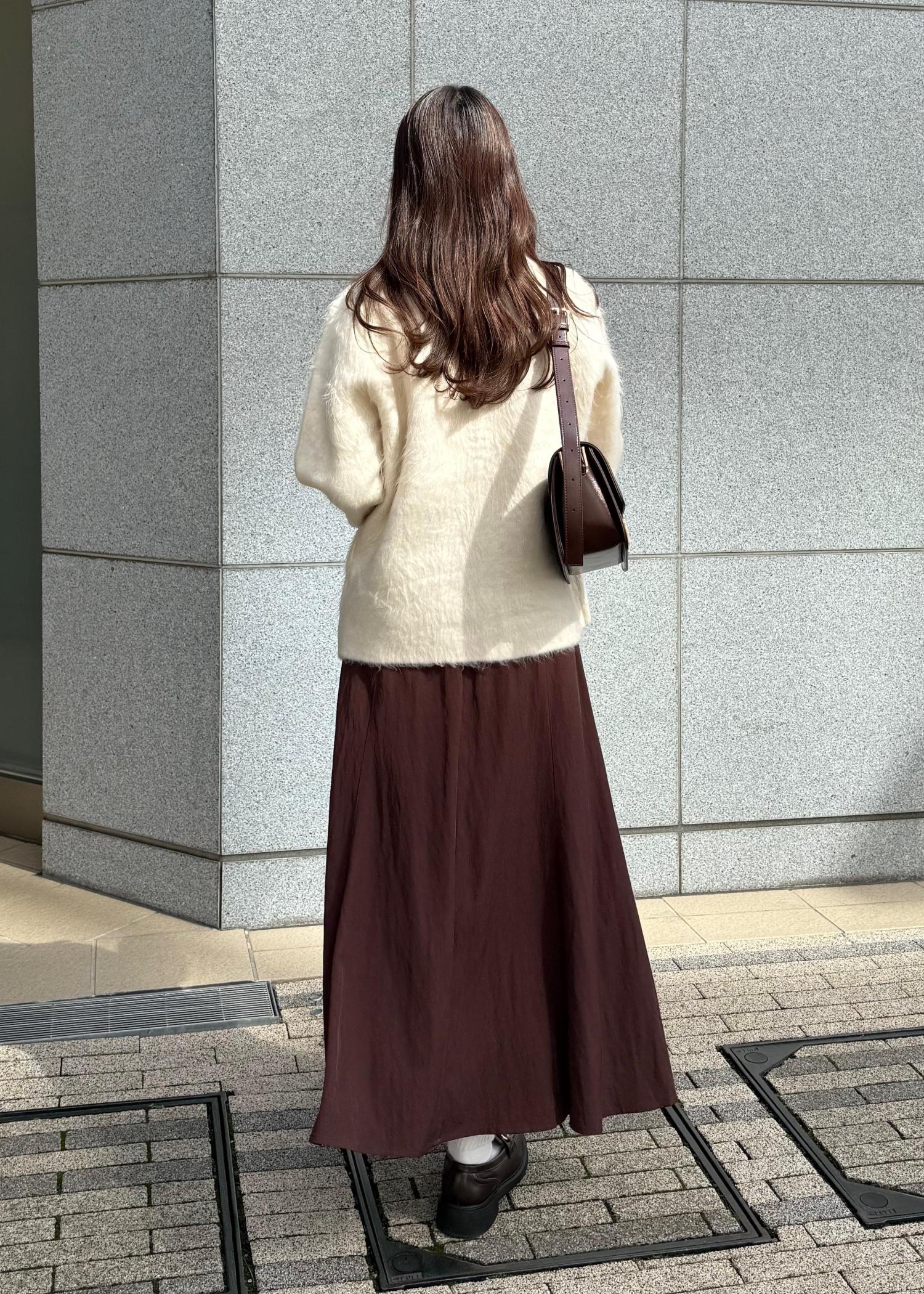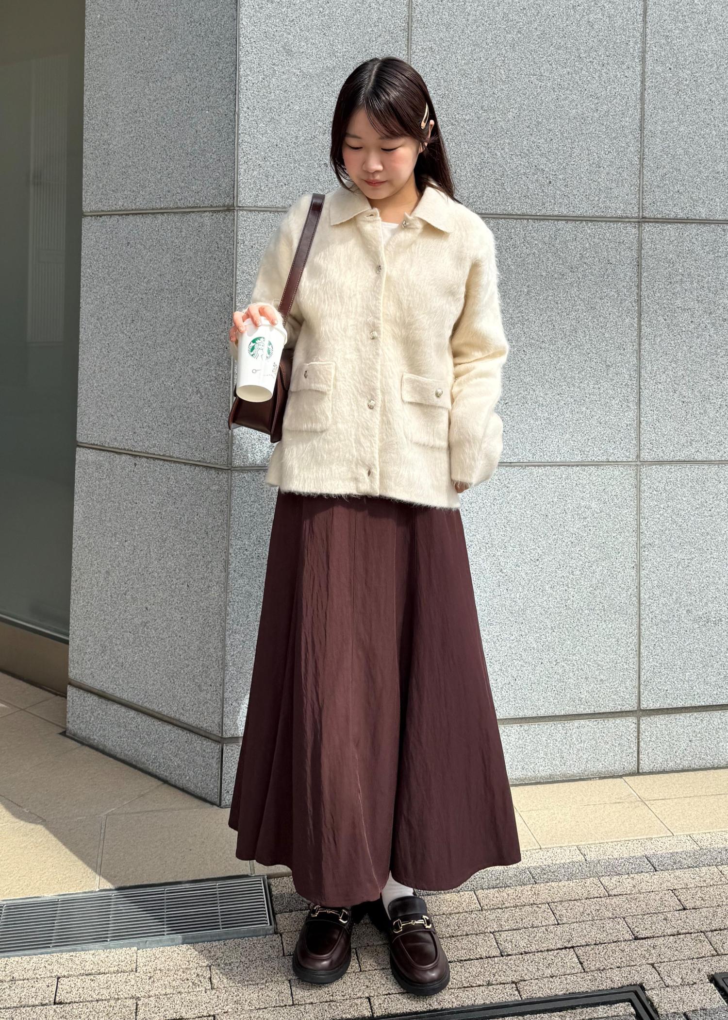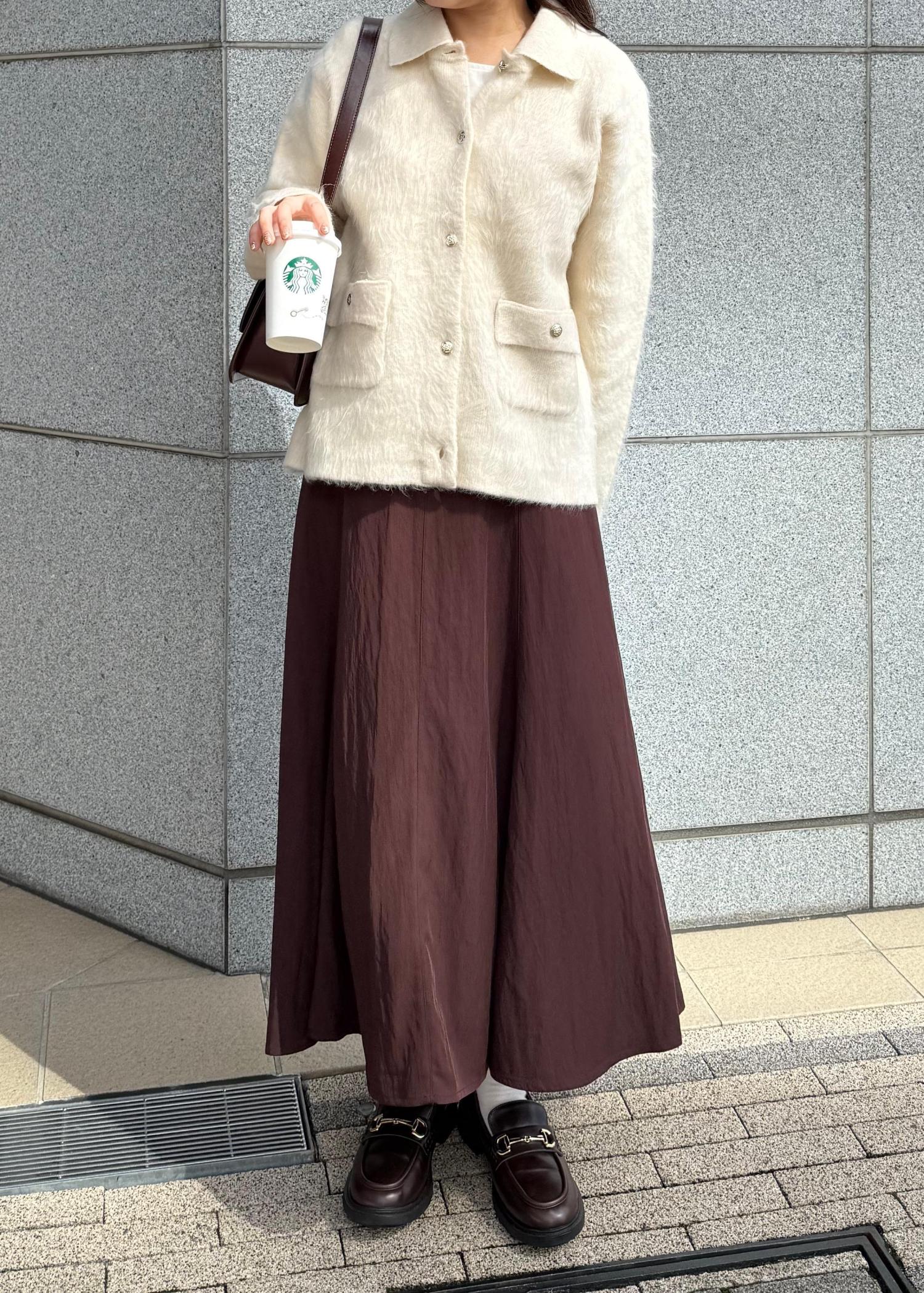 毛足が長めのカーディガンを主役に、フェミニンな雰囲気の秋コーデを組みました。