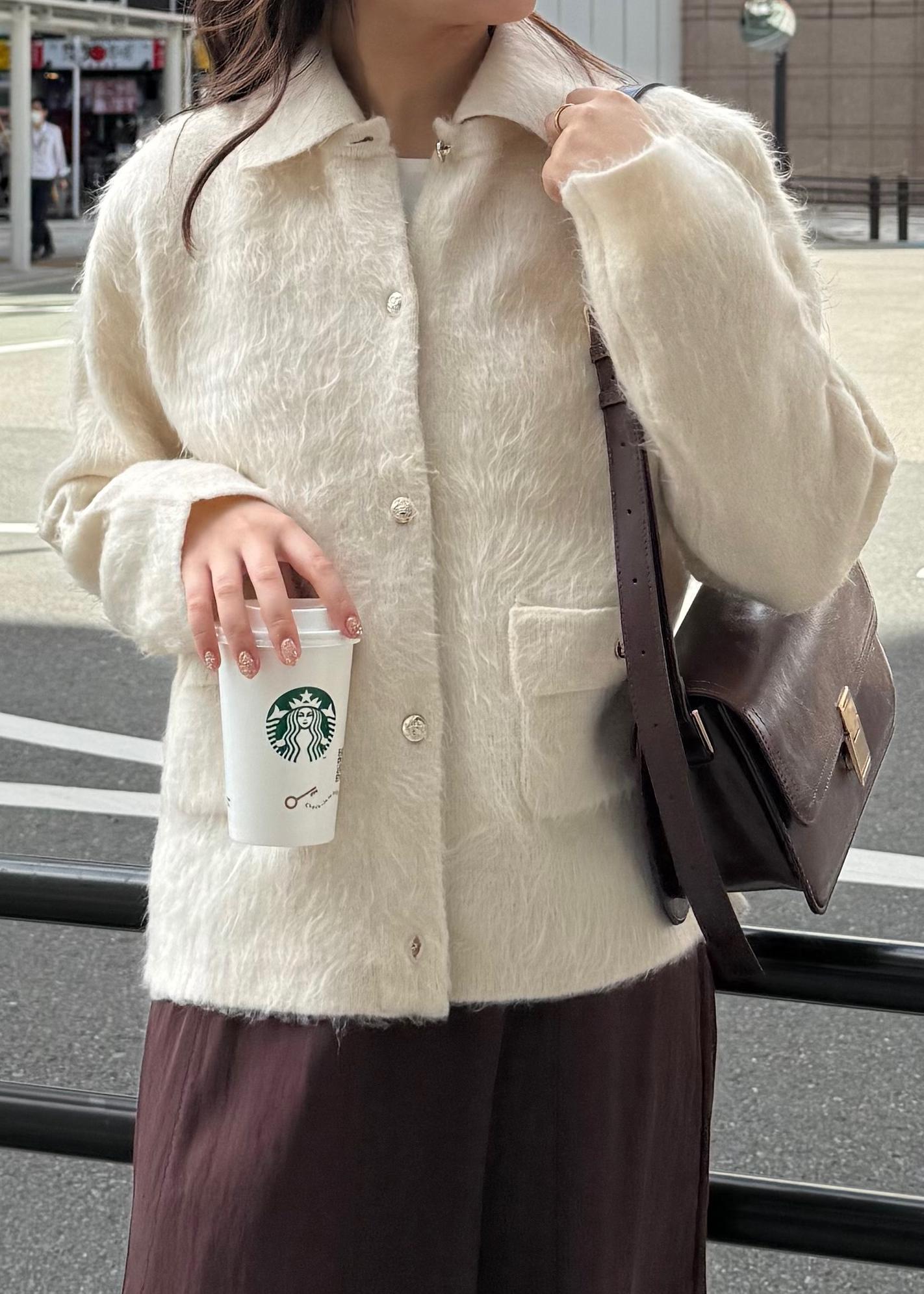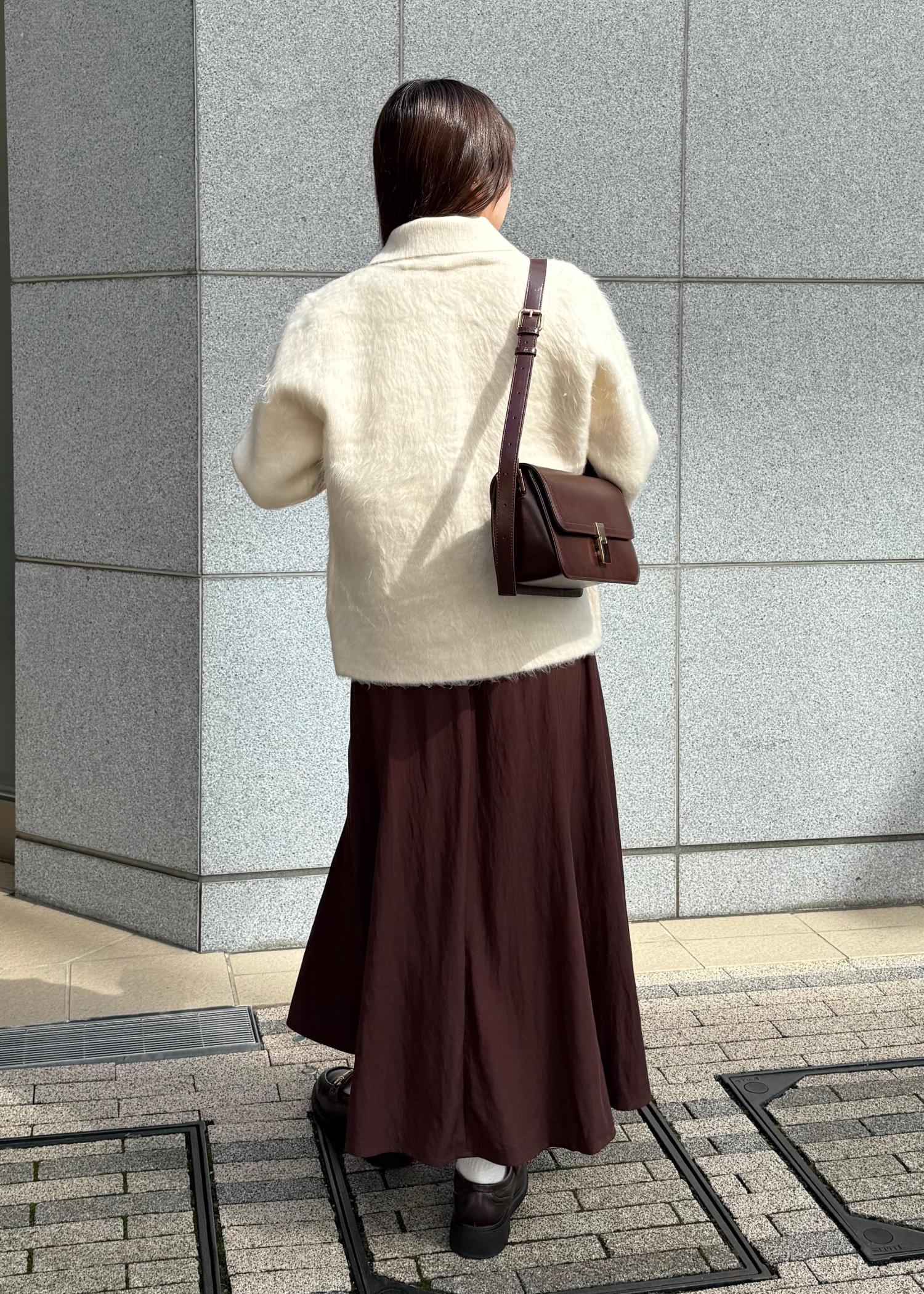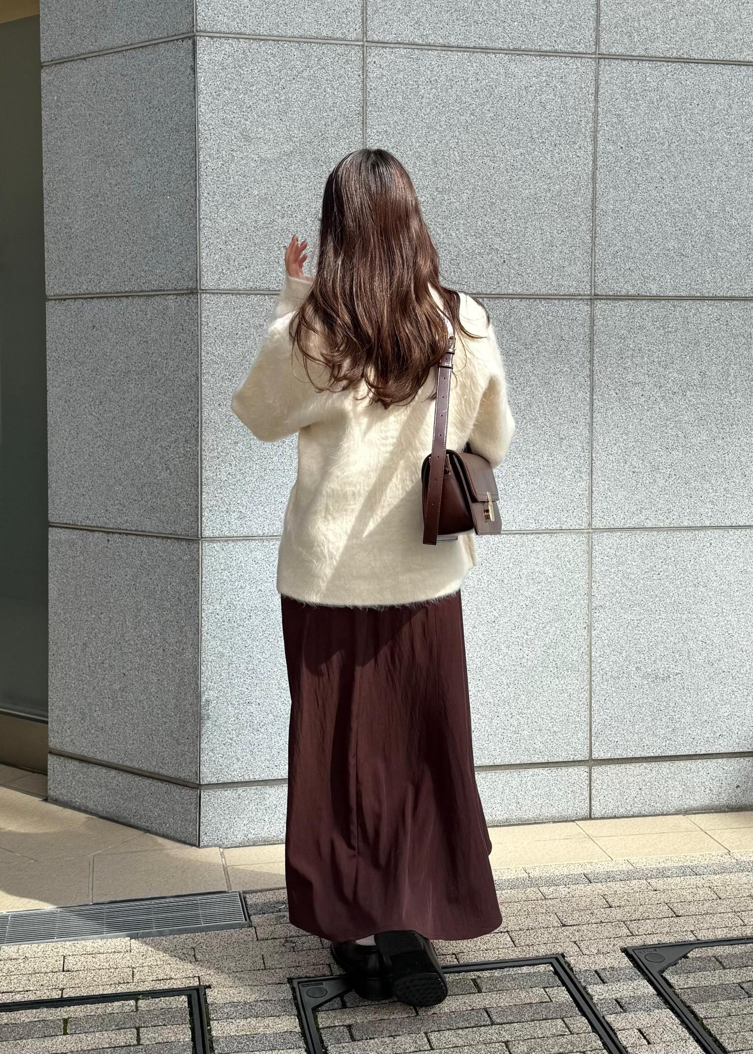 毛足が長めのカーディガンを主役に、フェミニンな雰囲気の秋コーデを組みました。