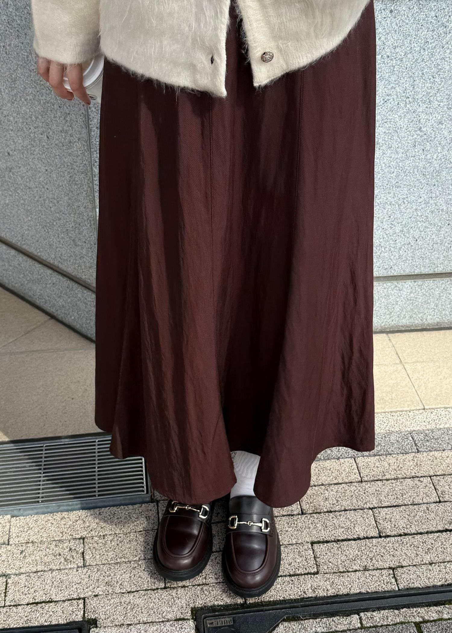 緩やかに広がるスカートが大人見えし、ボルドーの色がよりエレガントな雰囲気を演出してくれます。