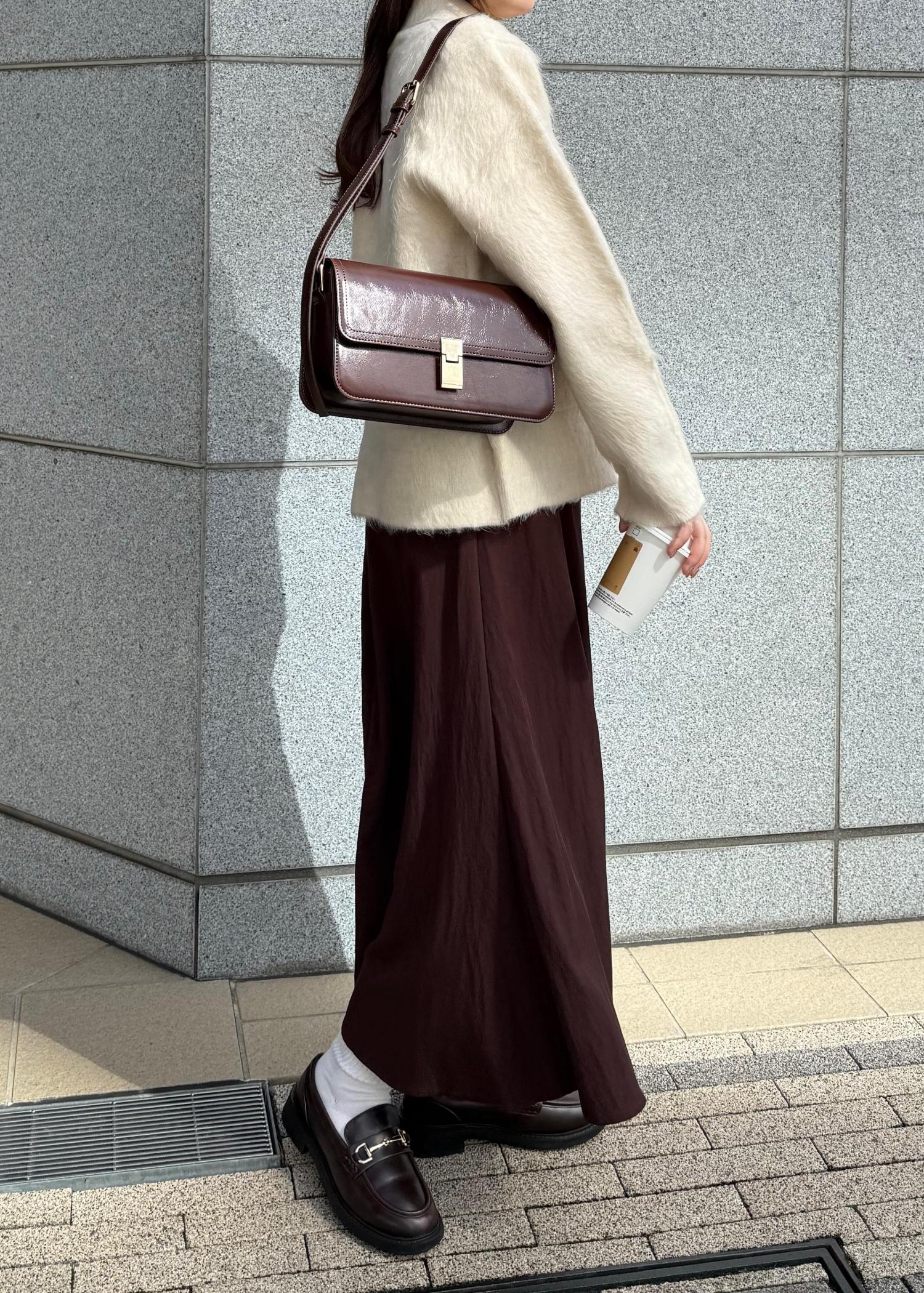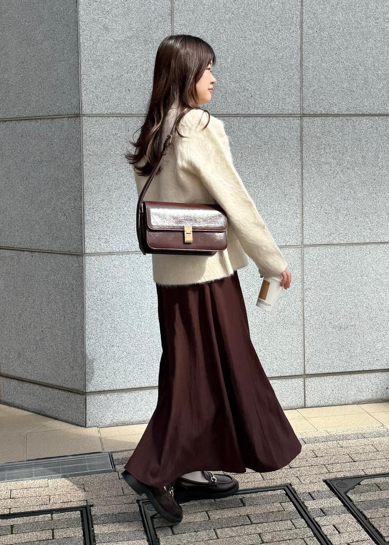 バッグもスカートと似ている色味のものを選び、統一感を出しているのがポイントです。