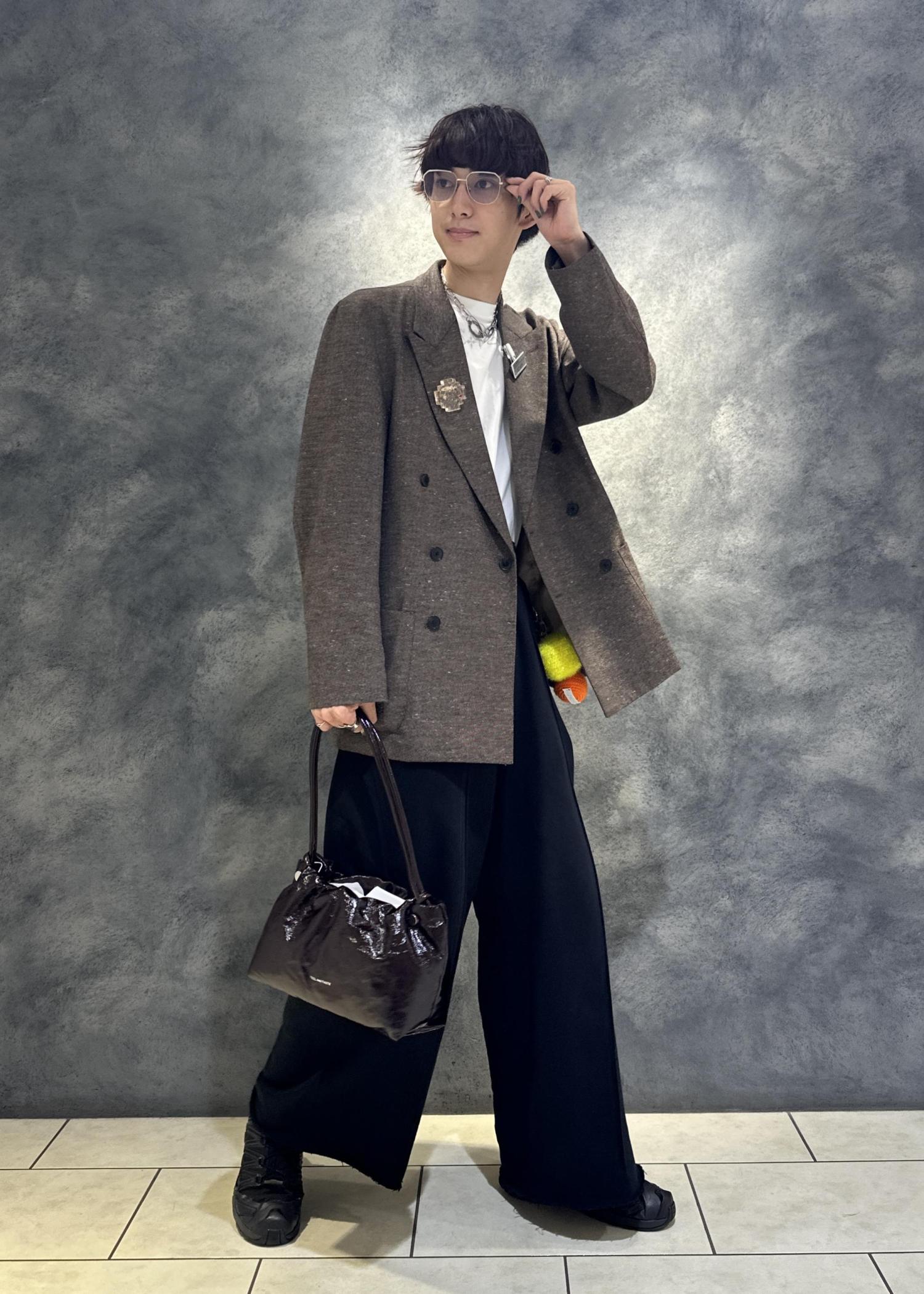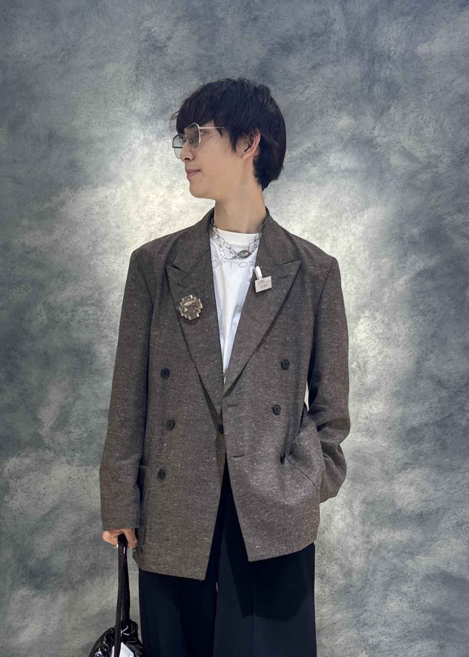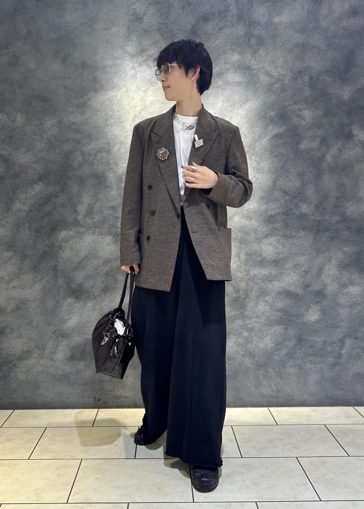 ボックスシルエット、ピークドラペル、ダブルブレストの形でとにかくかっこいいテーラードジャケットです。大きめなので私服使いしやすく、ちょっぴりカジュアルに寄っています。