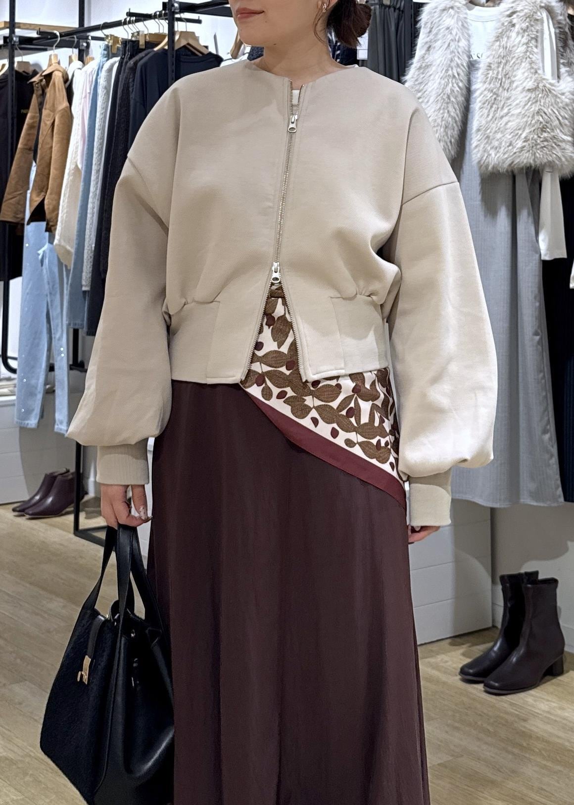 袖口と裾はリブが効いているので、メリハリつけてお召しいただけます。裾はジップを閉めるとフィット感があるのでジップを閉める場合は腰回りすっきりしたものを合わせるのがおすすめです。