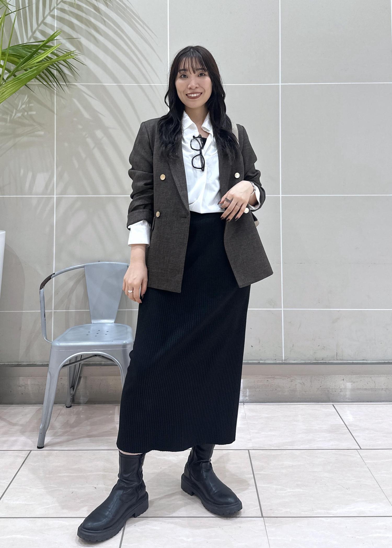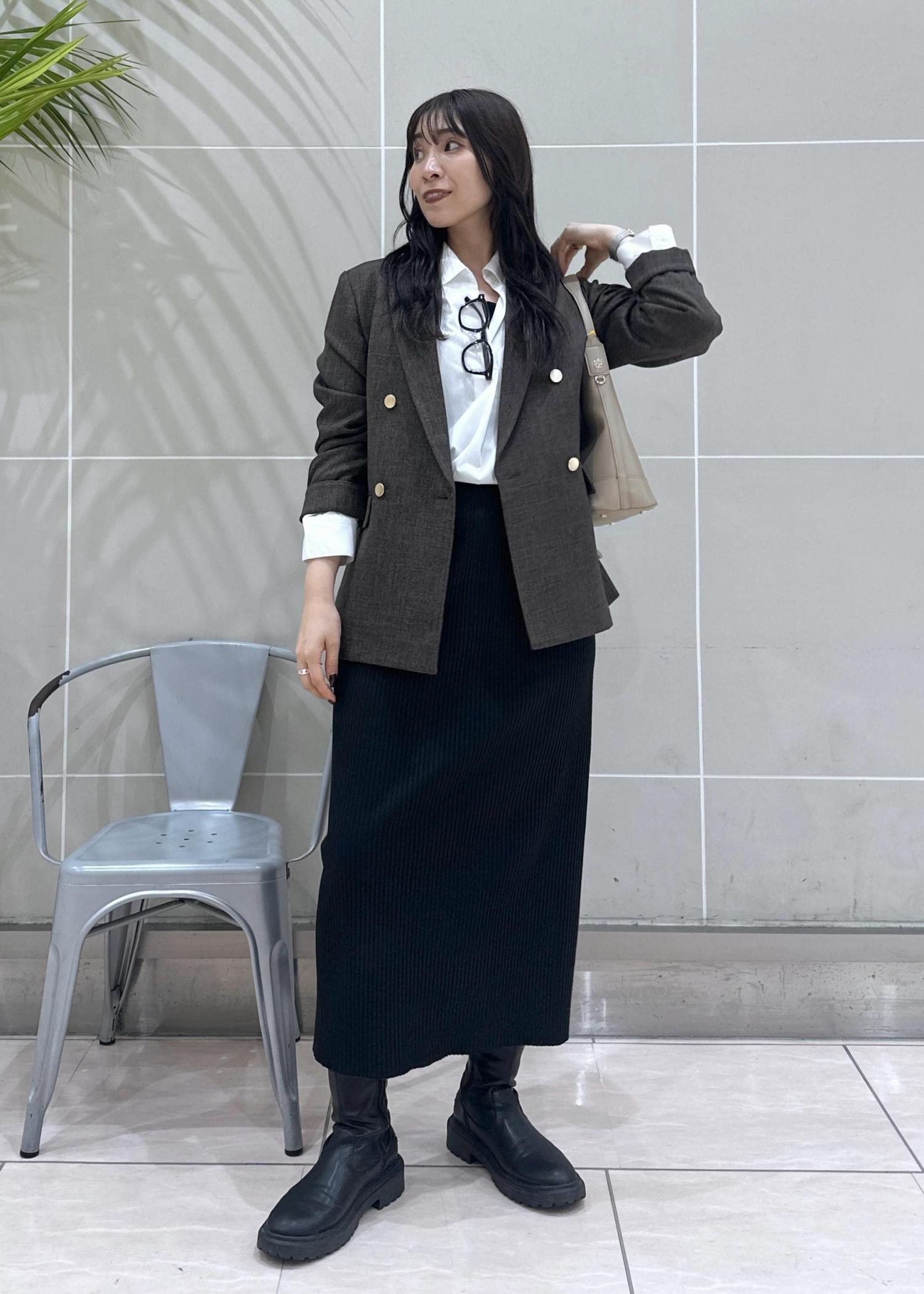 インナーはシャツを合わせてハンサムにスカートでレディ感をプラスしたコーデです。
