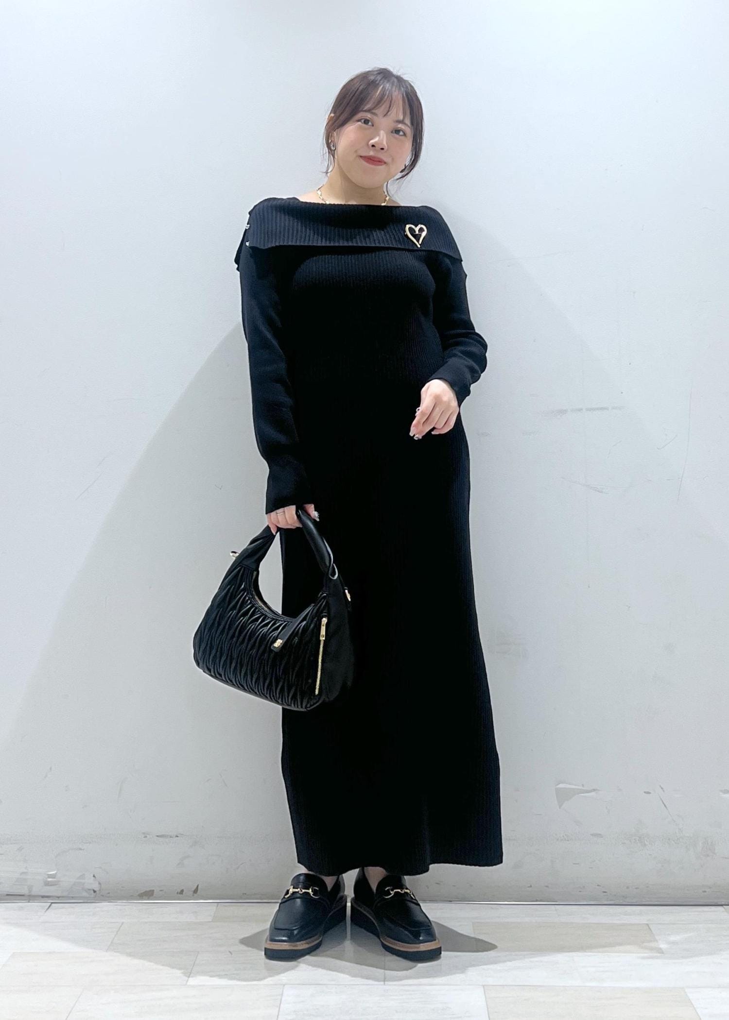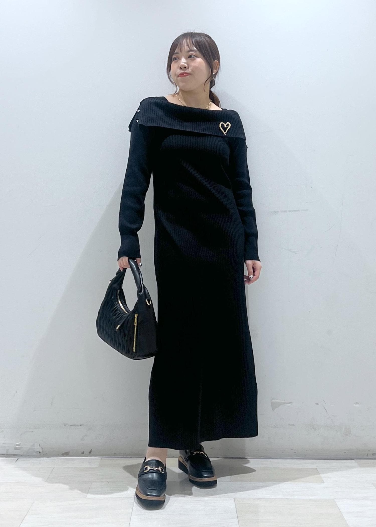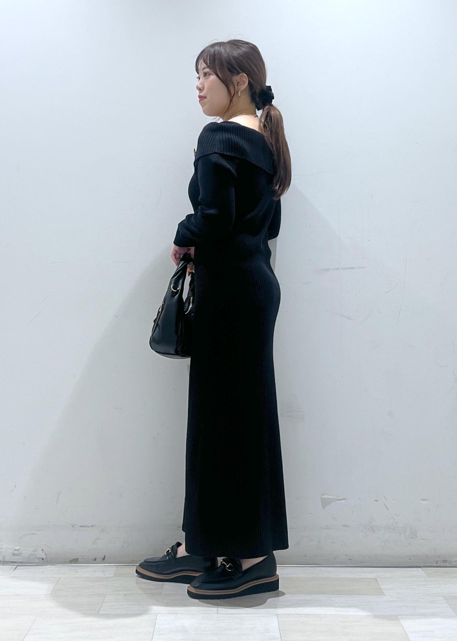 VISアシメオフショルリブニット美シルエットワンピース/着丈が選べるブラック / F¥8,899レビュー中肉のモチっとしたとても着心地のよいニット素材のオフショルデザインワンピース。