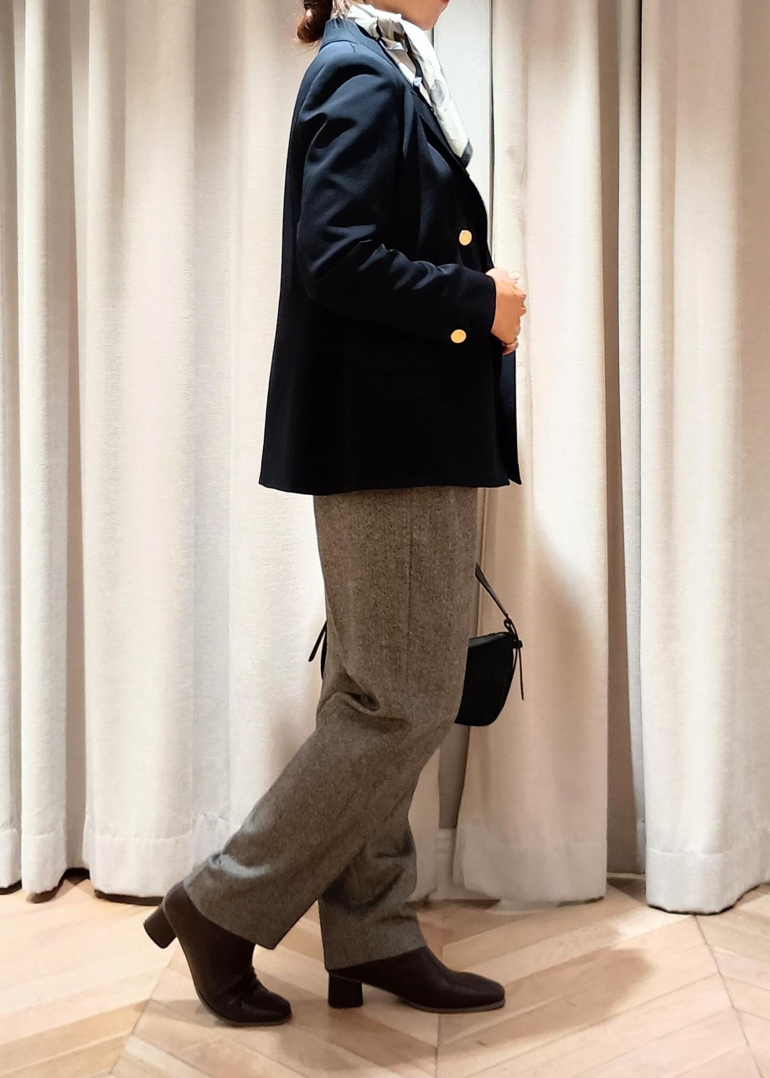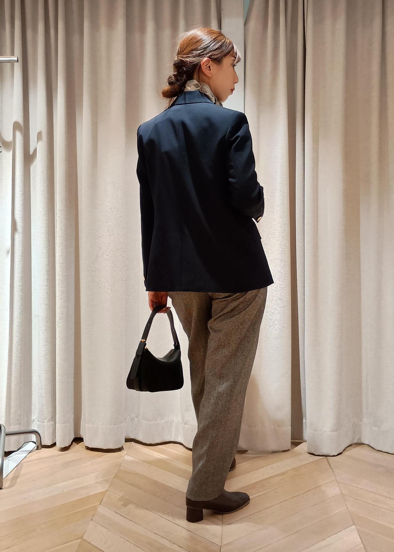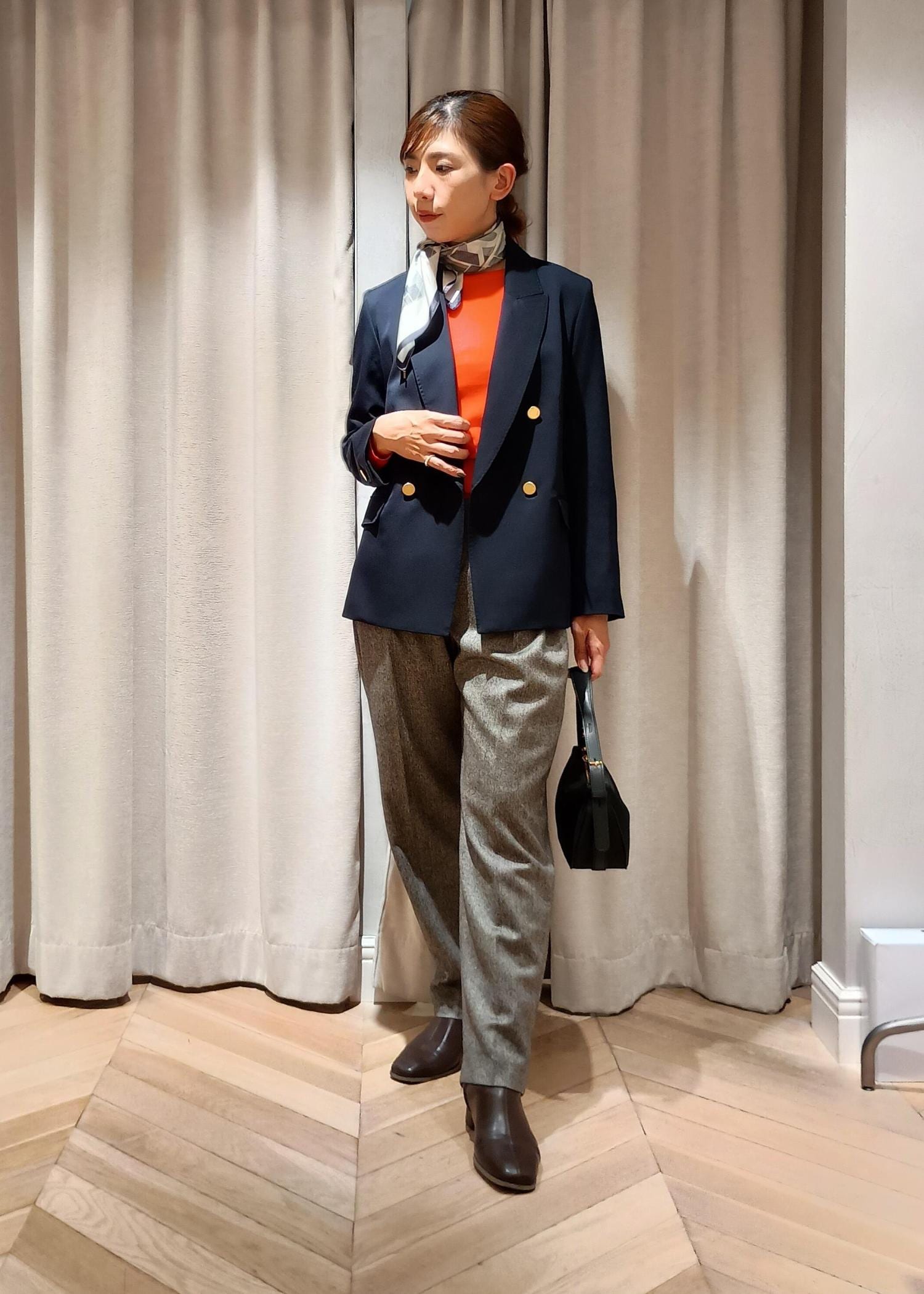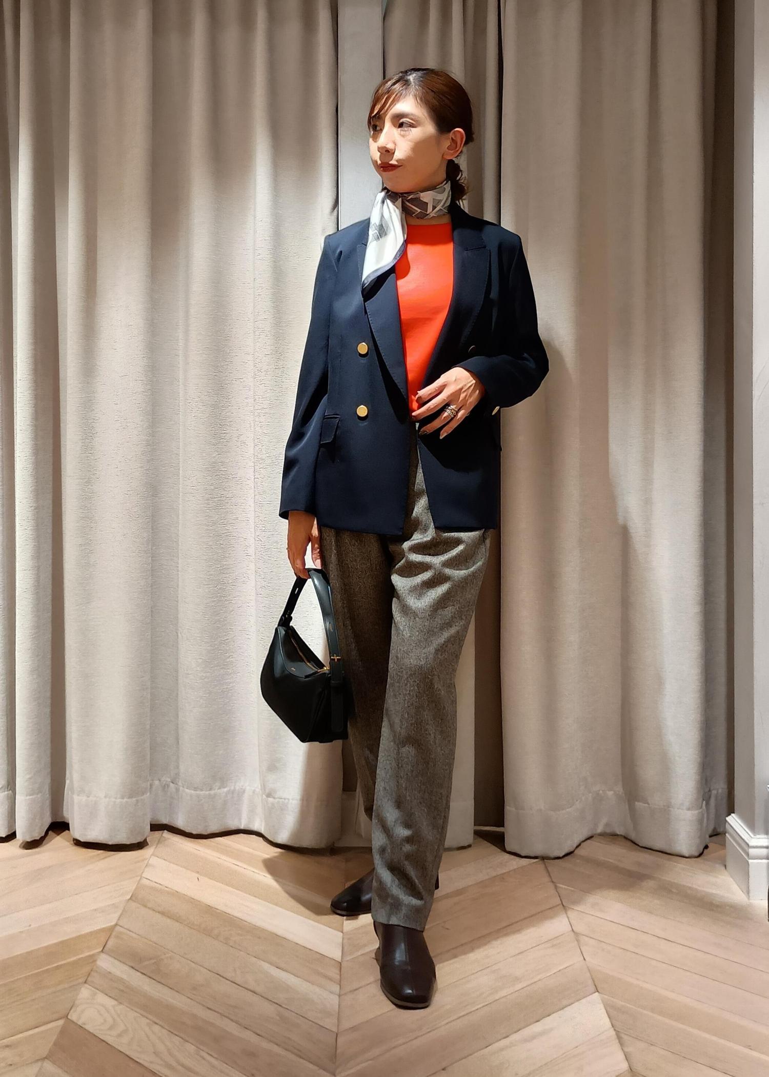 シンプルになりがちなジャケット×パンツのオフィススタイルも、インナートップスに差し色を入れるだけで顔映りが明るくなりグッと印象がUPします!着やすさとスタイルアップを兼ね備えた、お仕事にもお出かけにもオススメのキレイめスタイルです。
