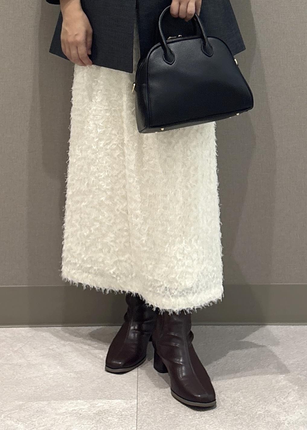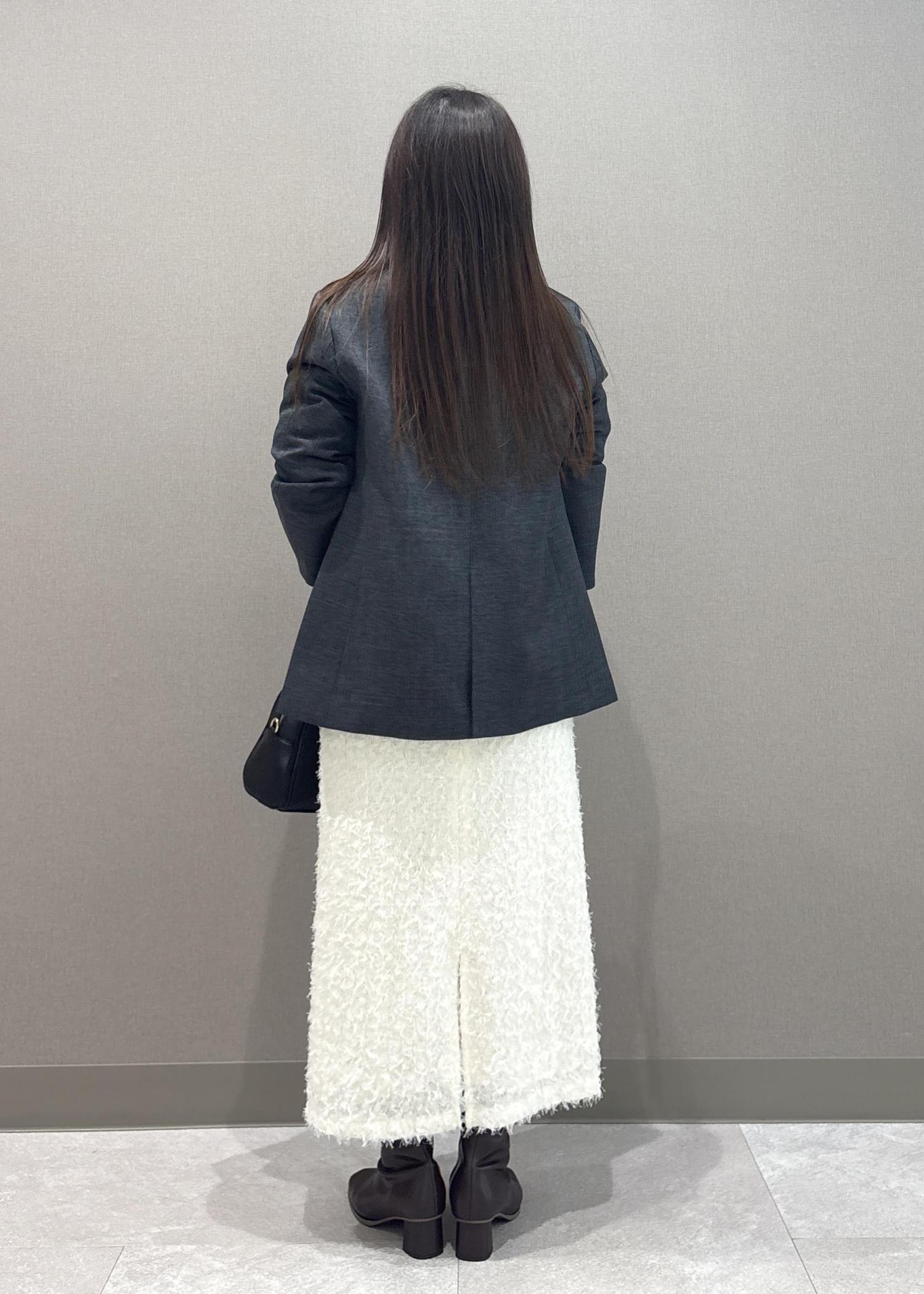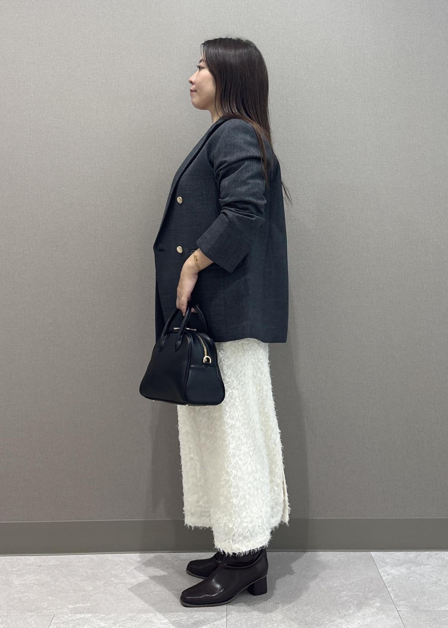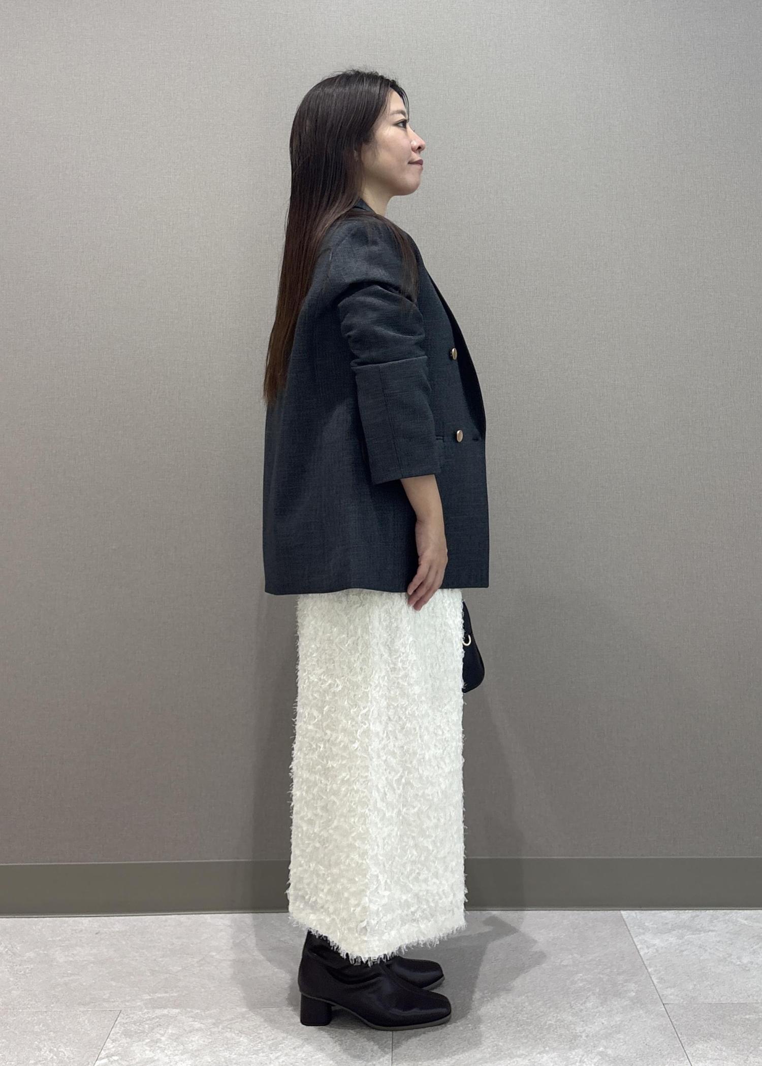 スカートを合わせて、ジャケットスタイリングを女性らしい感じに着こなしました。