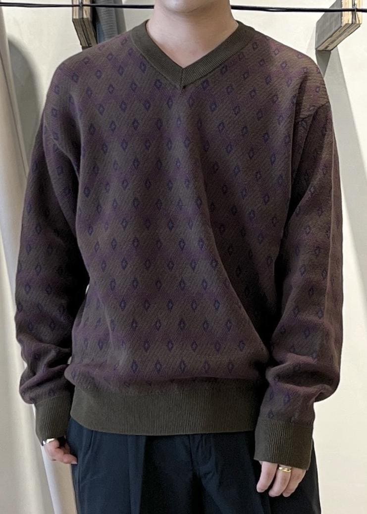 クラシックなパターンの小紋柄を馴染みの配色で表現したダブルジャカードのVネックニットは秋らしいカラーでこれからの時期に丁度良いアイテムとなっております◎