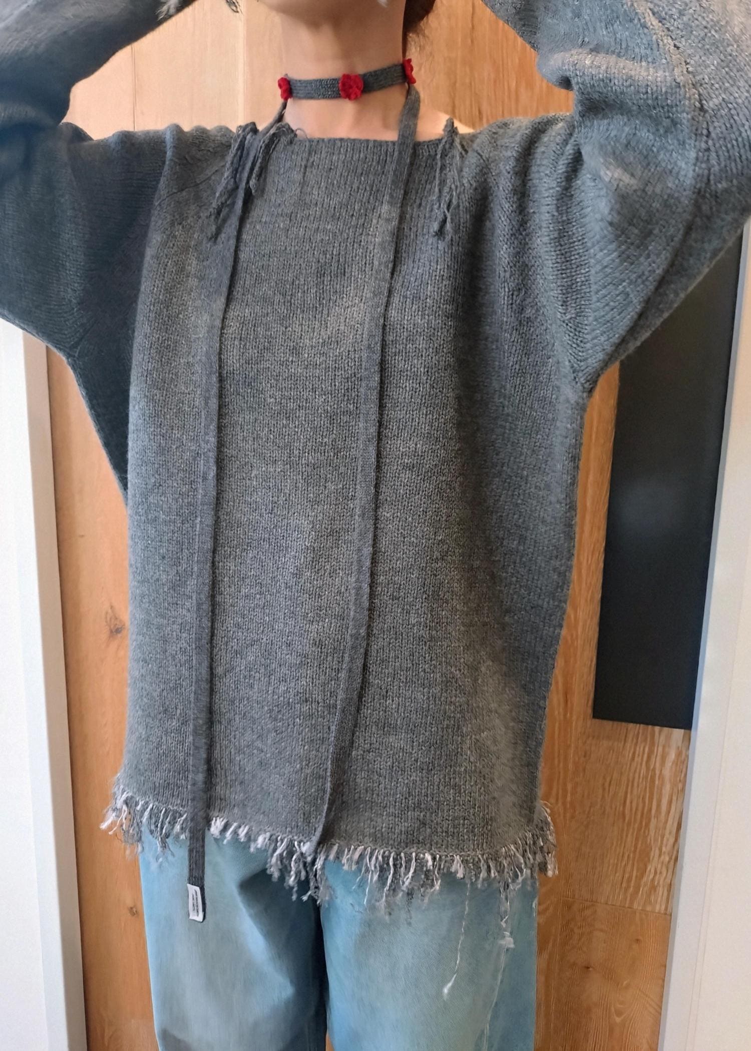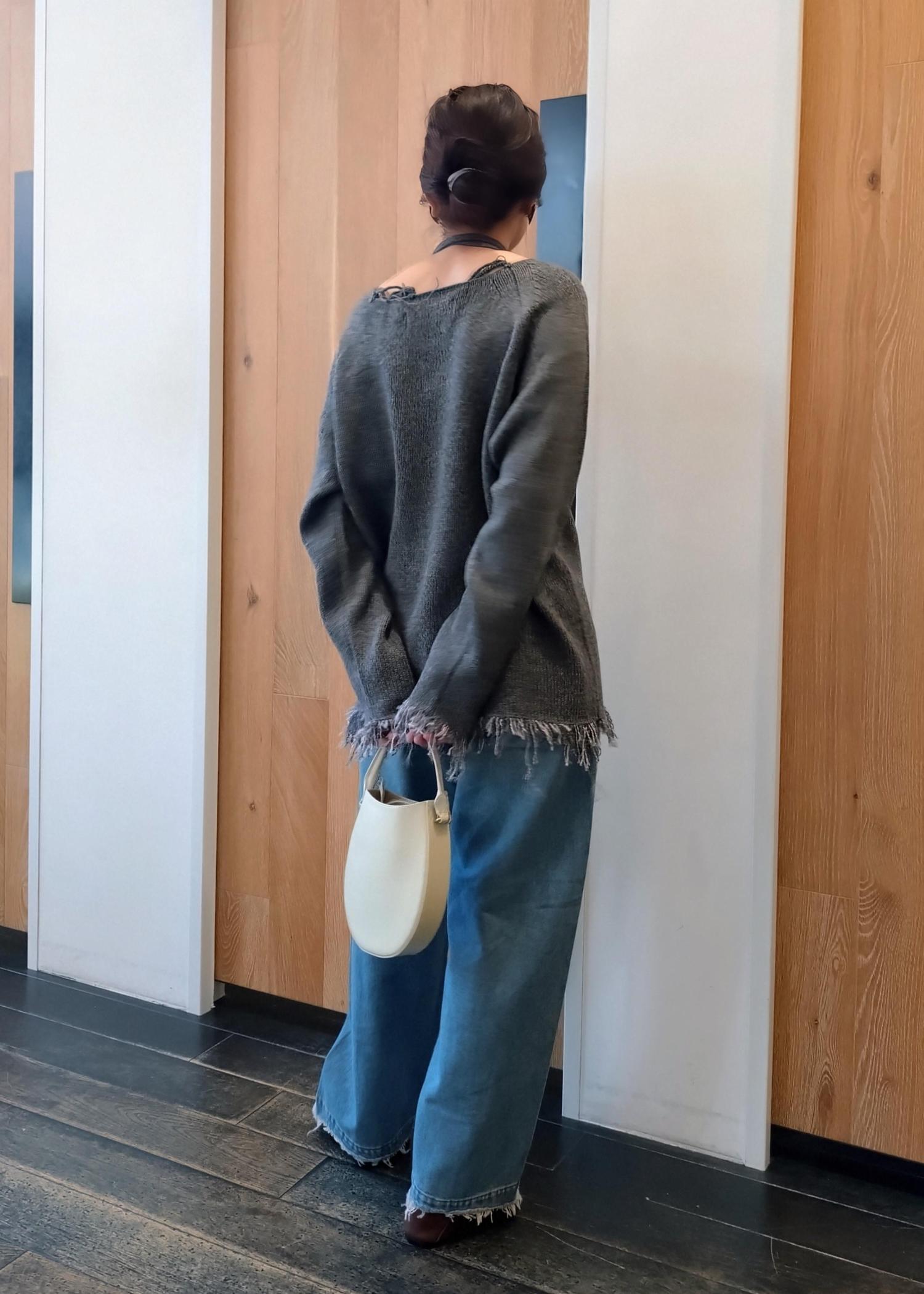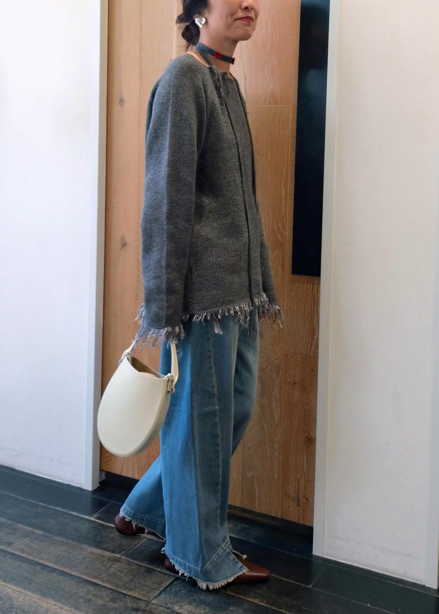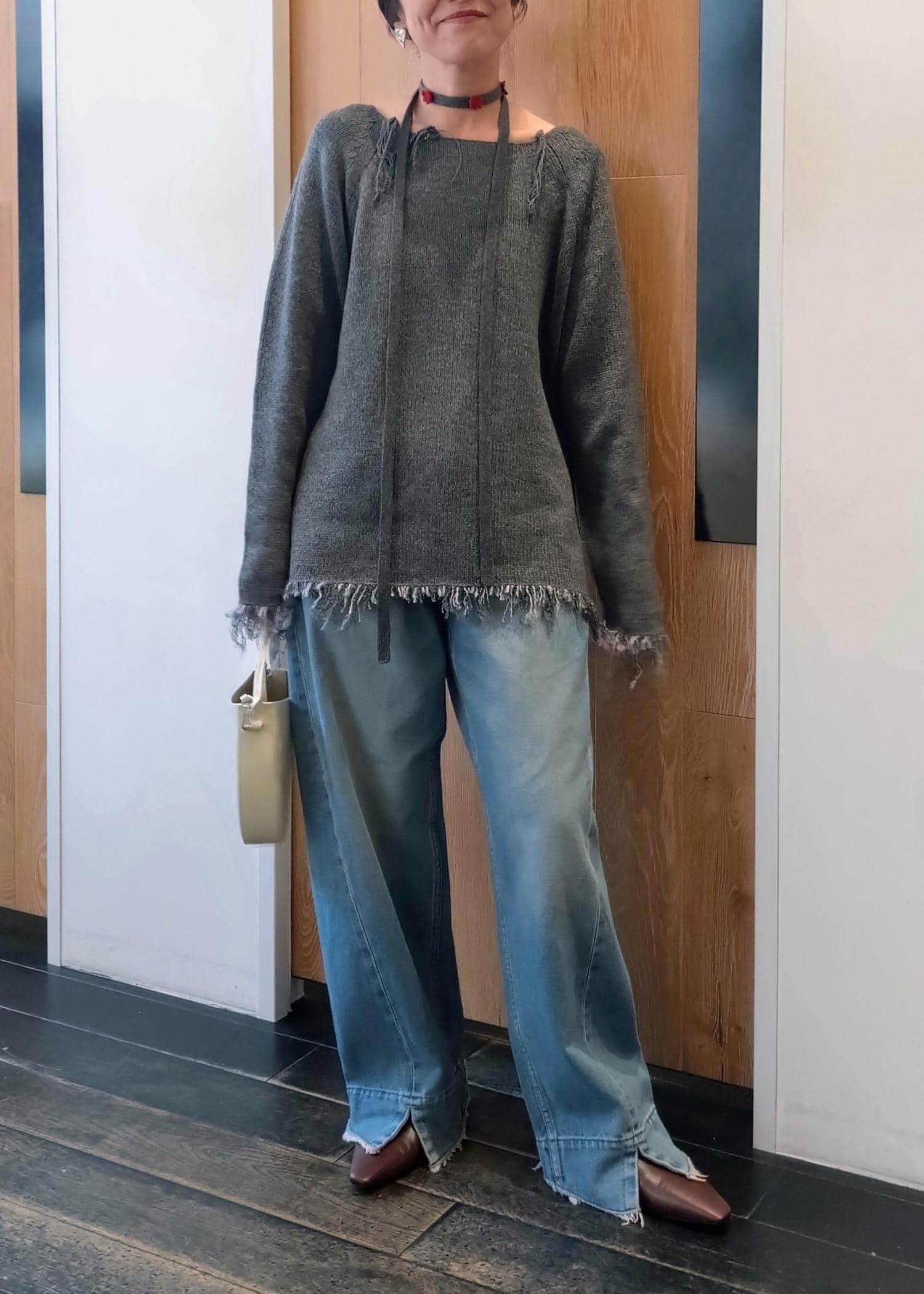 裾と袖口は切りっぱなしのフリンジのようになっているデザインのKnit。