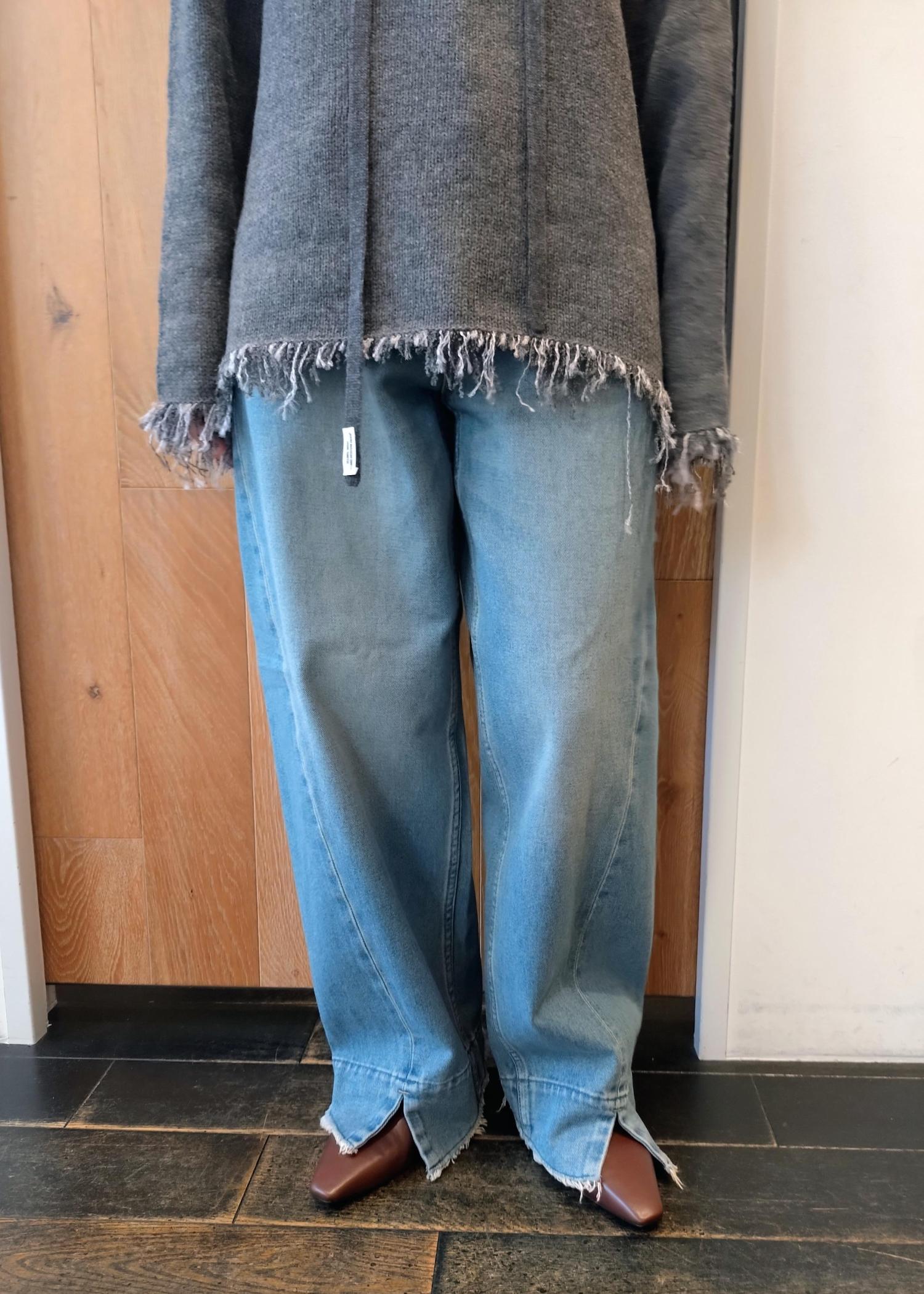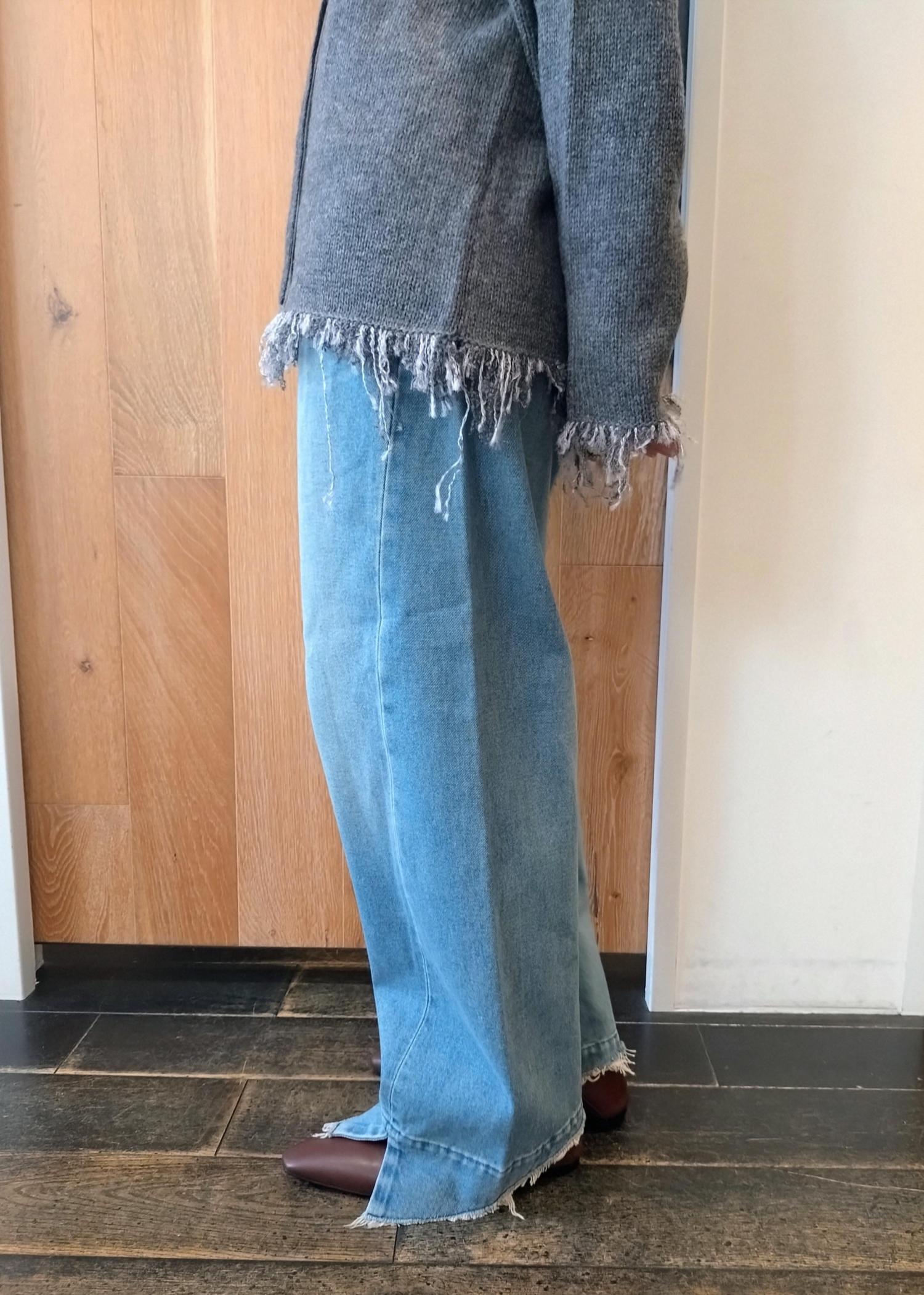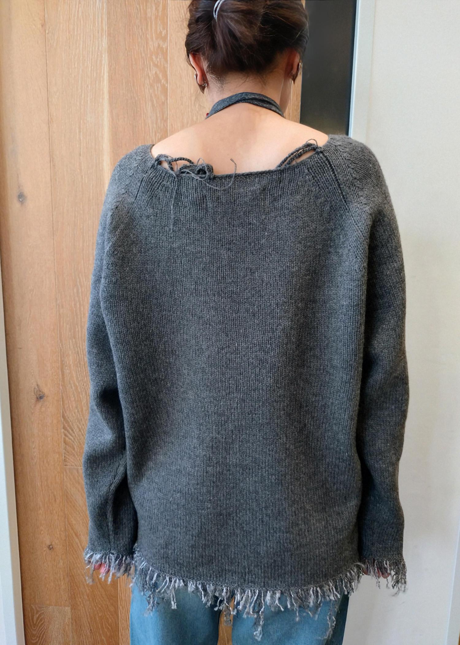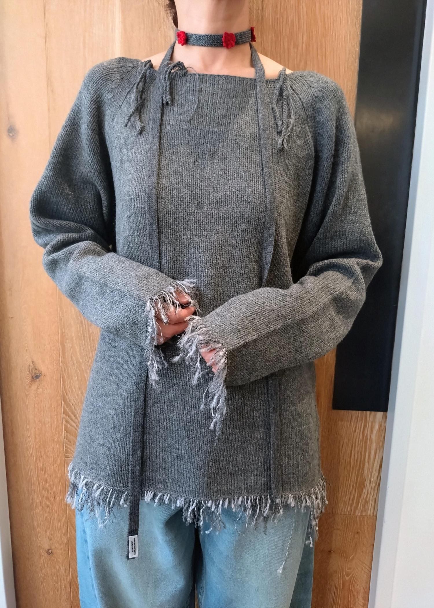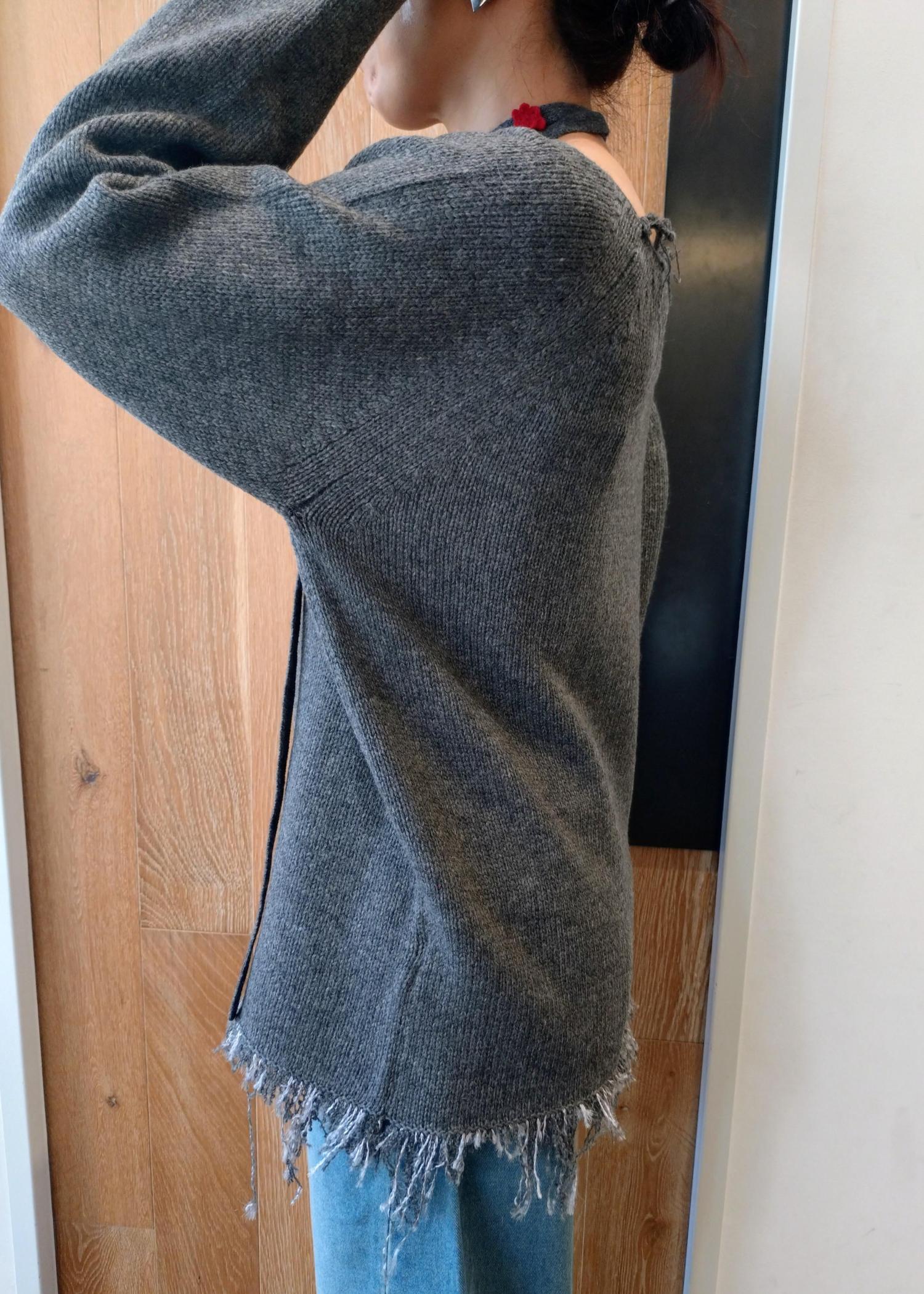 裾と袖口は切りっぱなしのフリンジのようになっているデザインのKnit。
