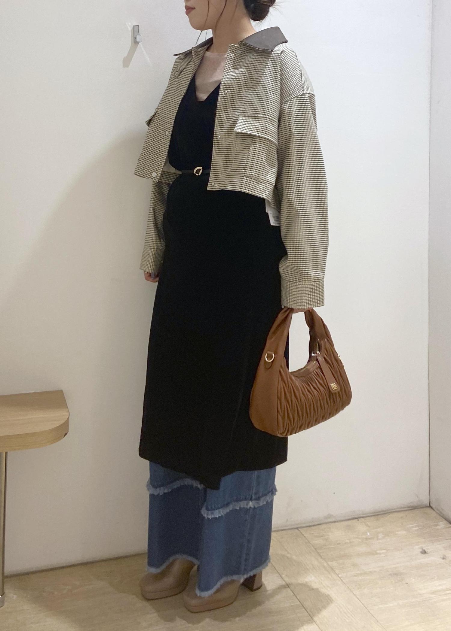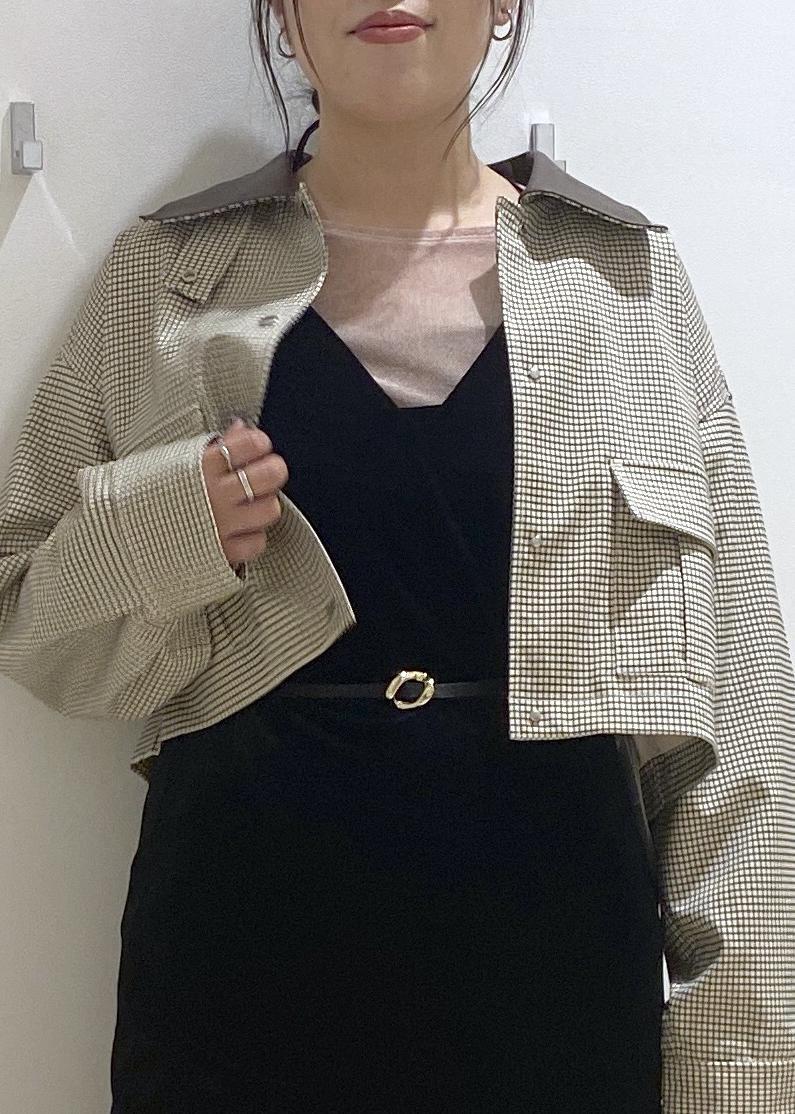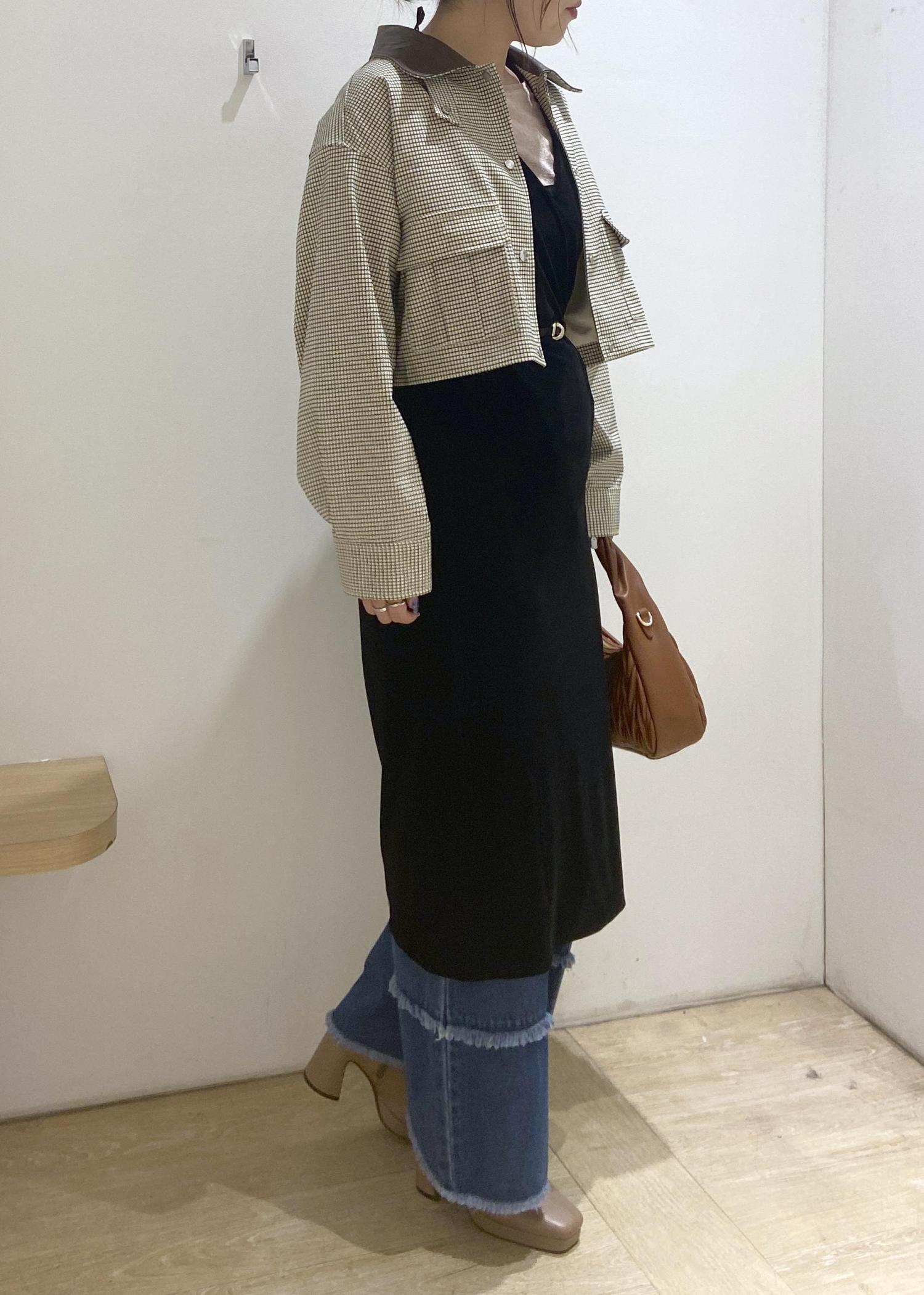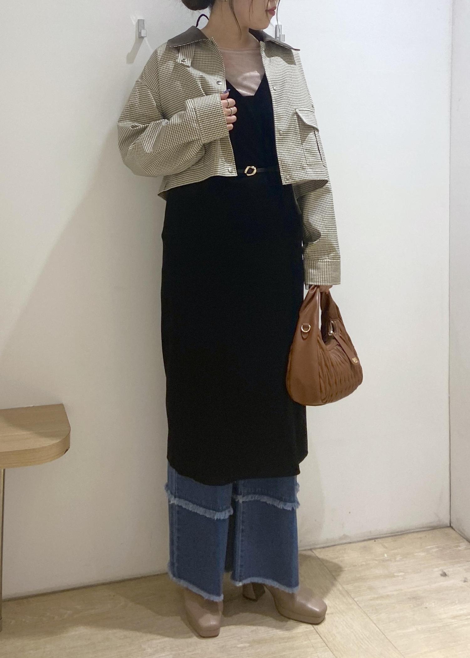 ワンピースとレイヤードなので、ショート丈アウターとベルトでウエスト位置を高く見えるようにしました。
