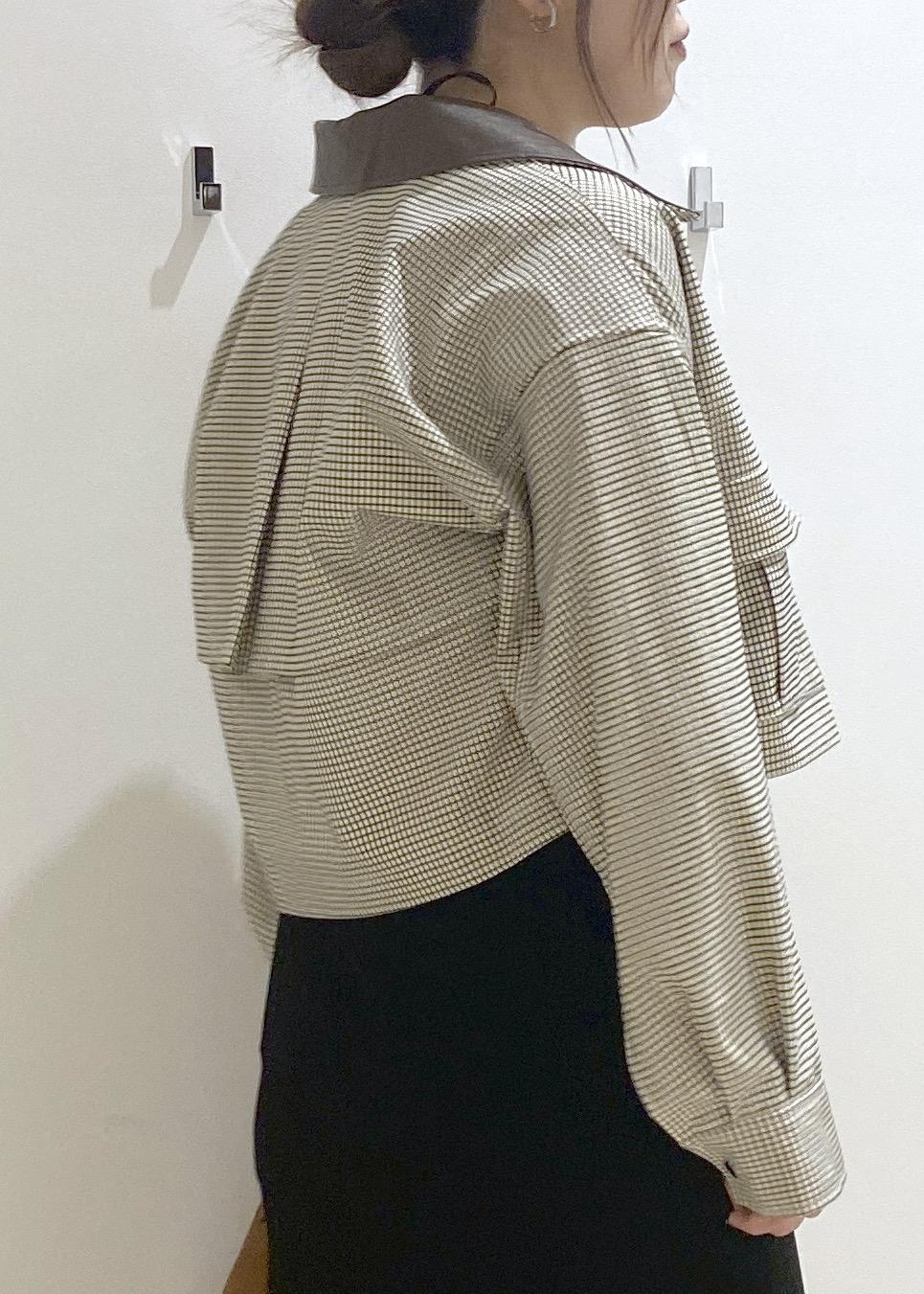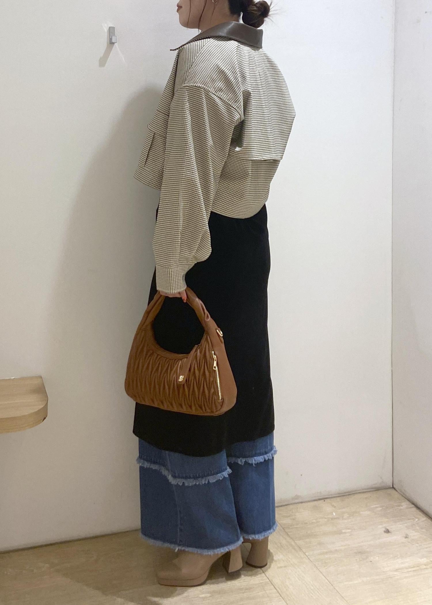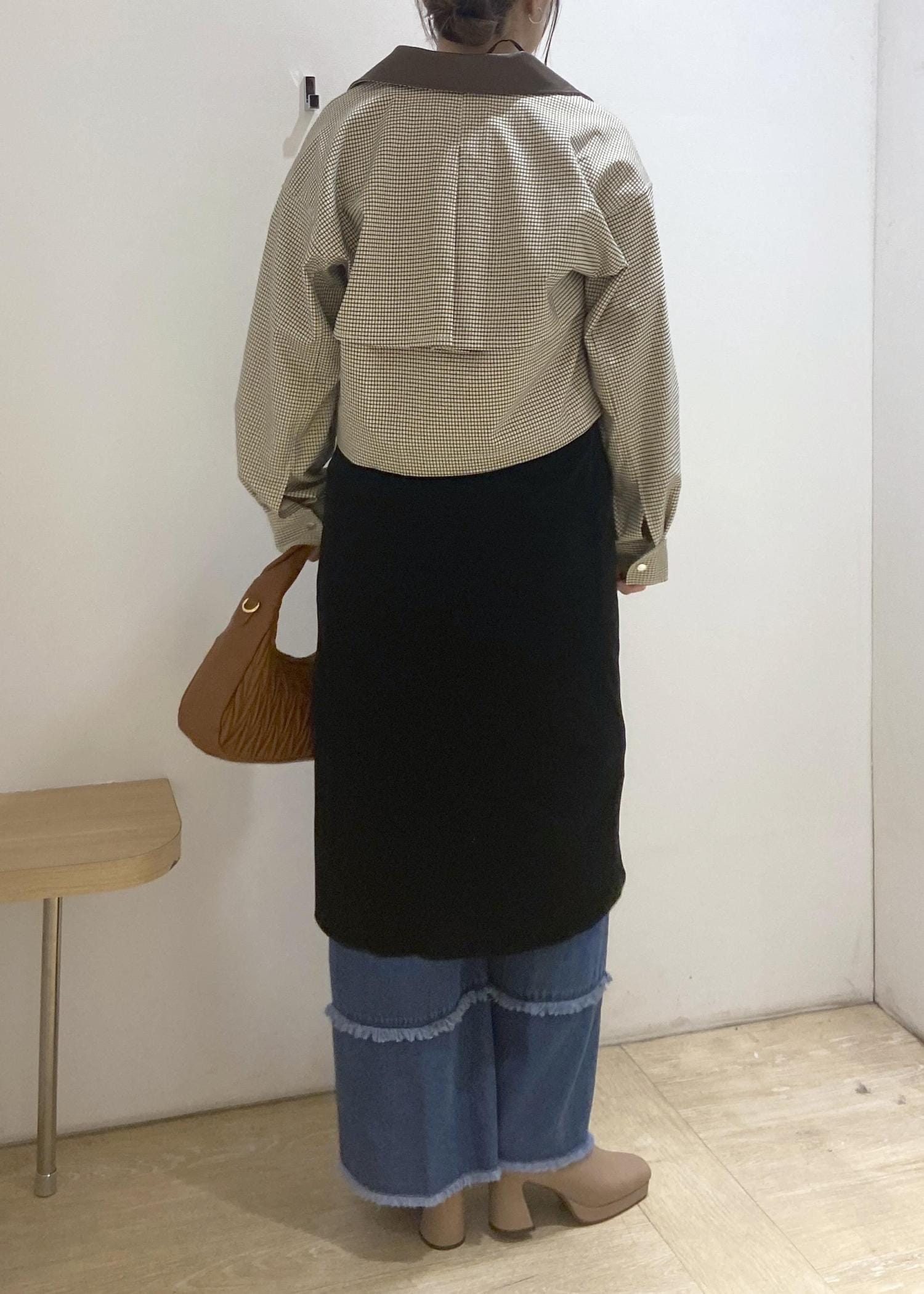 ワンピースとレイヤードなので、ショート丈アウターとベルトでウエスト位置を高く見えるようにしました。