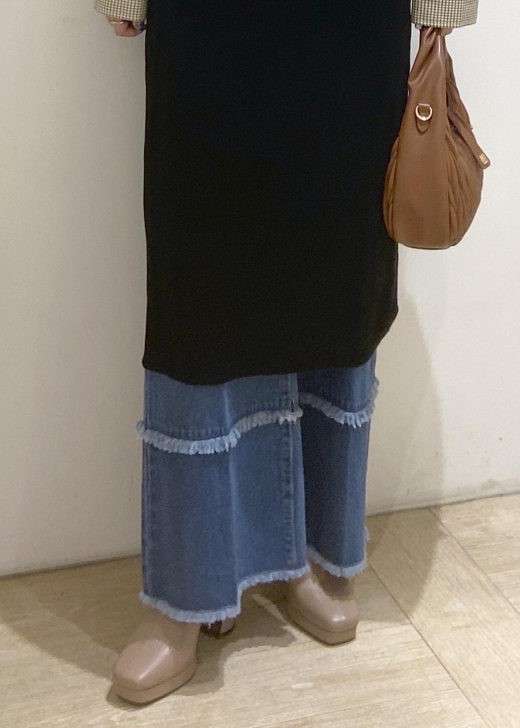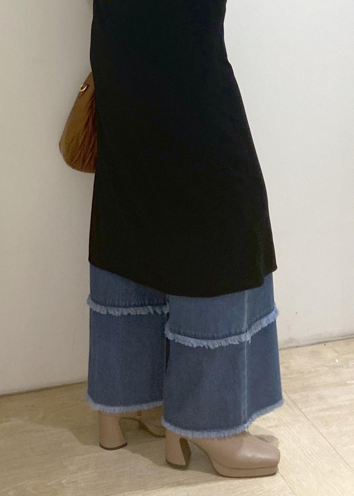 広がりすぎないシルエットなので、脚がすらっと見えやすいです。 -