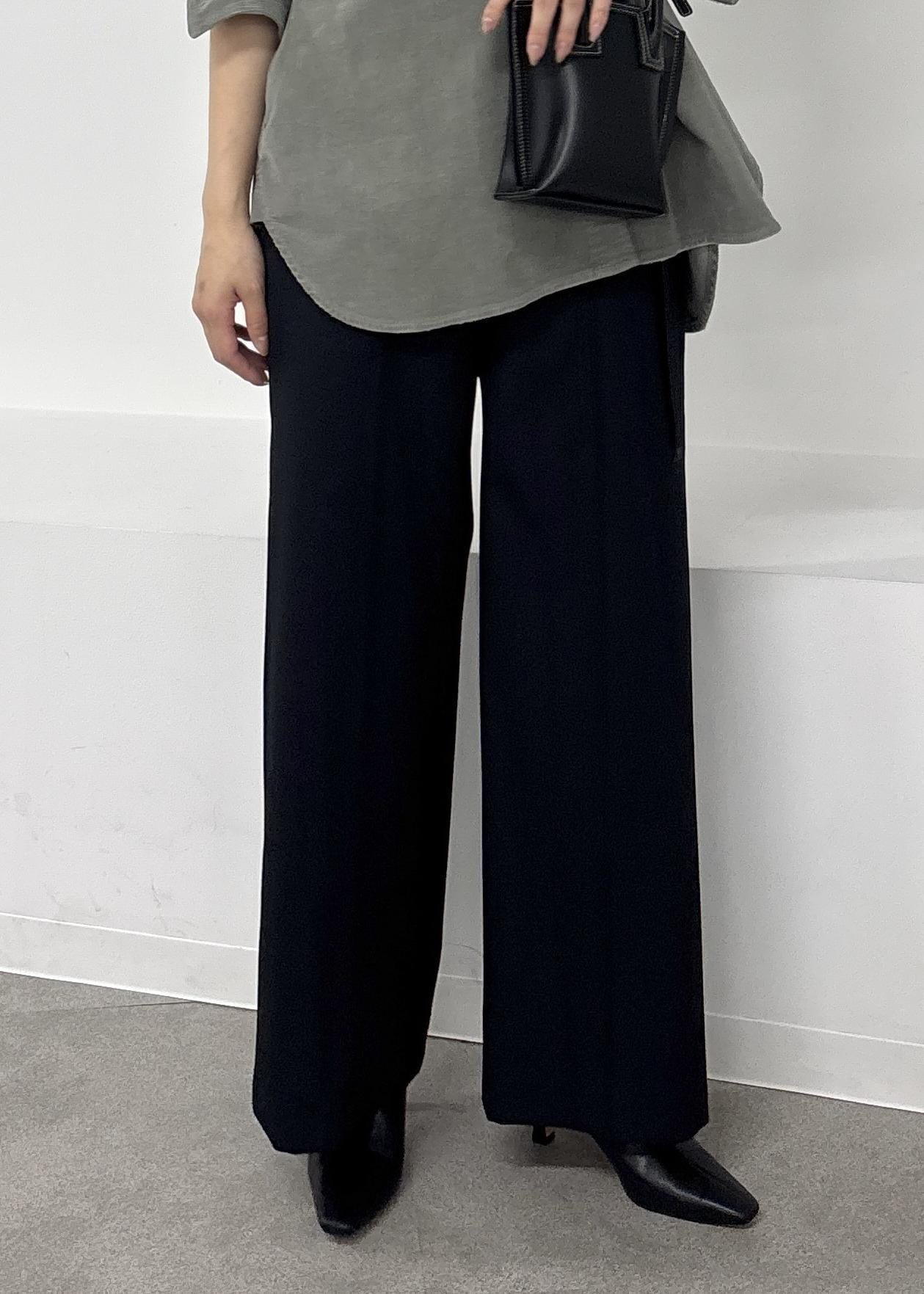 ROPÉ梳毛ギャバ プリーテッド ワイドパンツブラック / 38¥29,700レビュータック無しのシルエットが綺麗なパンツ。ウール100%で暖かい着心地かつ、表面は起毛感無く肌あたりも滑らかです。程よく艶感もありシーズンの幅も広く合わせられると感じました。全体のサイズ感はジャスト。ウエストは後ろ側のみゴムで前側はぴしっと見え。骨盤が広めの体型ですが窮屈感は無く、着丈は私の身長でかかとから1cmほど上あたり。