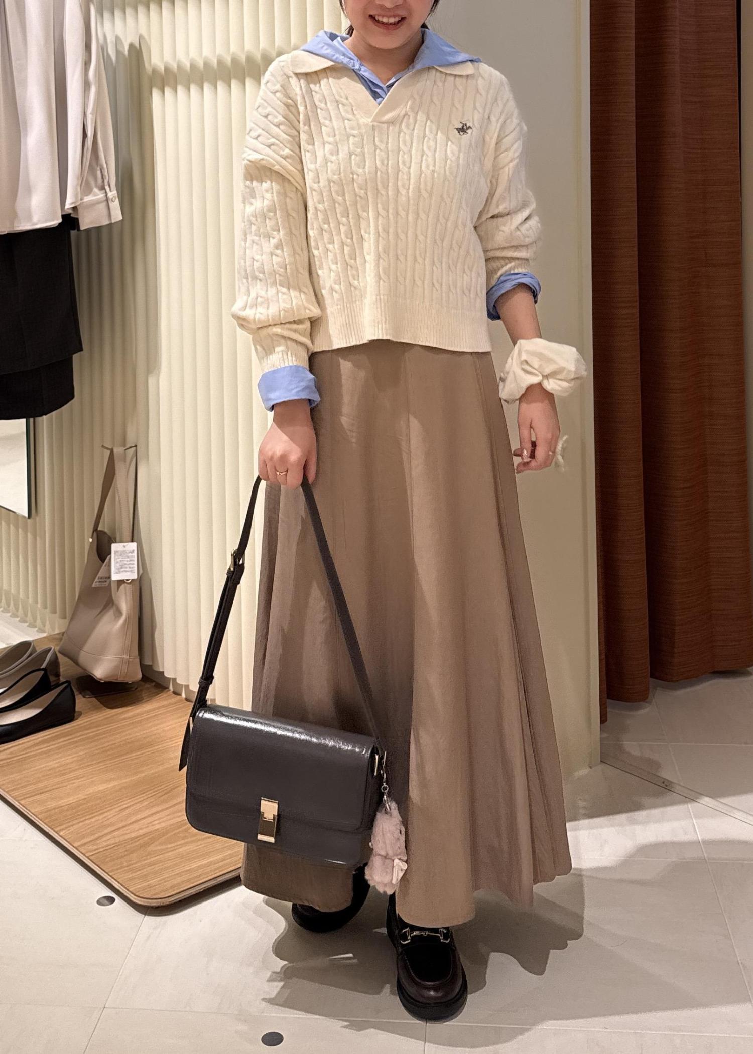 大人見えする、マットな質感のスカートを合わせ、大人も取り入れやすいコーディネートを意識。