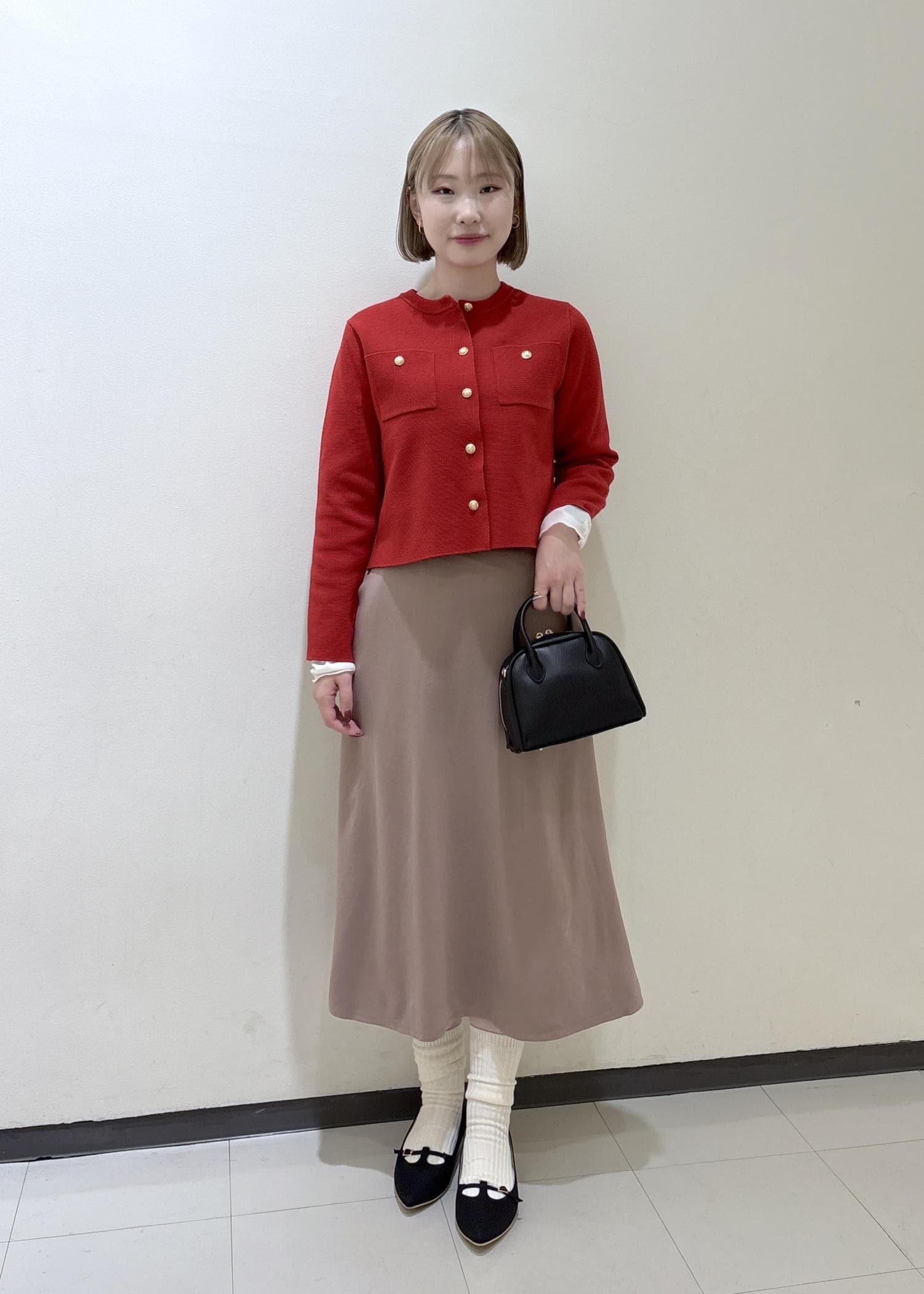 赤のカーディガンがポイントのコーディネートです。