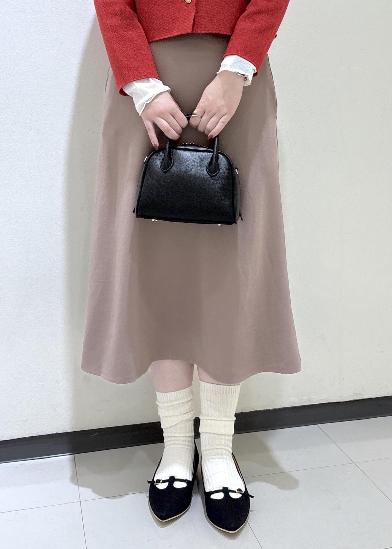 ベージュのスカートと合わせて柔らかい印象にしました。