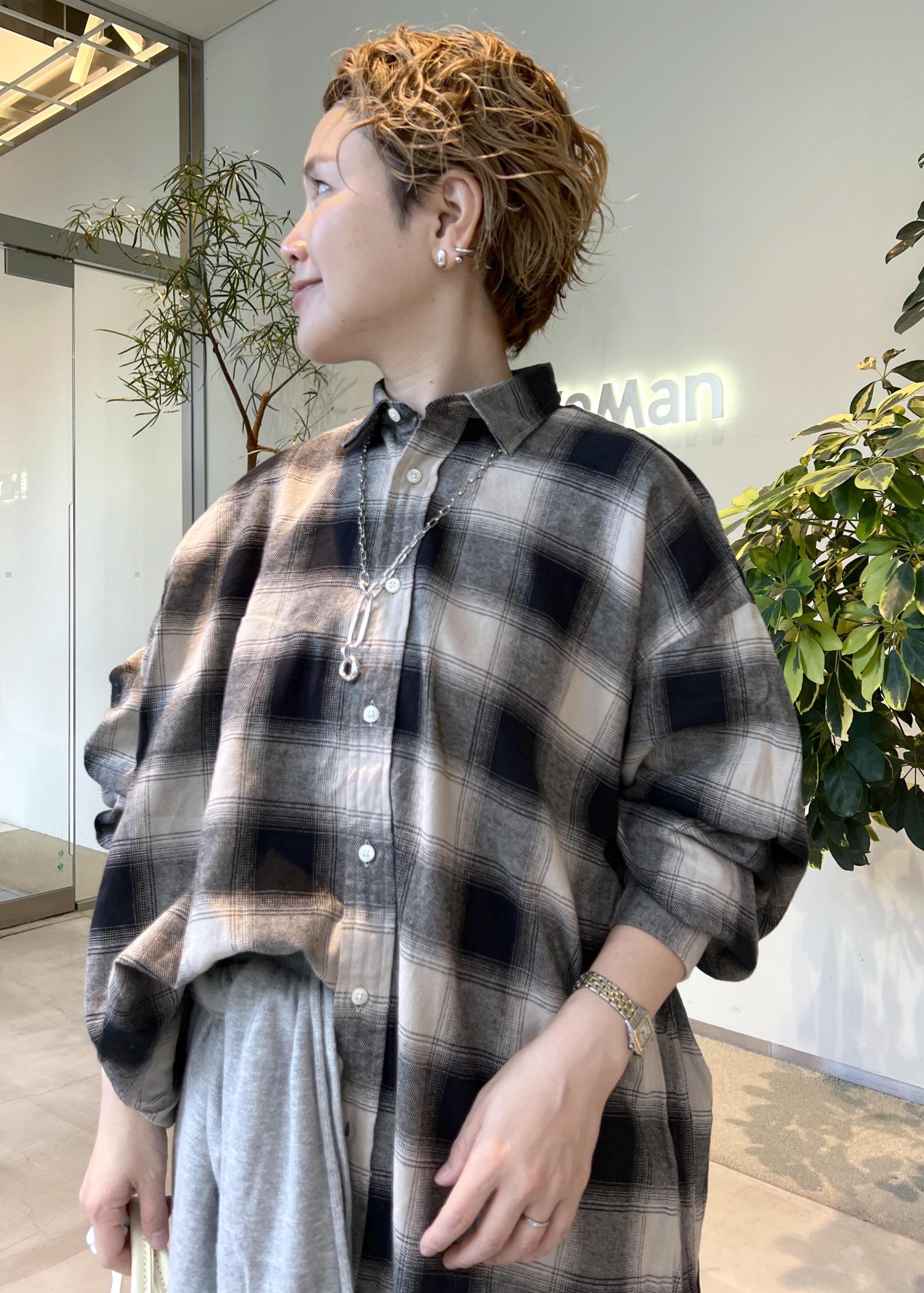 かなりオーバーサイズのシャツ。袖幅、身幅、着丈共にゆったりしたシルエットです。
