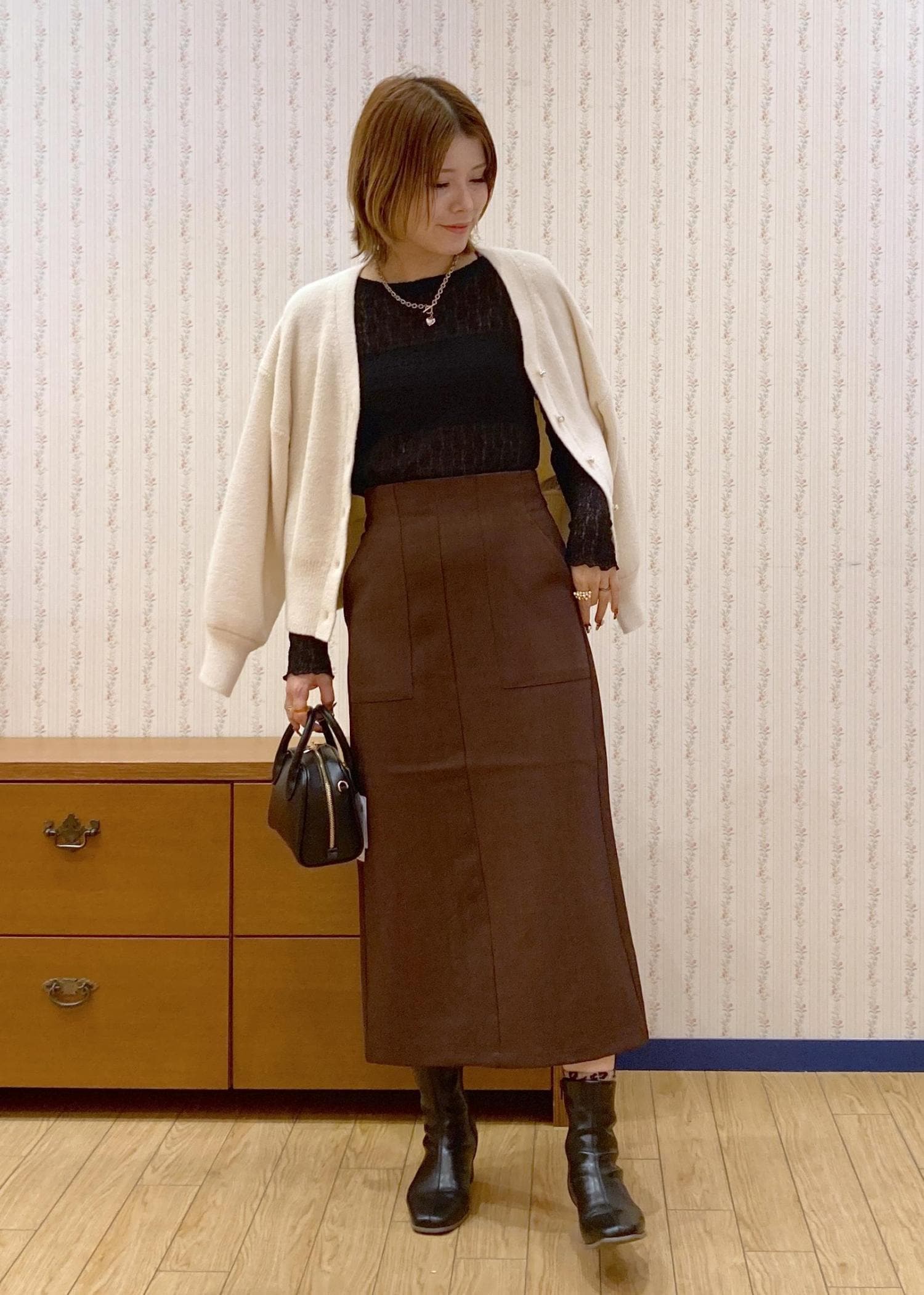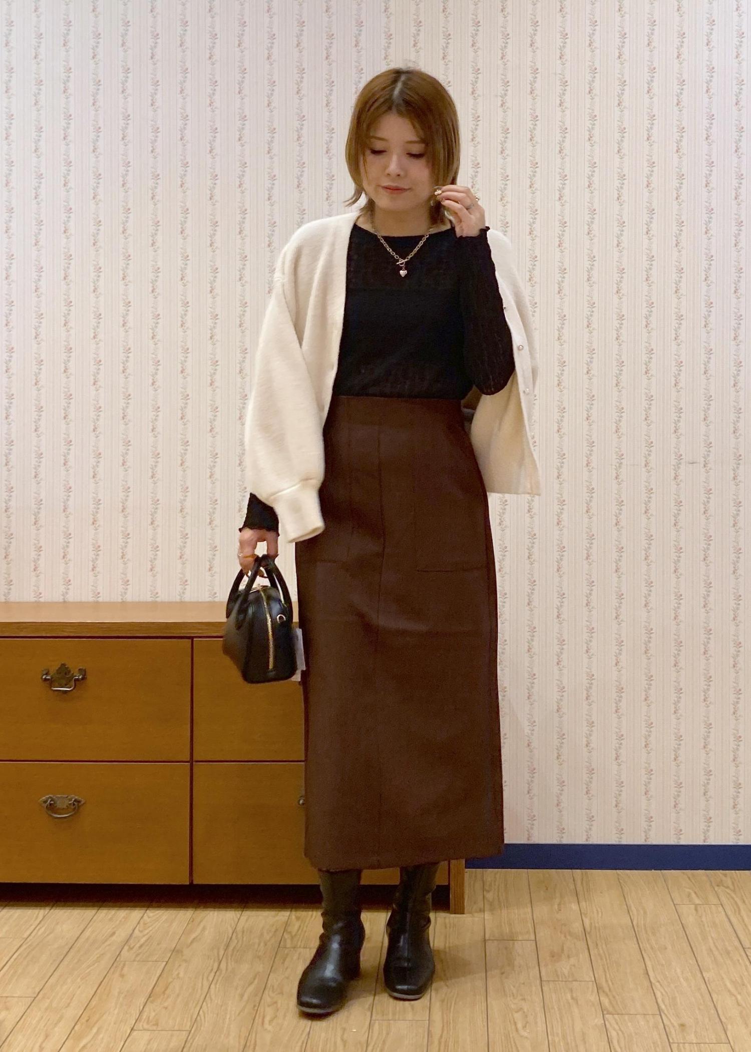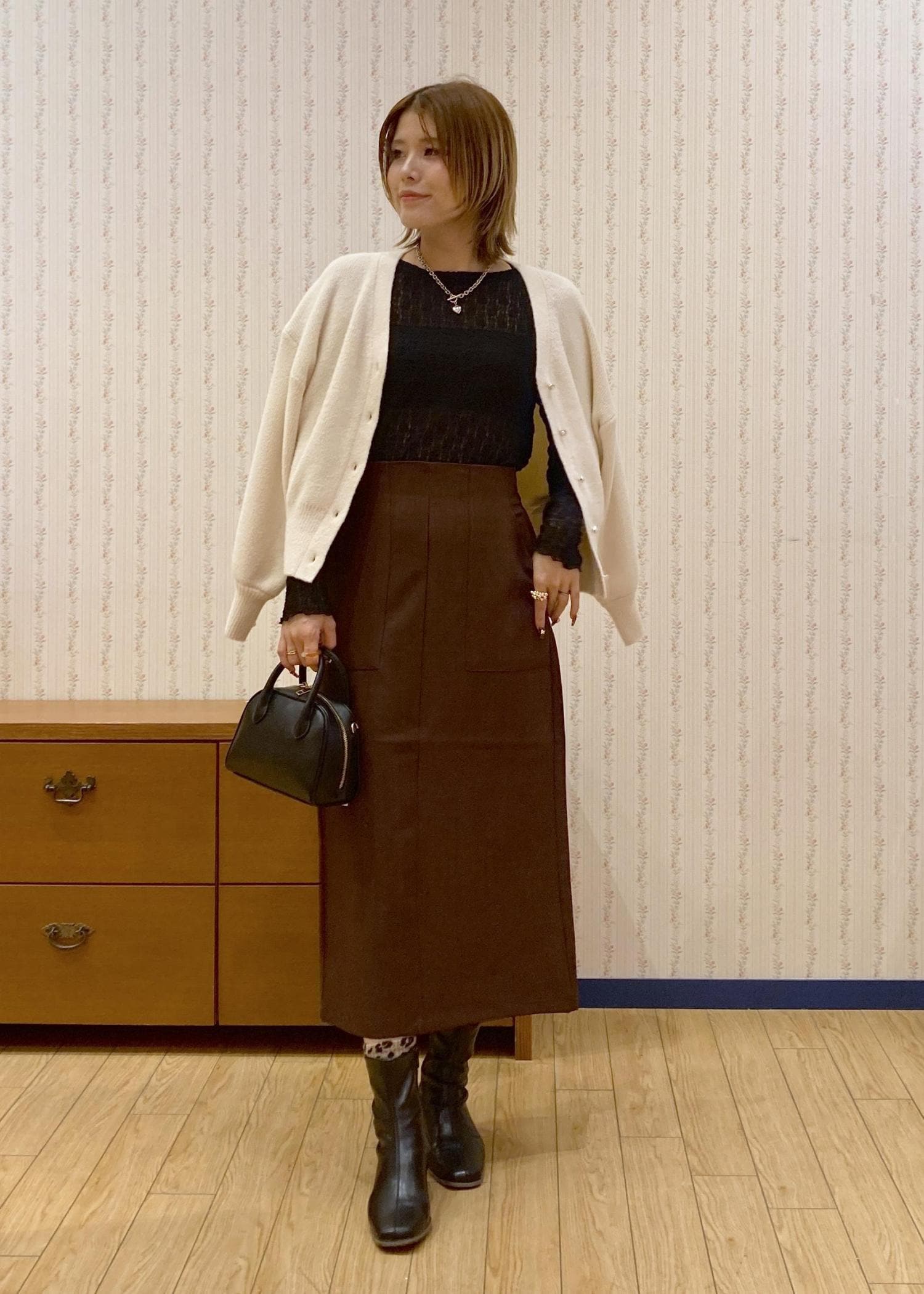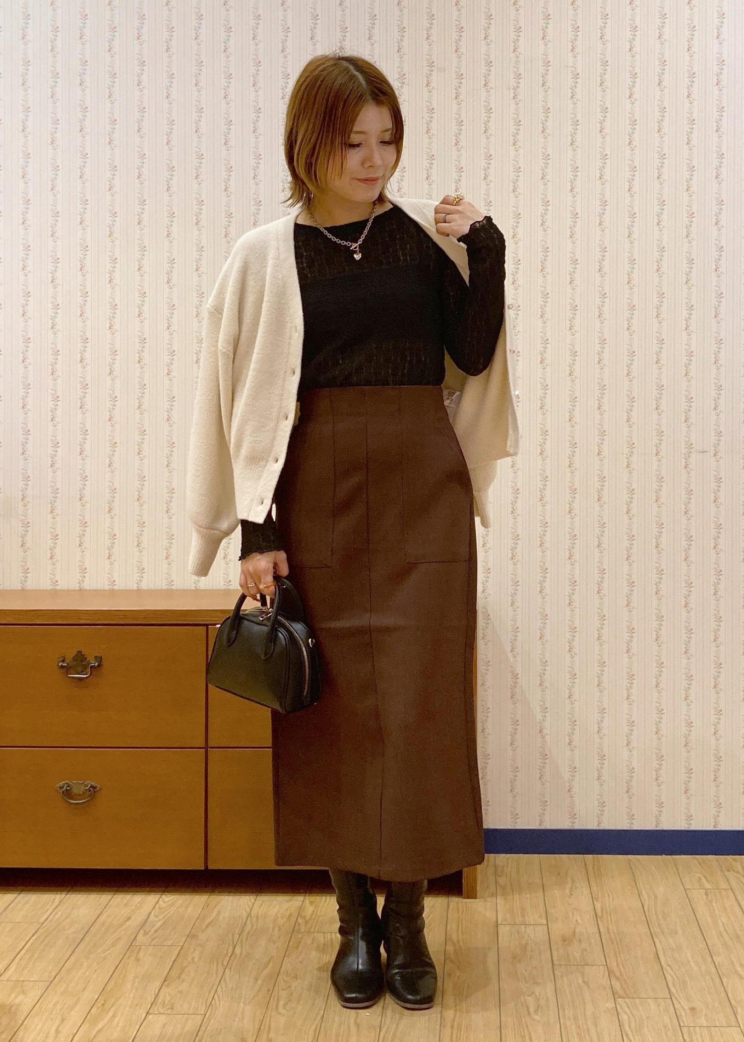 シアー感のあるレースインナーにブラウンのタイトスカートを合わせた大人っぽい綺麗めコーディネートです。