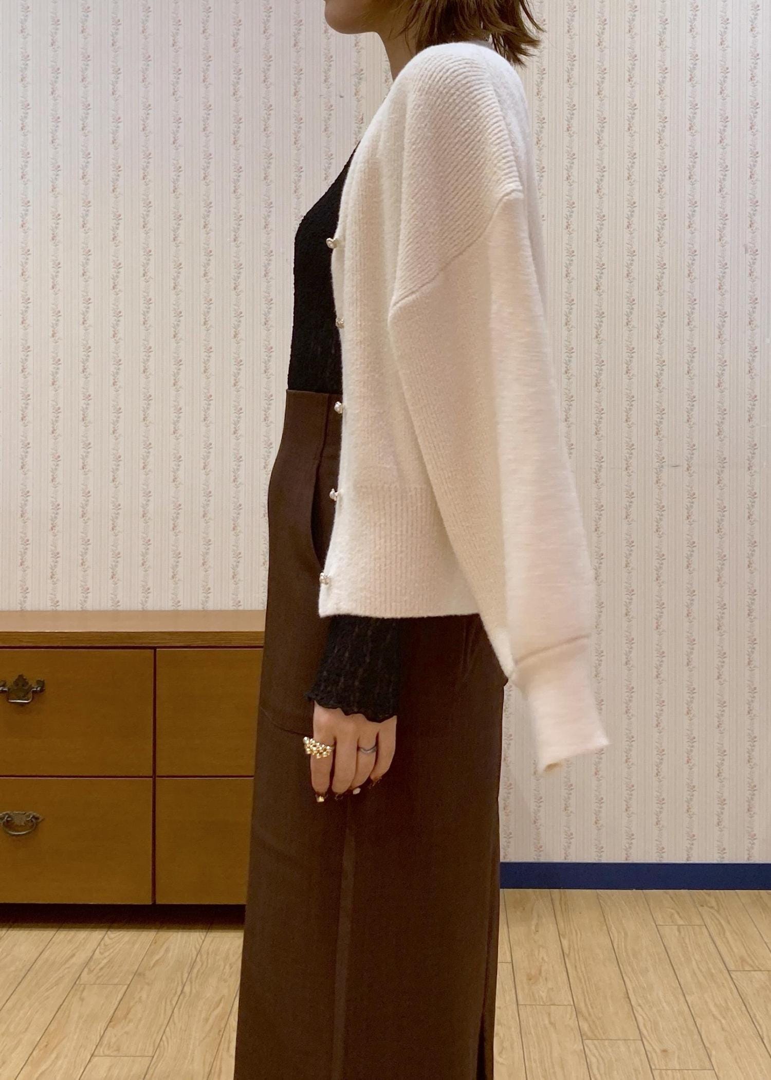 パールボタンがフェミニンで可愛らしい印象を与えてくれます。 -
