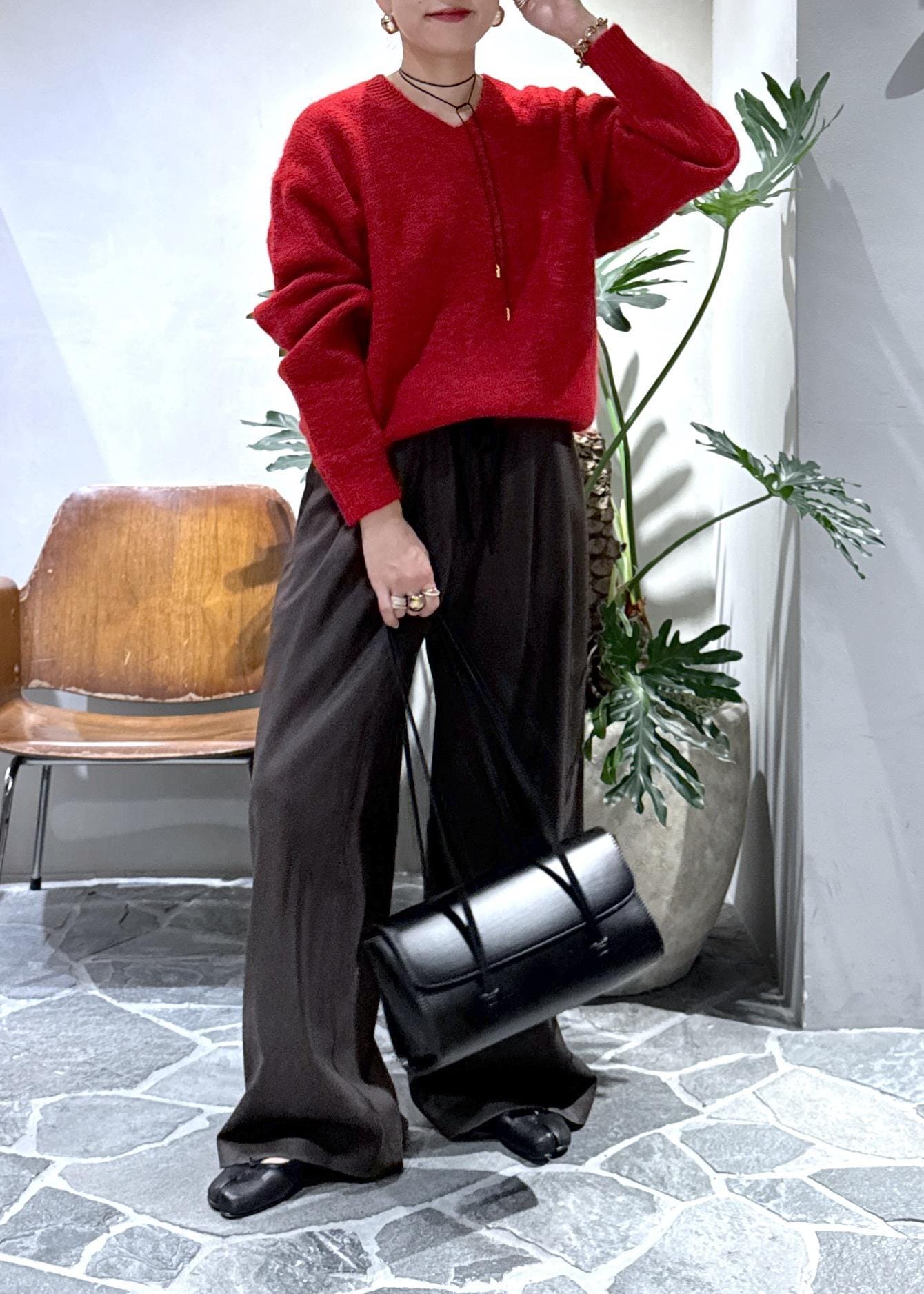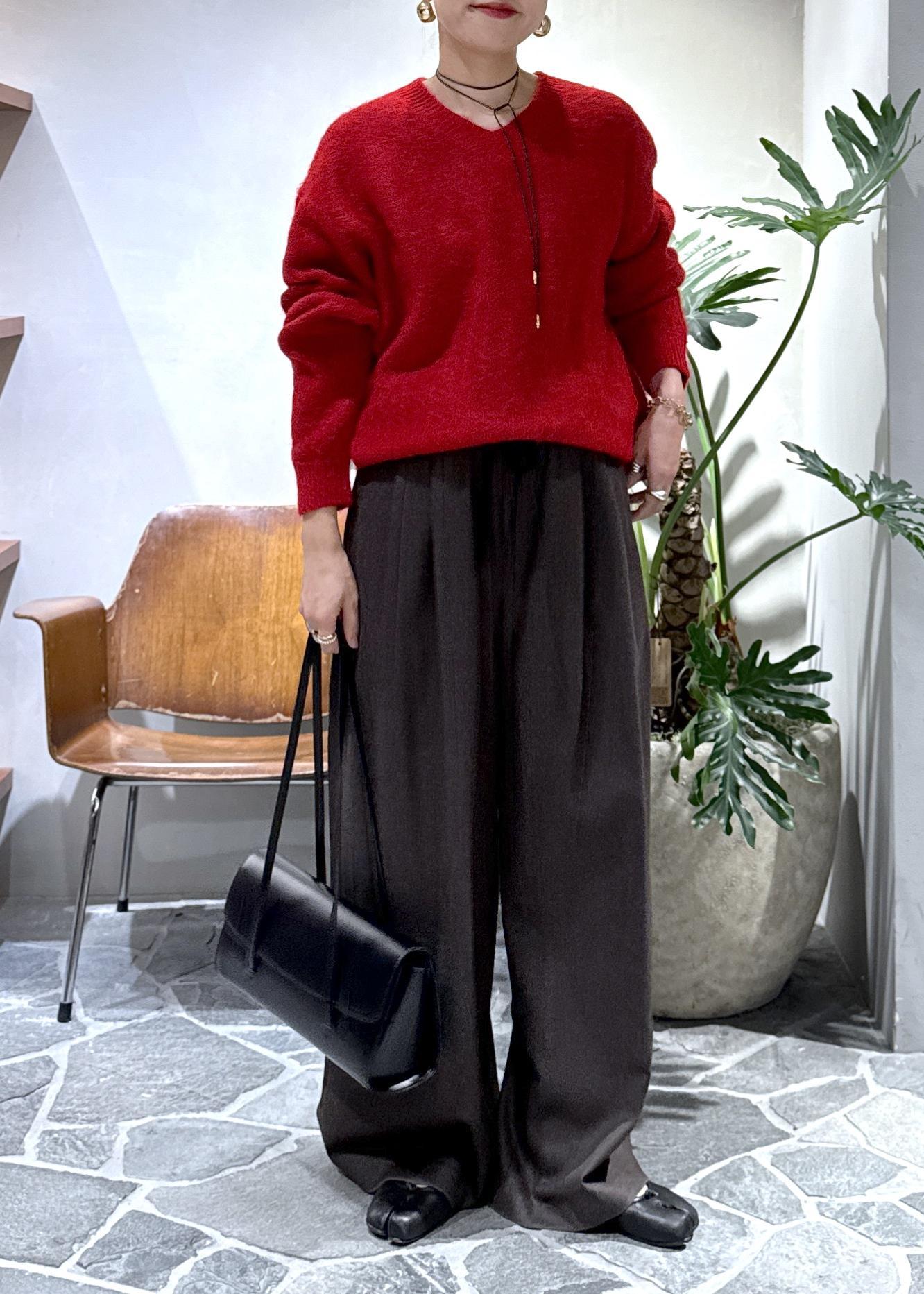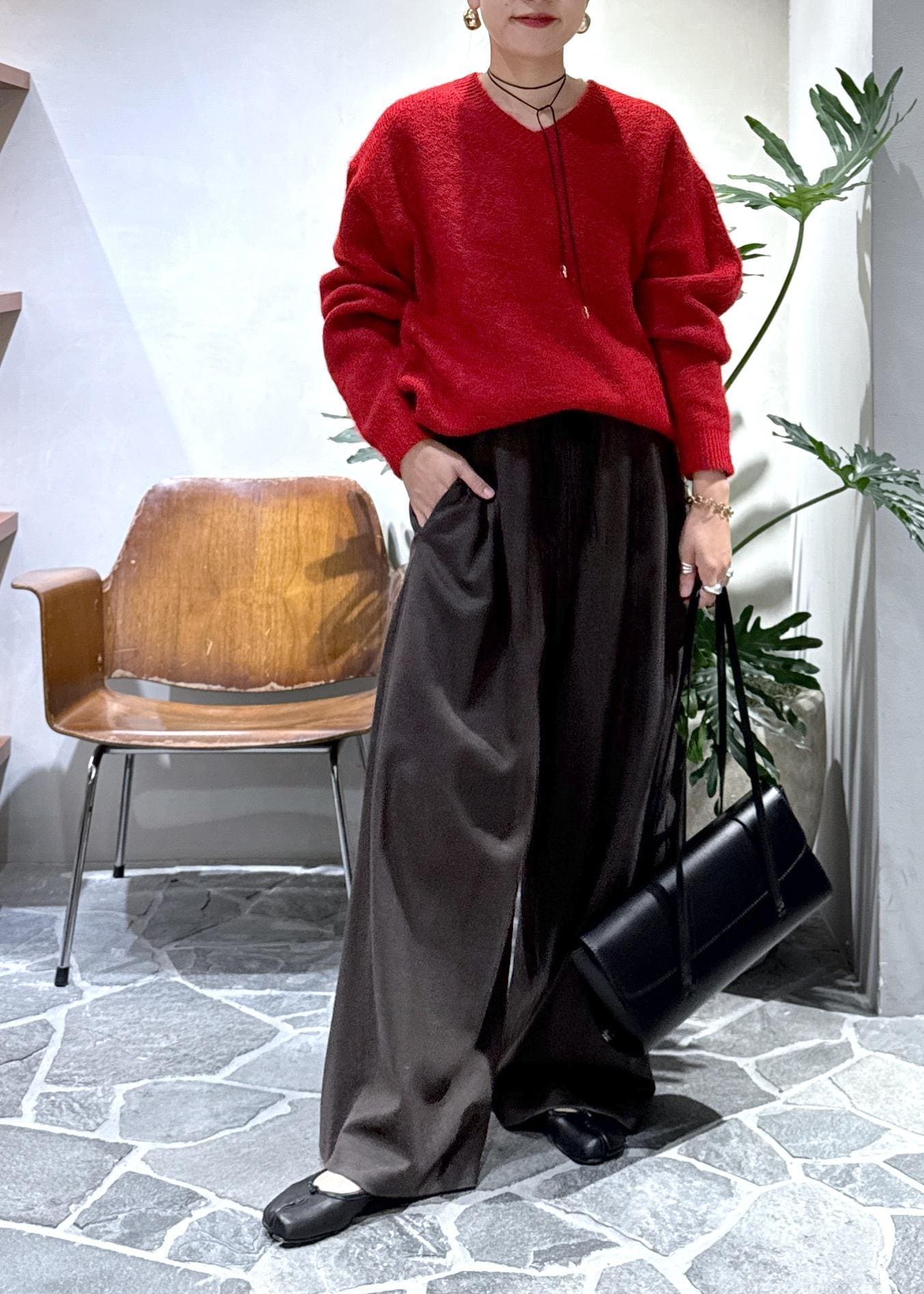 ゆったりとしたサイズ感が可愛い真っ赤なニットは、黒を一滴落としたような理想的な赤。