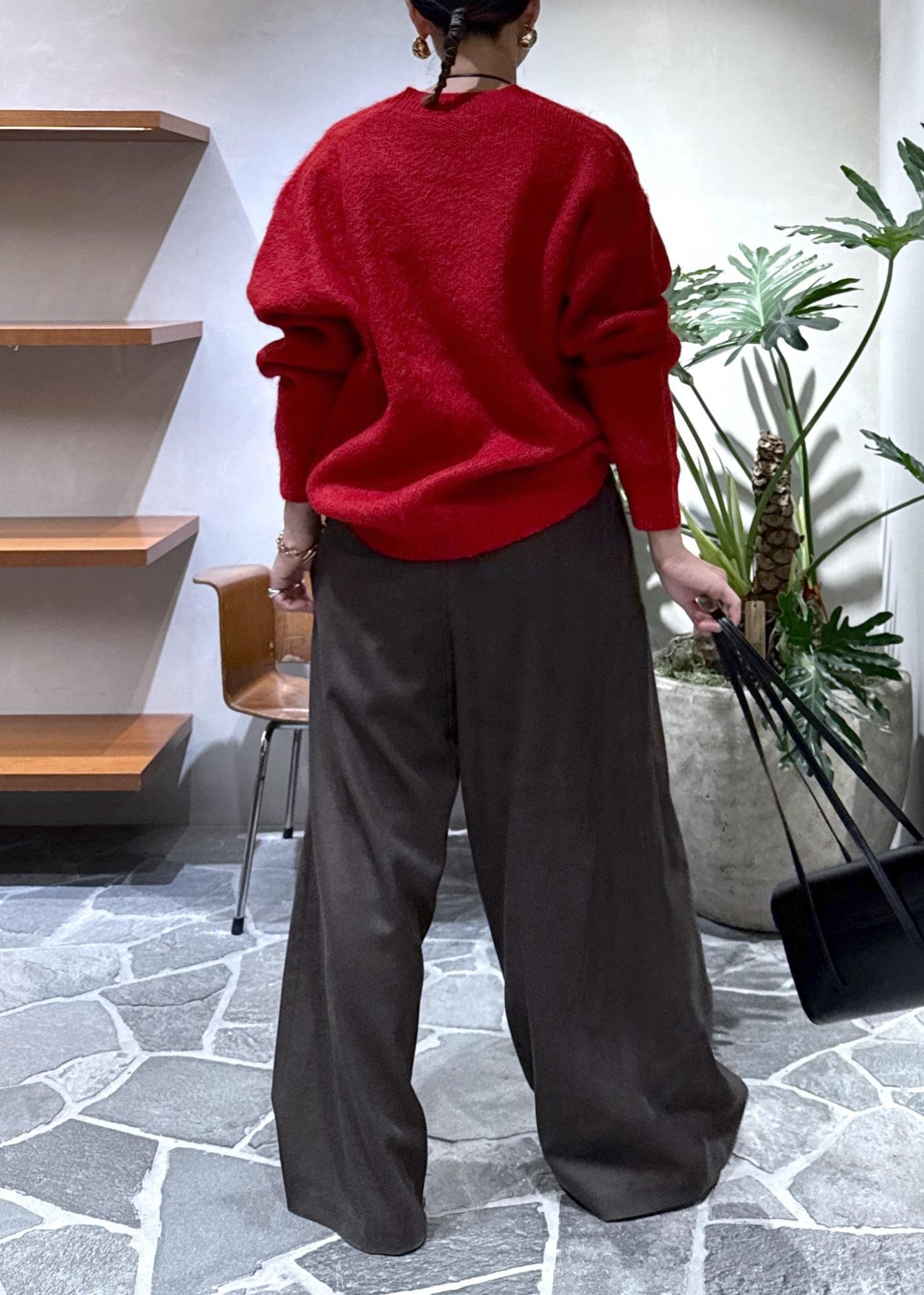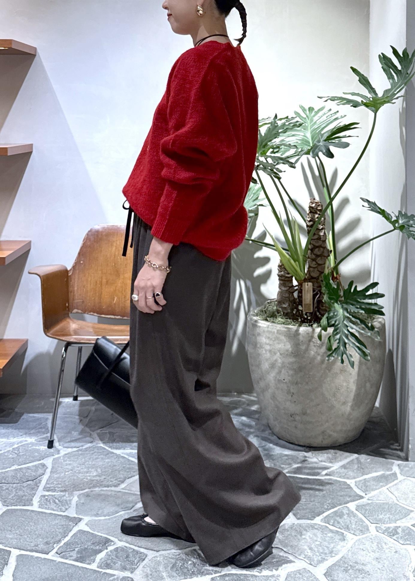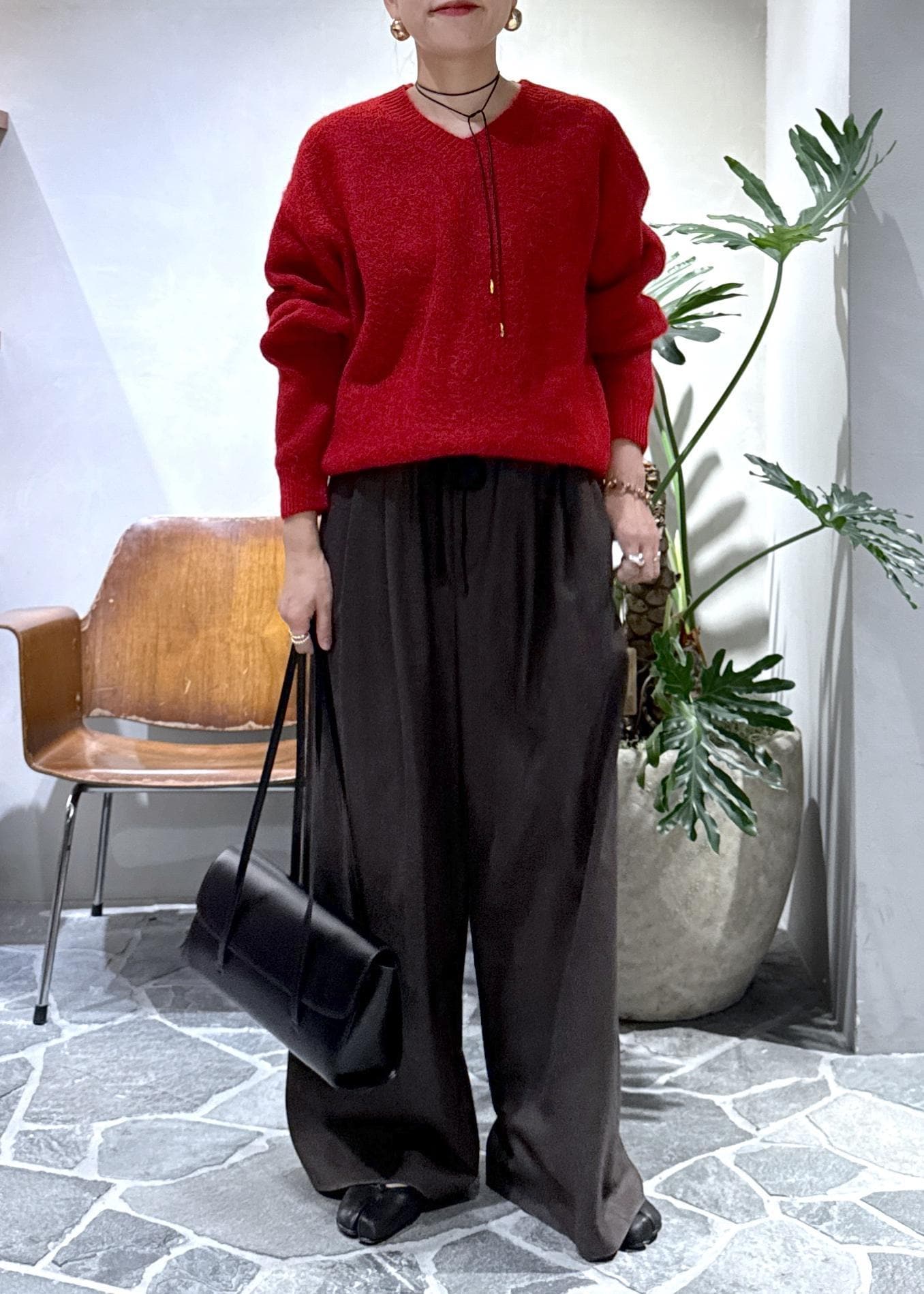 ゆったりとしたサイズ感が可愛い真っ赤なニットは、黒を一滴落としたような理想的な赤。