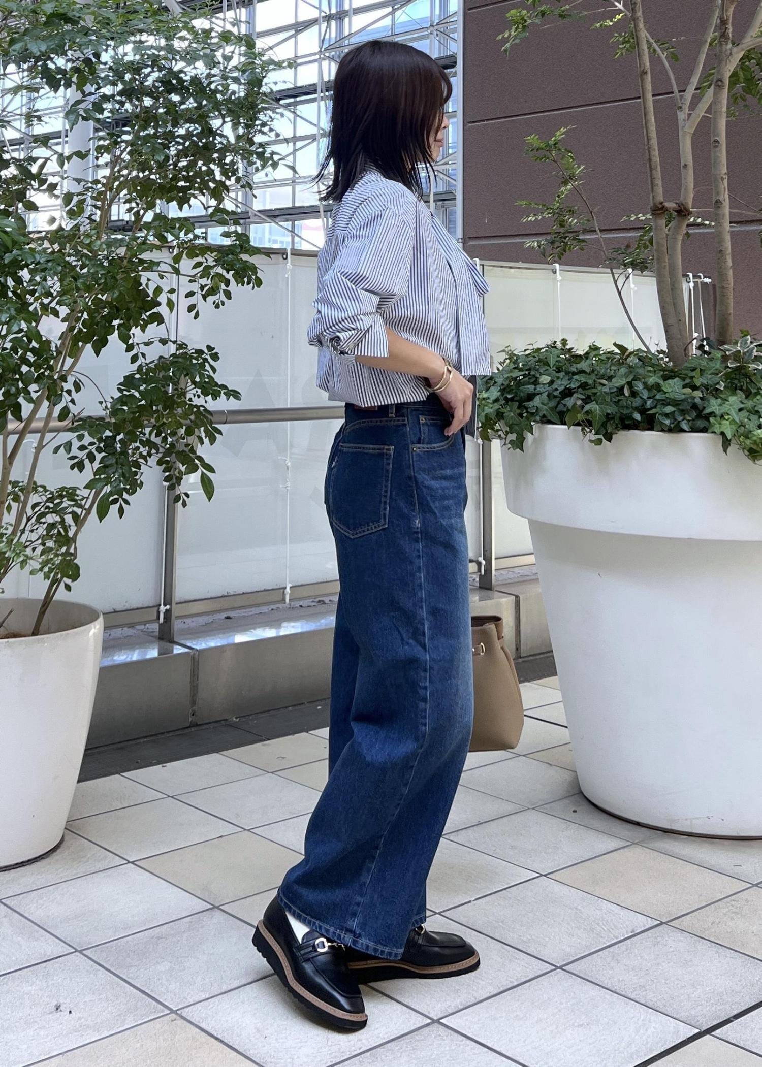 ローファーとトートバッグでクラシカルな着こなしにしました。