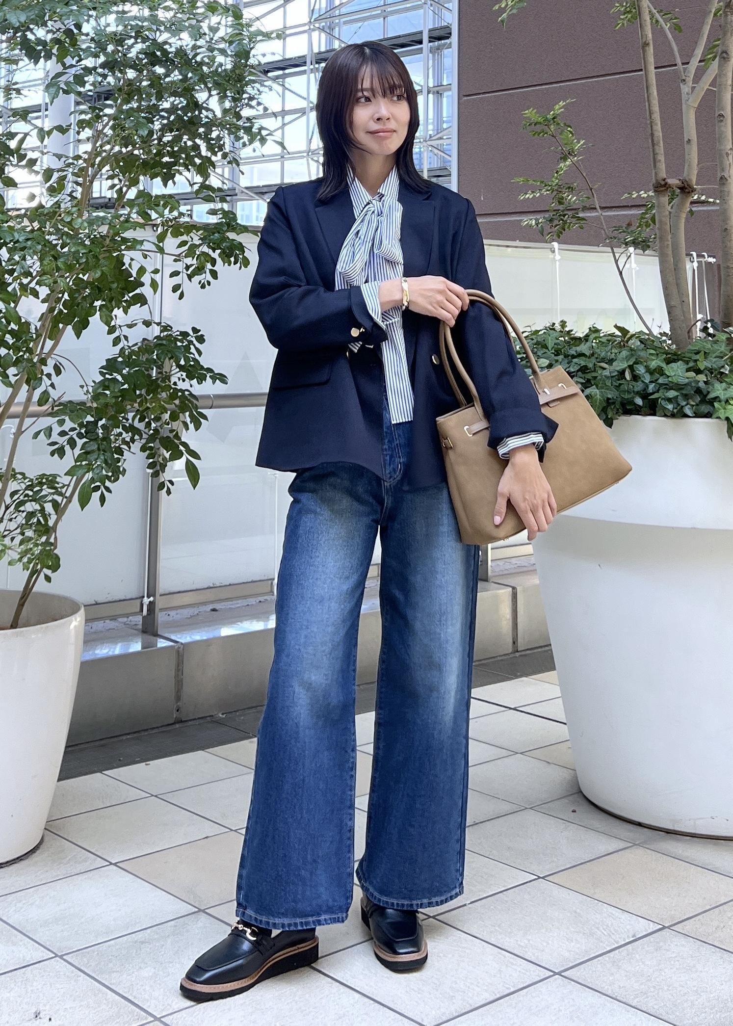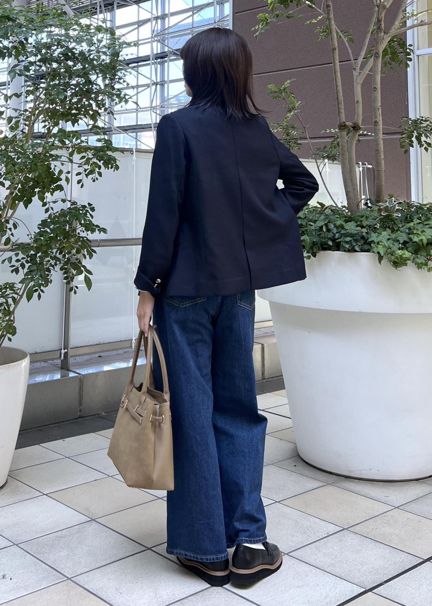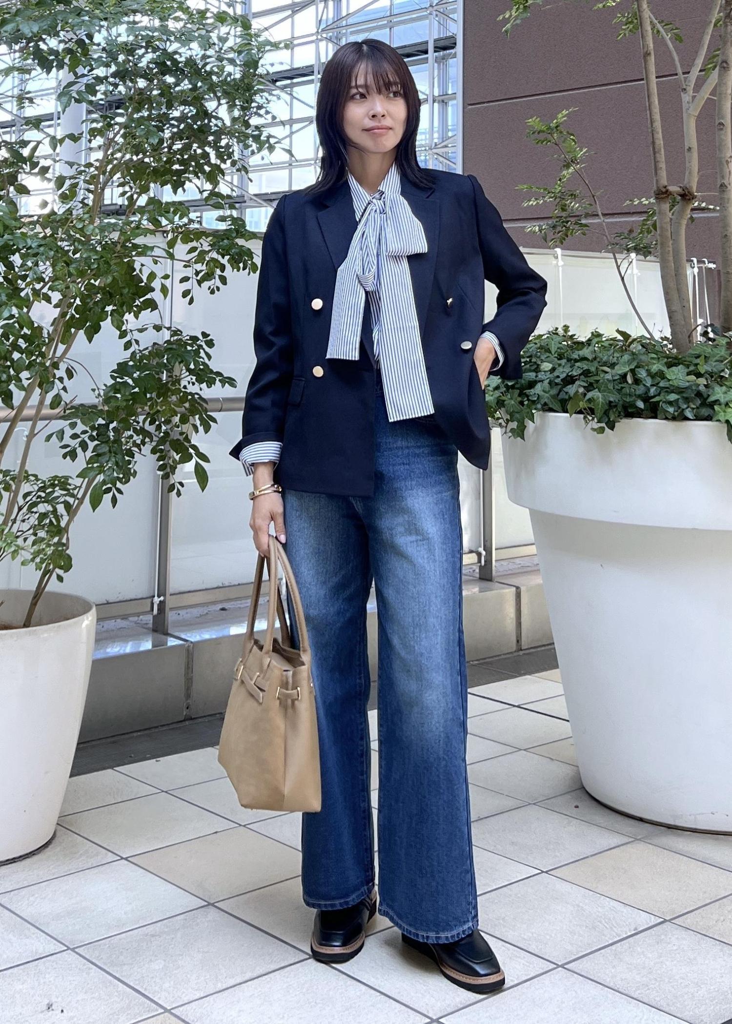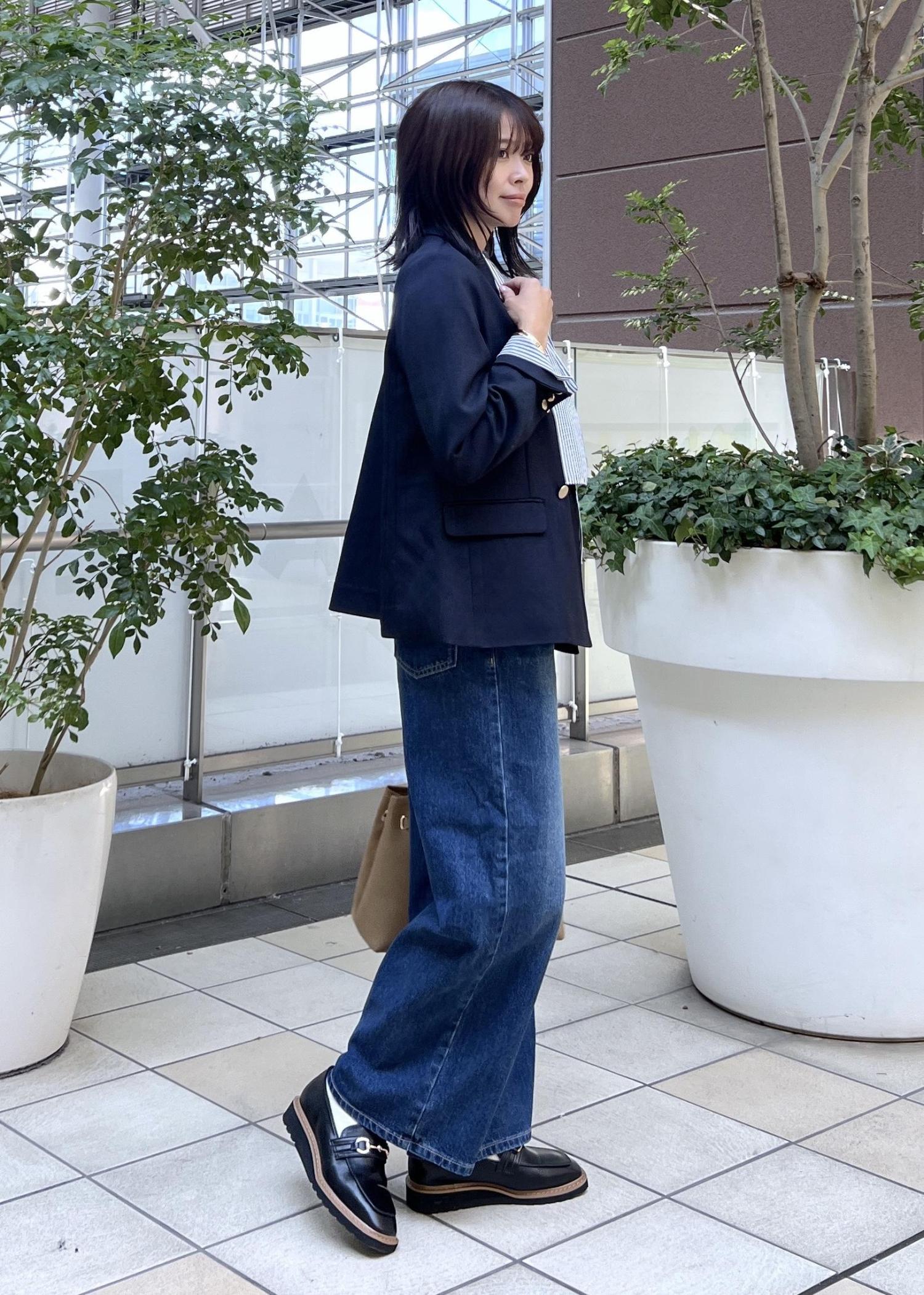 定番のネイビーのジャケットは、デニムパンツを合わせてきれいめカジュアルなコーデもおすすめ。
