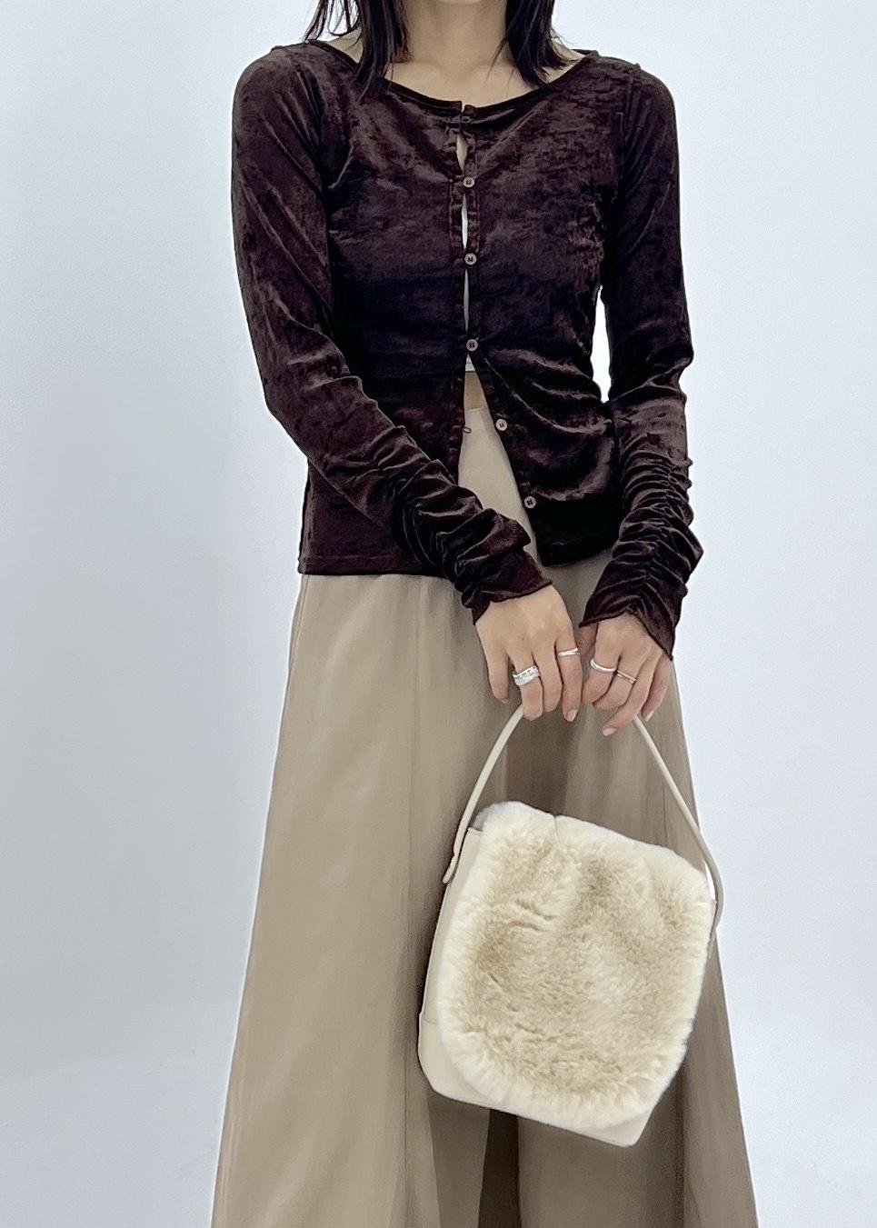 トップスはベロア生地のカーディガンでスッキリ感のあるコンパクトな形が◎