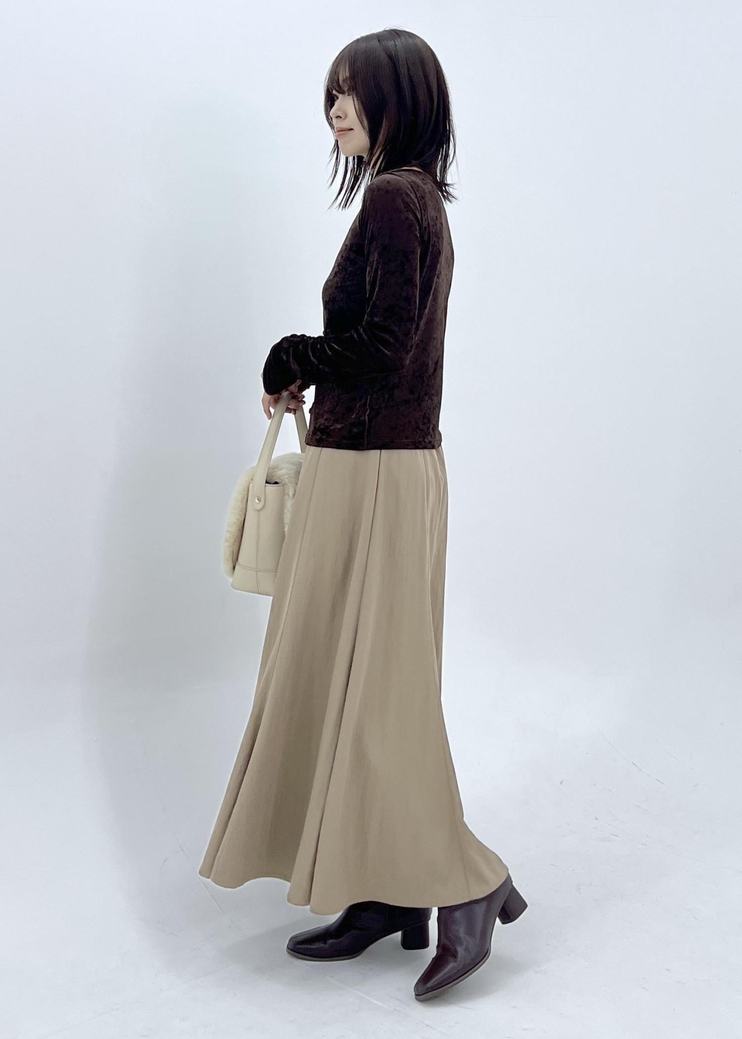 マーメイドスカートを合わせてフェミニンさのあるスタイリングにしました。