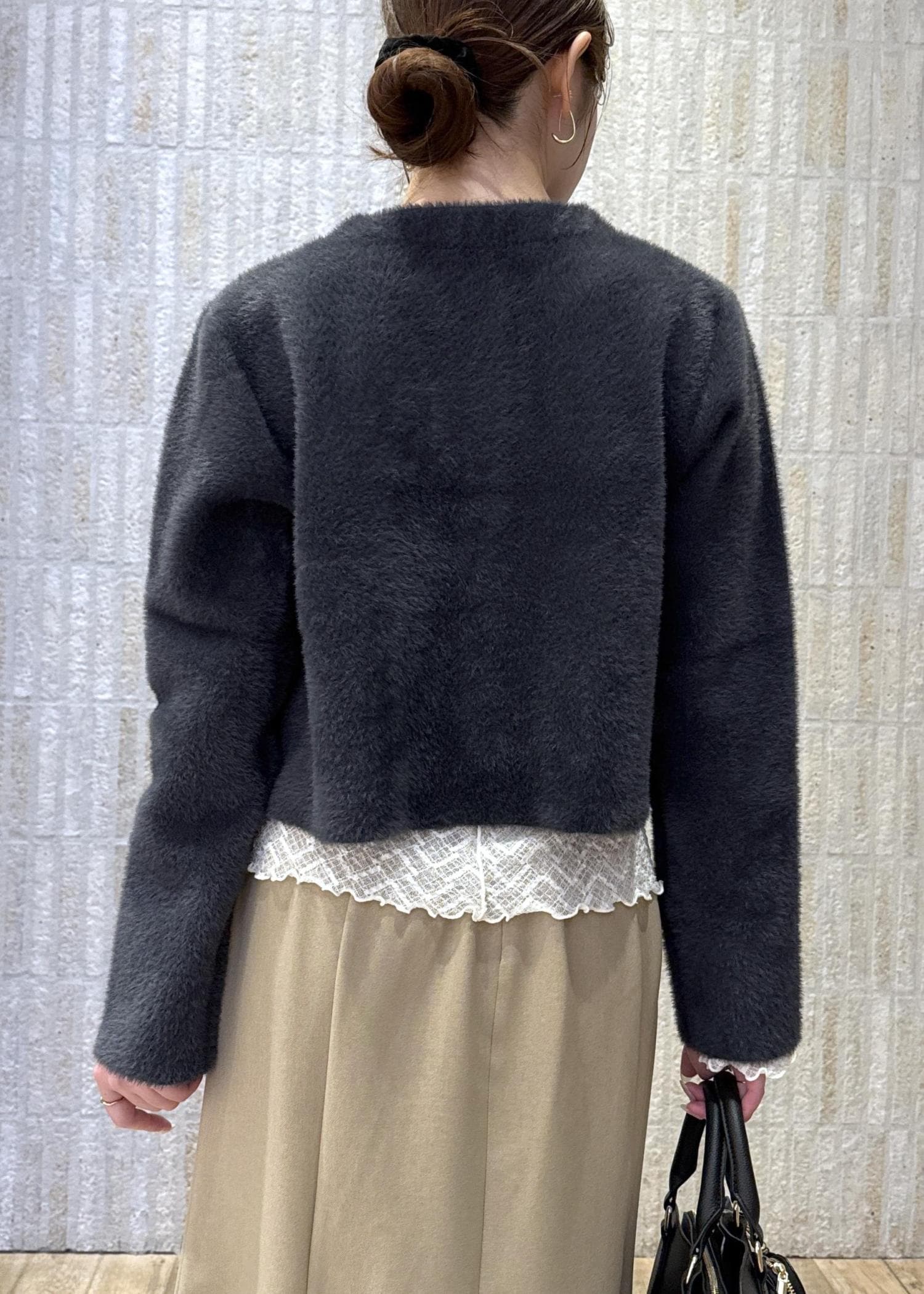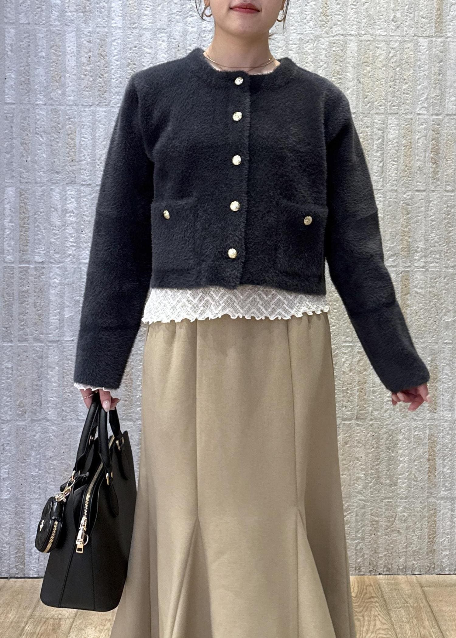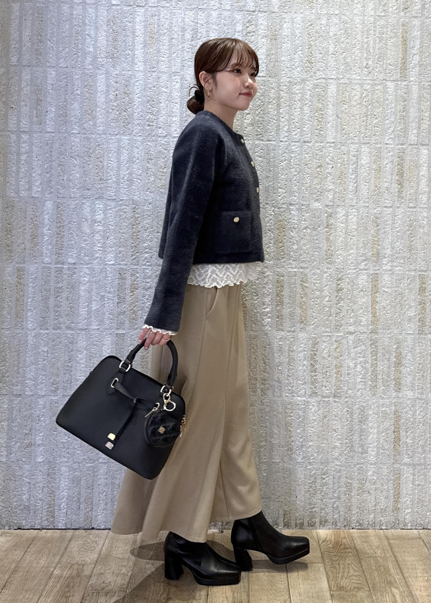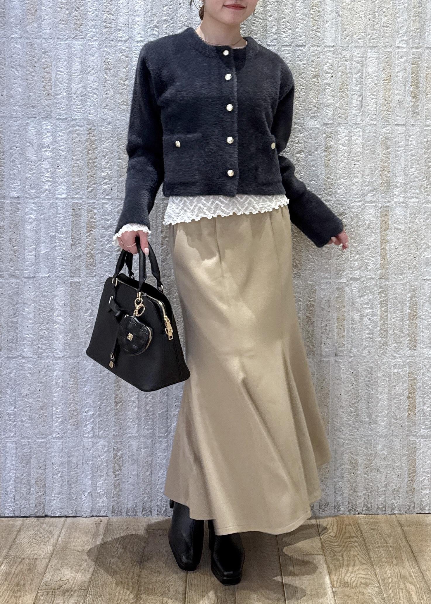 落ち着いたカラーで大人っぽくまとめつつ、カーディガンの金ボタンやインナーのレースで華やかに!
