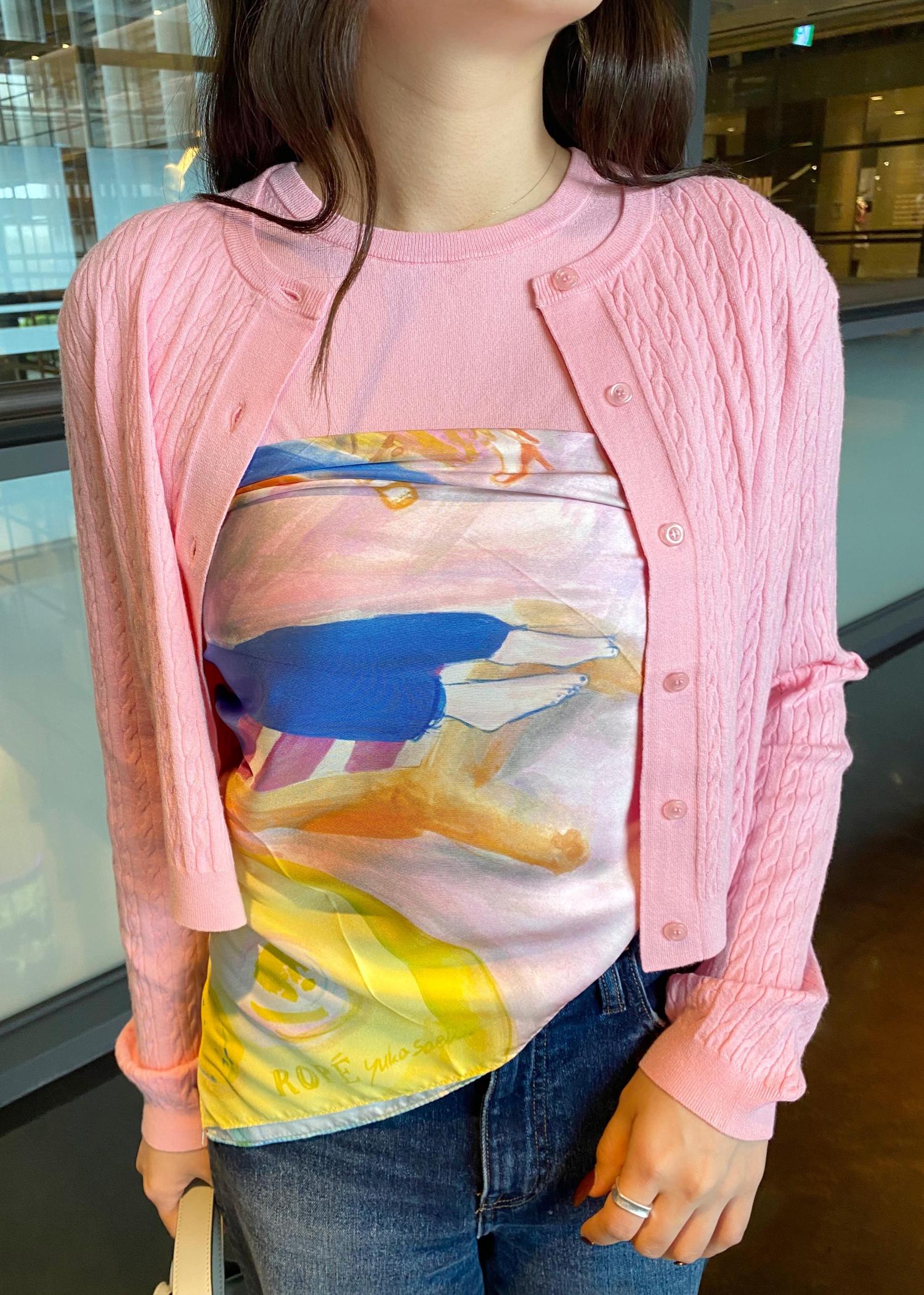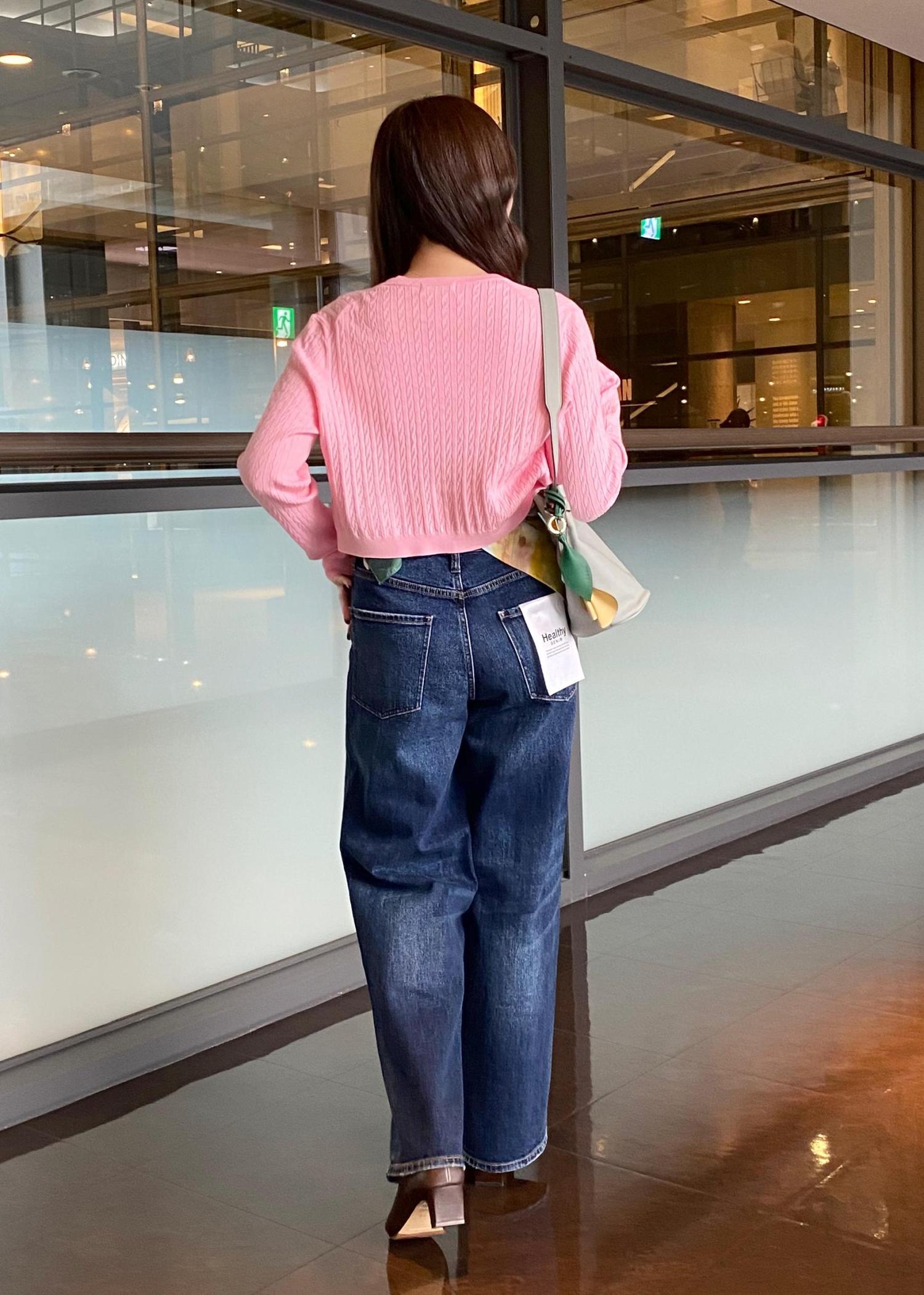 カーディガンはショート丈なので、ボトムスにボリュームがあってもすっきりとお召いただけます。