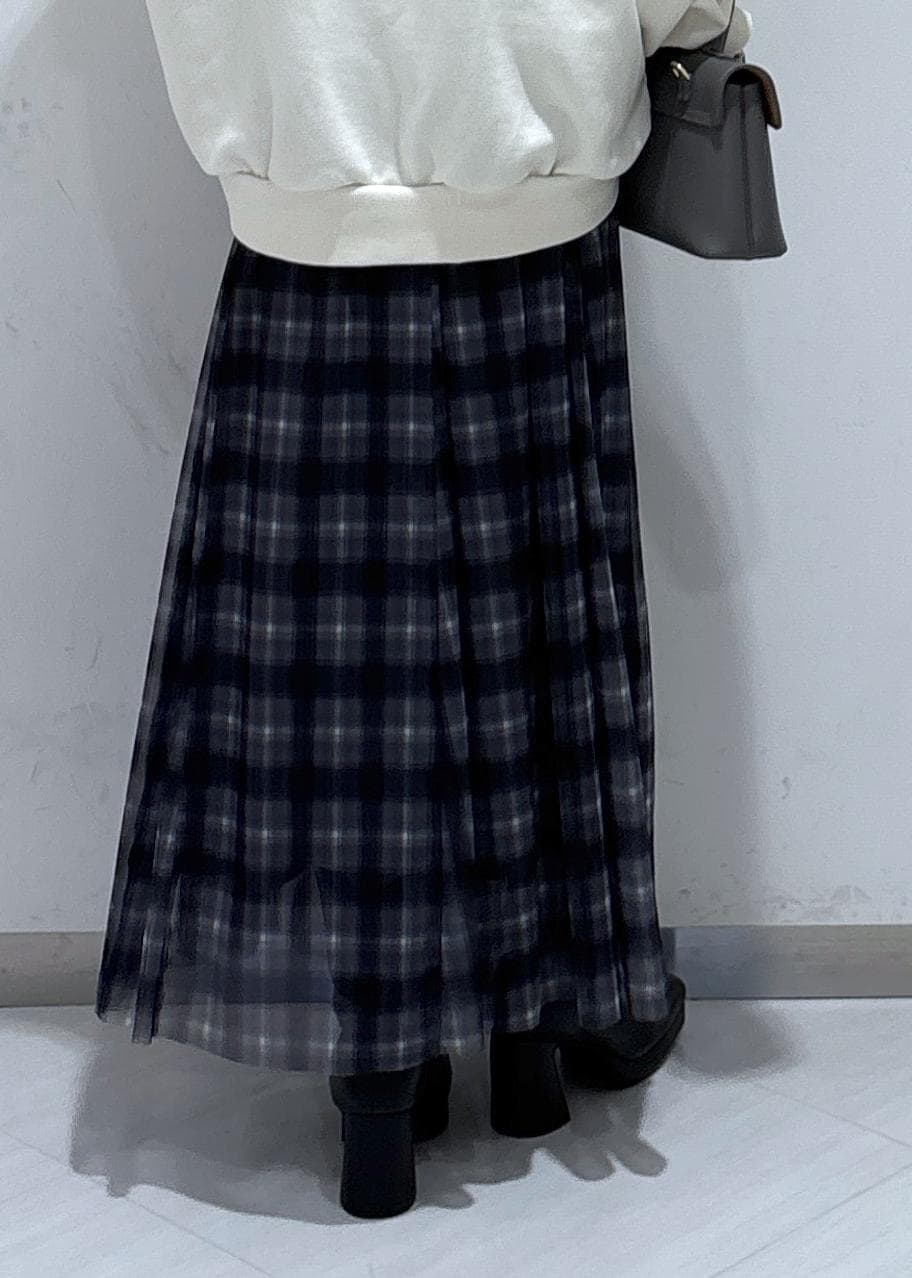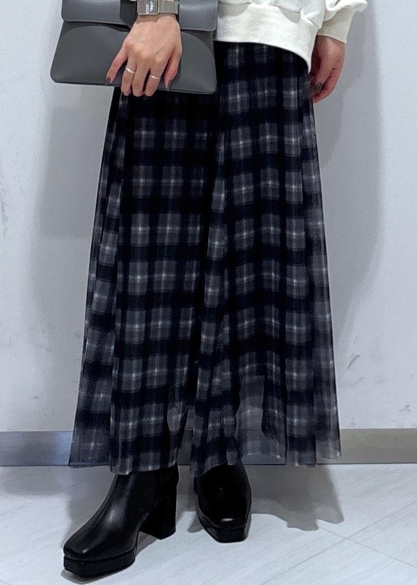 VIS【洗える】チュールプリントチェックスカートブラック系 / F¥4,612レビュートレンドのチェック柄スカート。