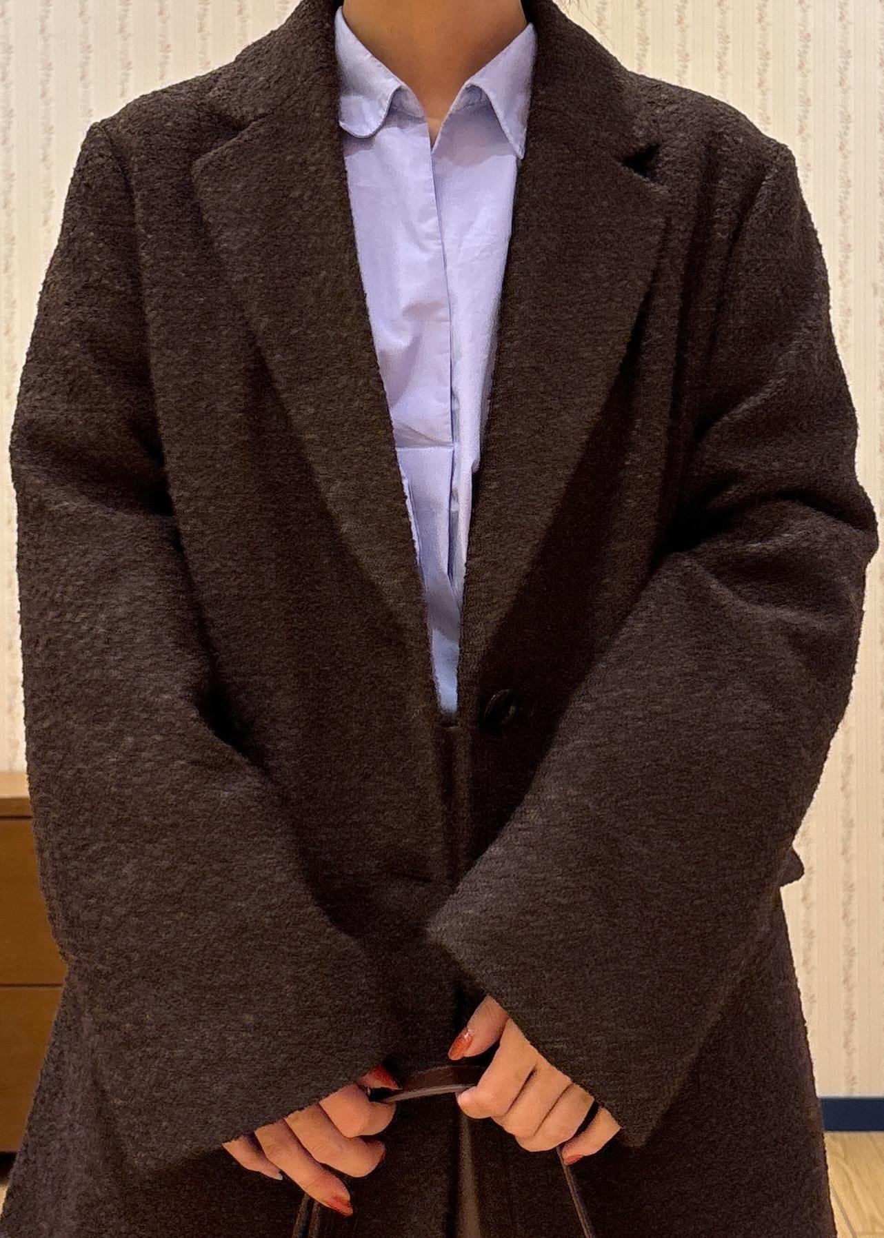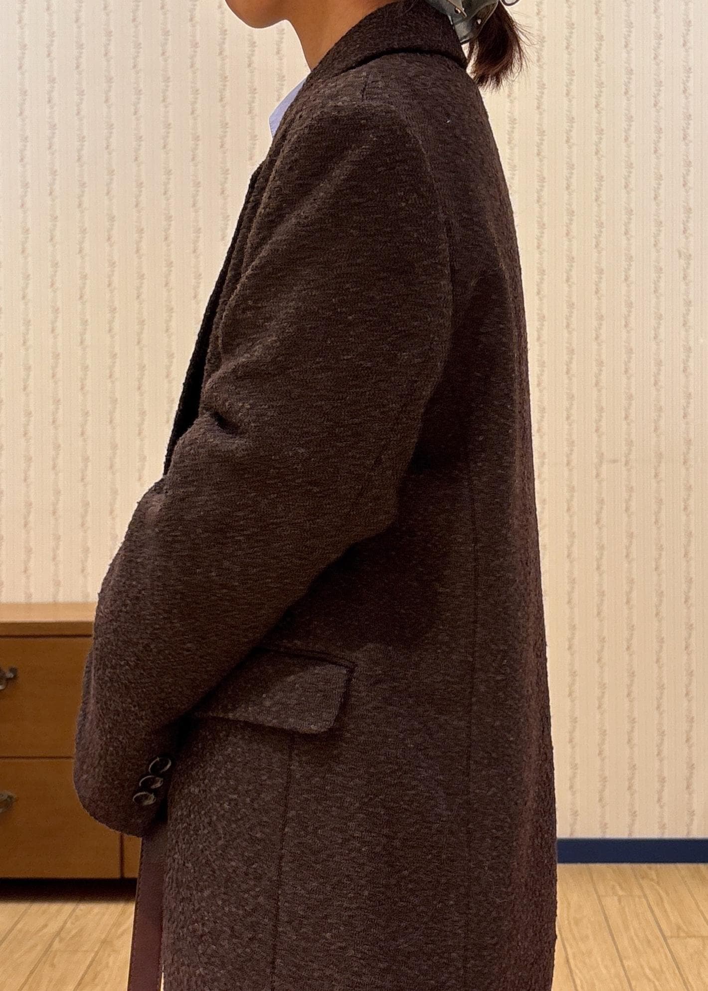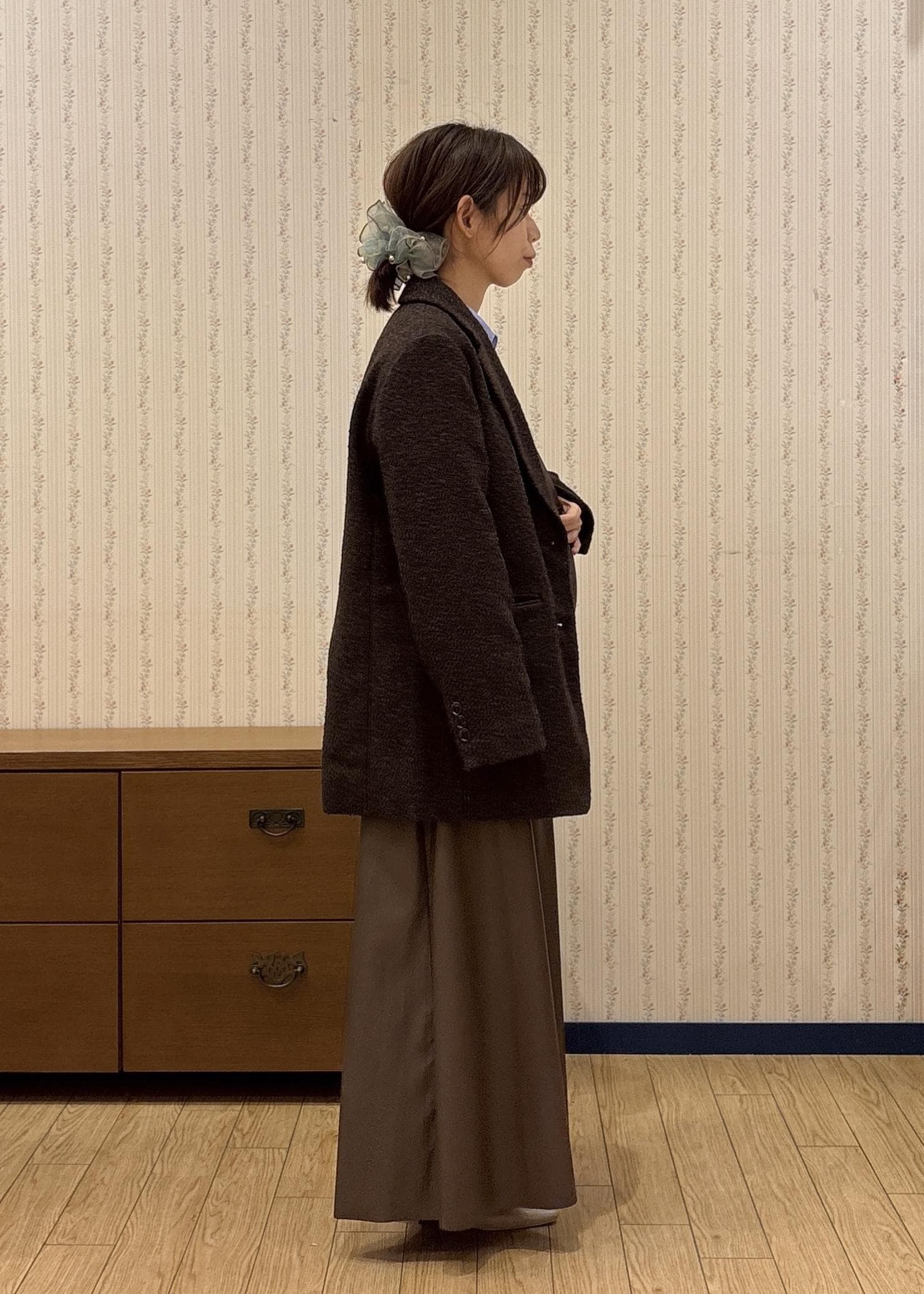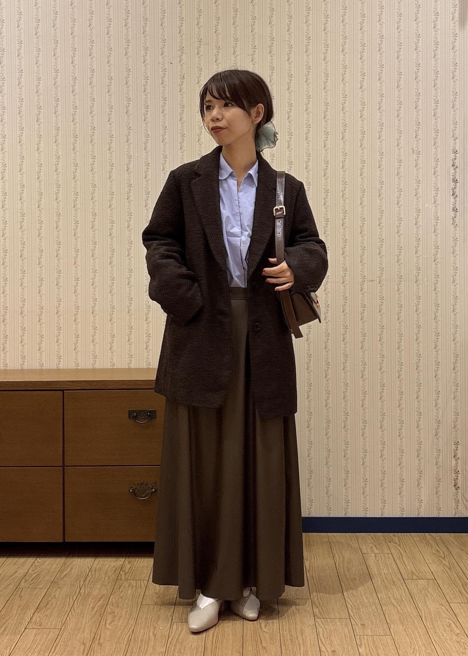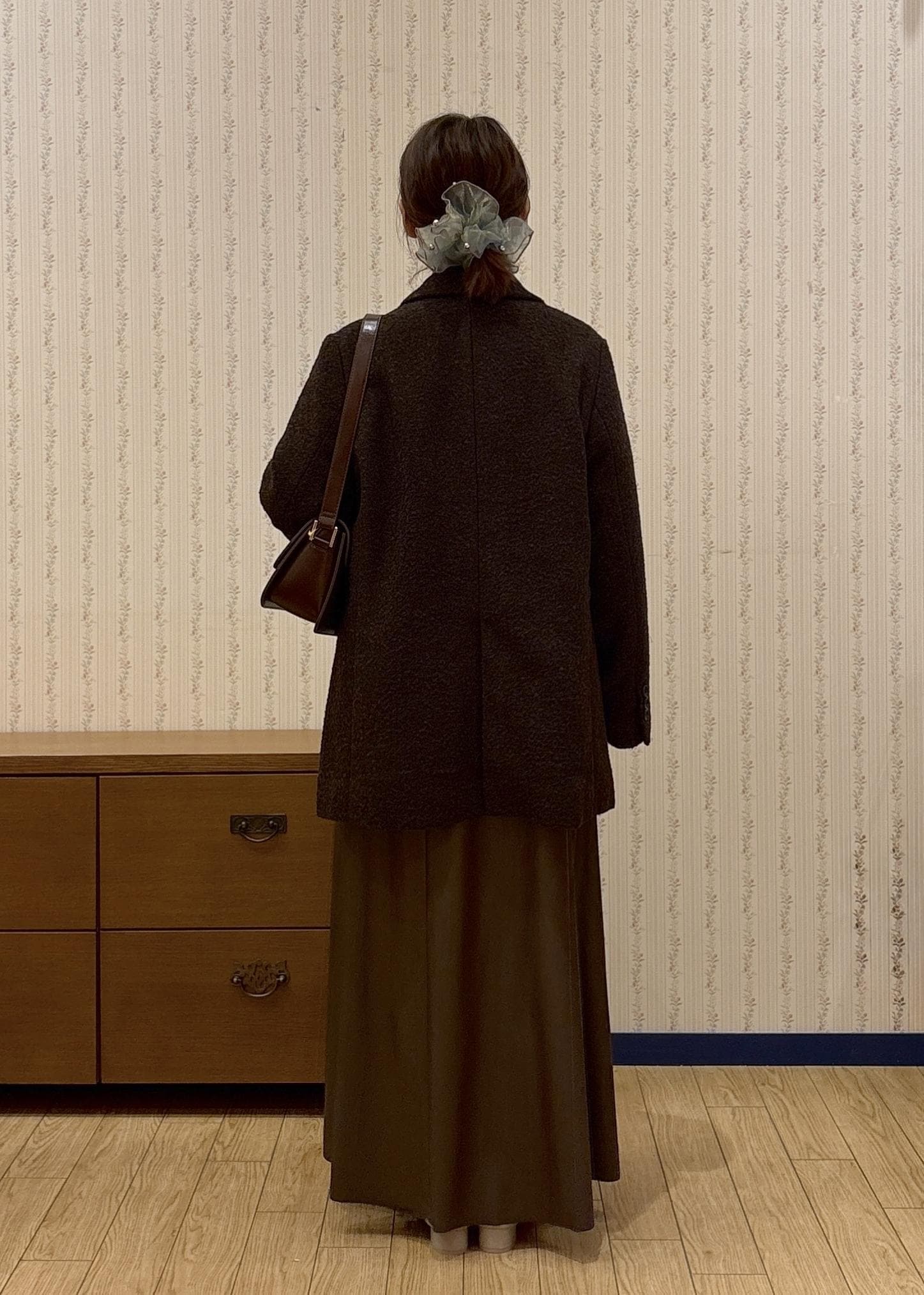 ブラウンのジャコット(ジャケット+コート)とブラウンスカート、