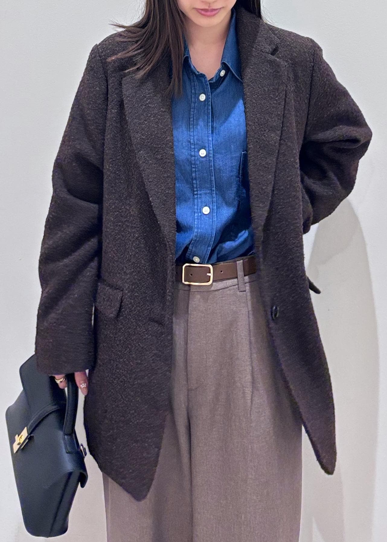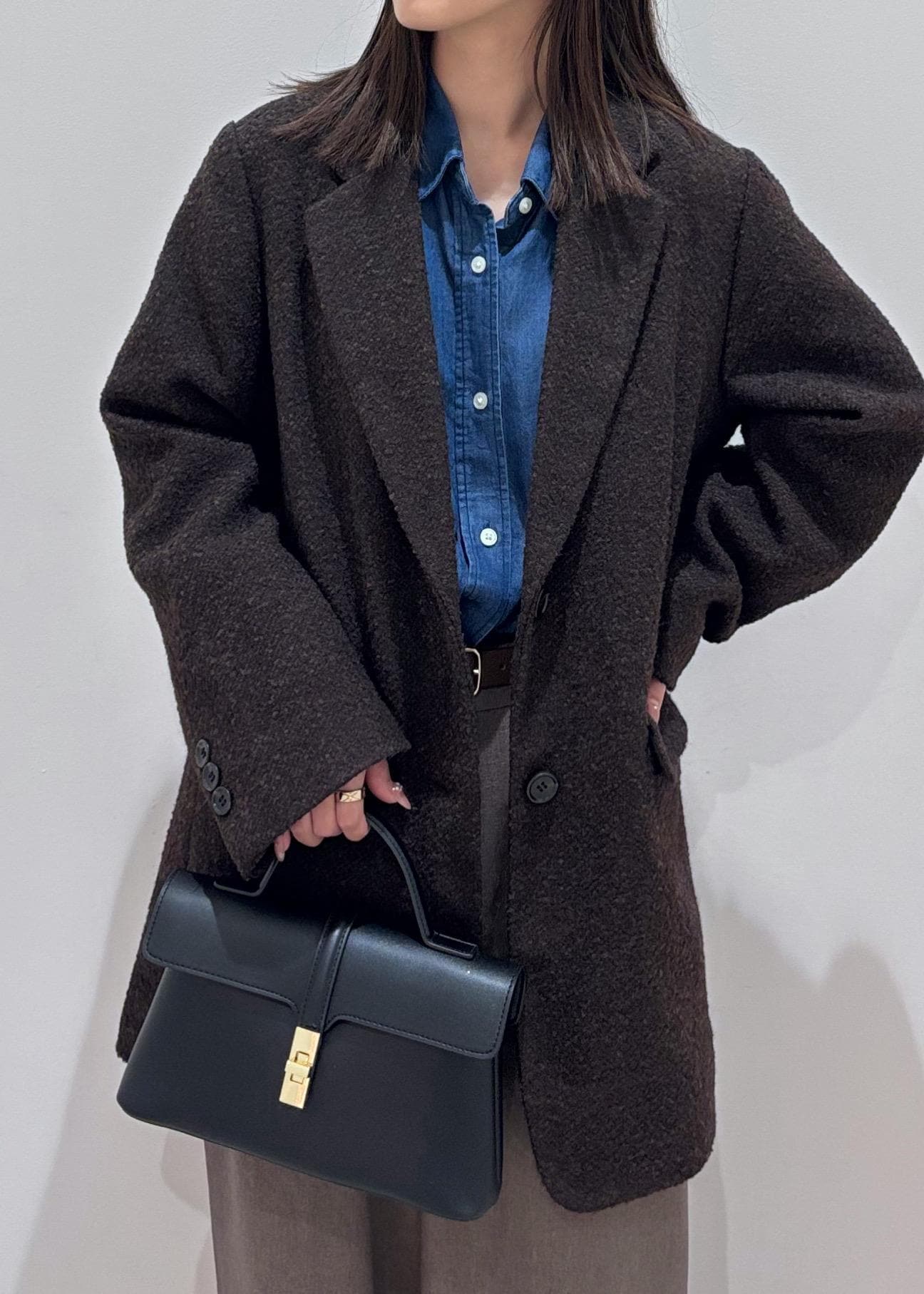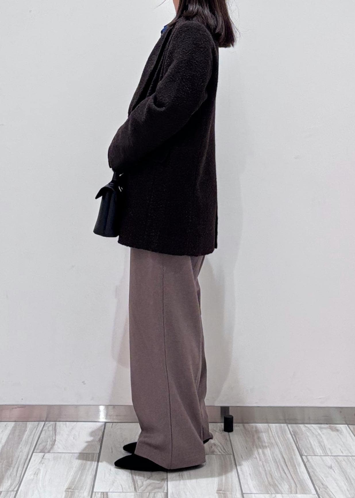 ROPÉ PICNICネップツイードテーラードジャコットダークブラウン系 / F¥13,200レビュー154センチで、お尻がすっぽり隠れるほどの長さです。落ち着いた色味のコートとジャケットのいいとこ取りをしたアウターなので、しっかり暖かく、ゆとりのある作りで、中に地厚なニットも着込めます。