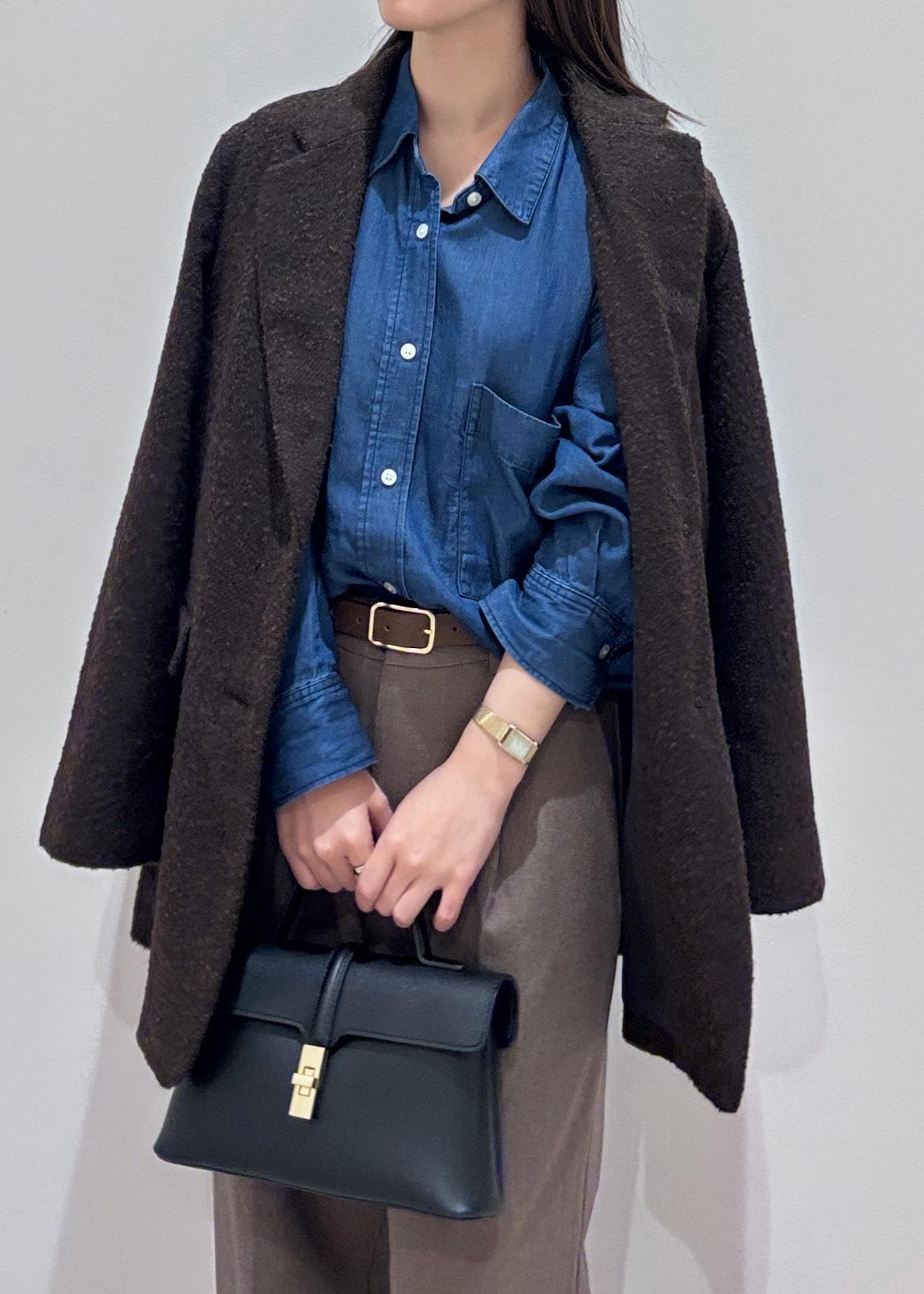 デニムシャツにダークブラウンのジャコットと、ベージュのパンツで綺麗めカジュアルコーデ組んでみました。