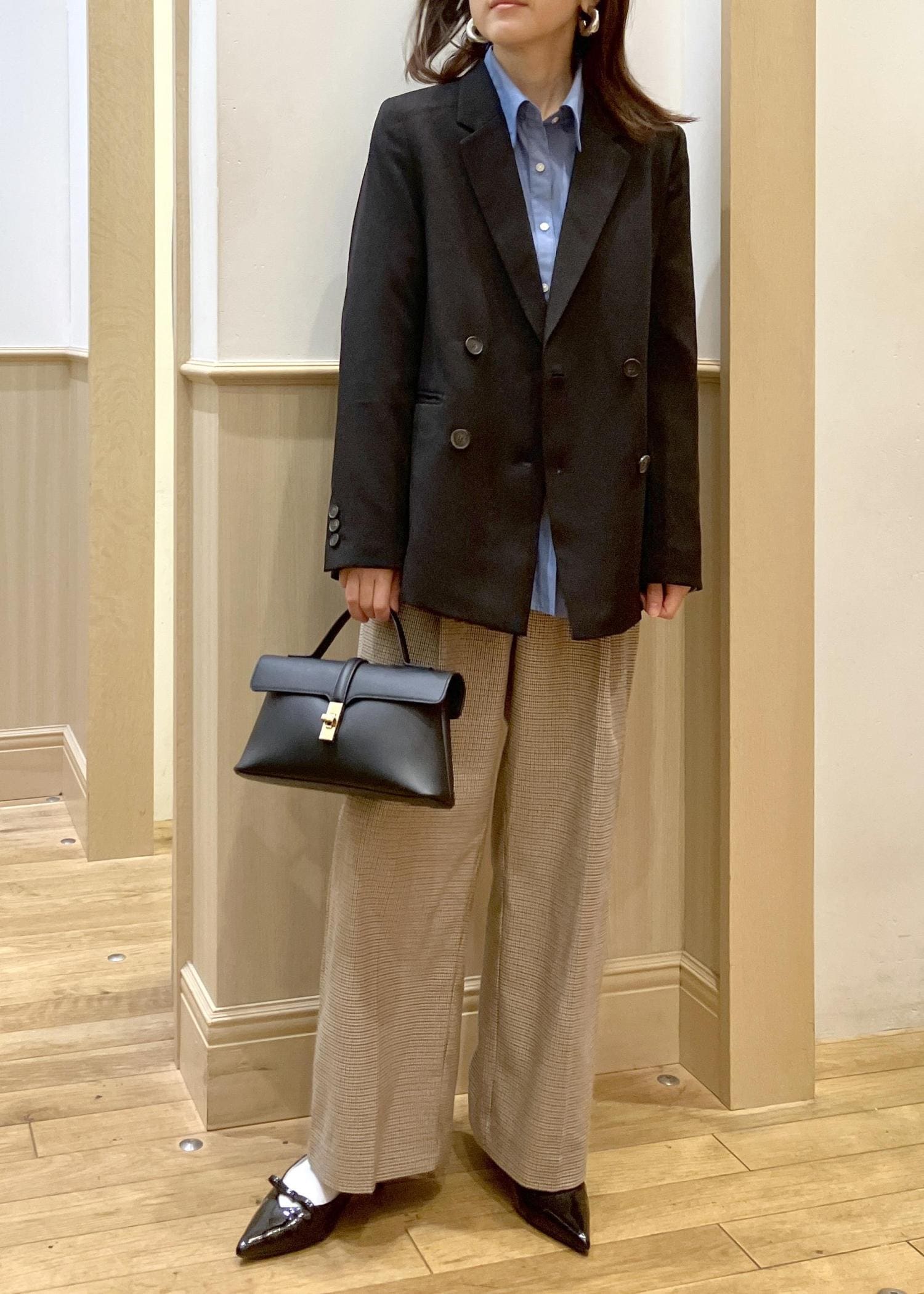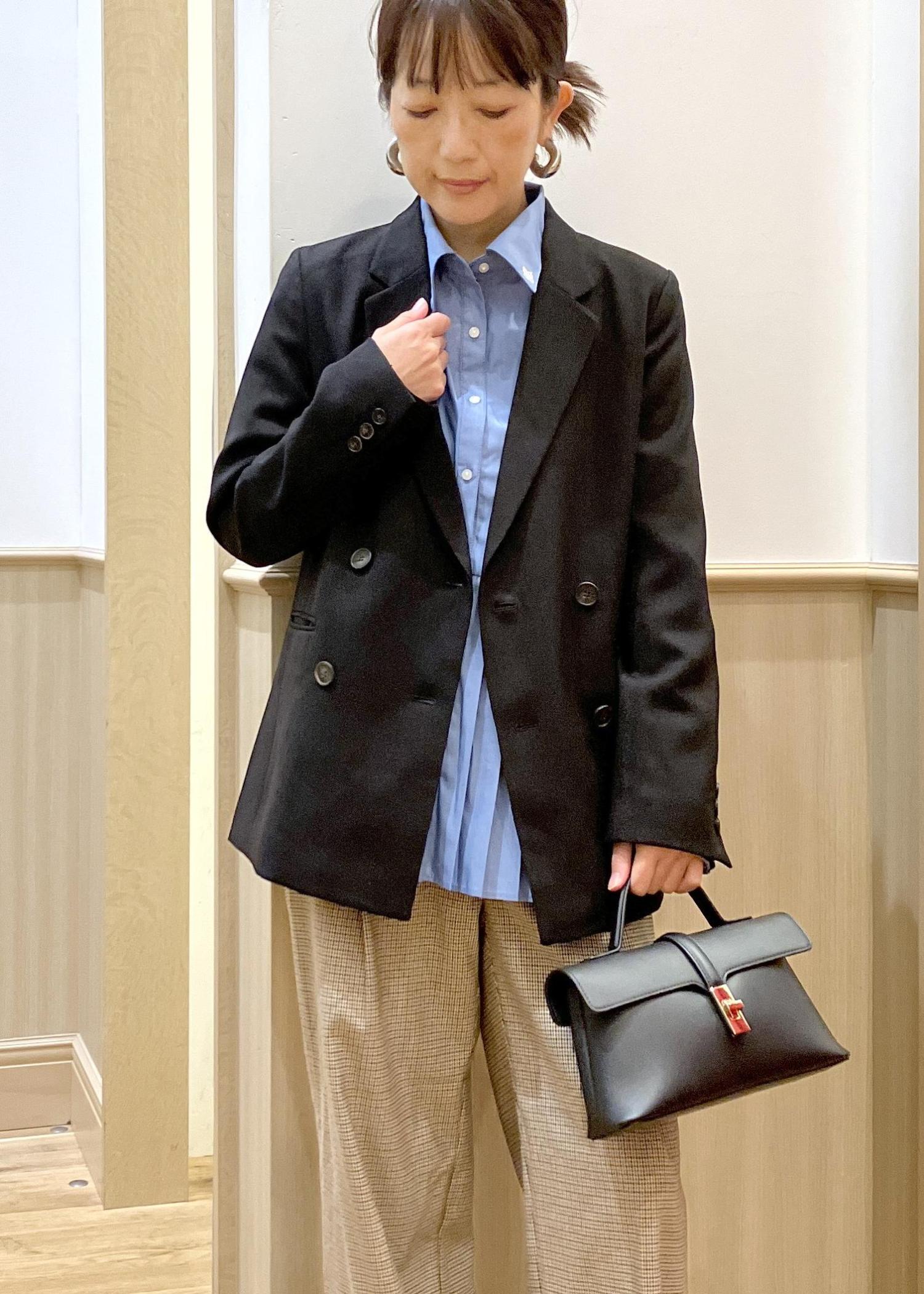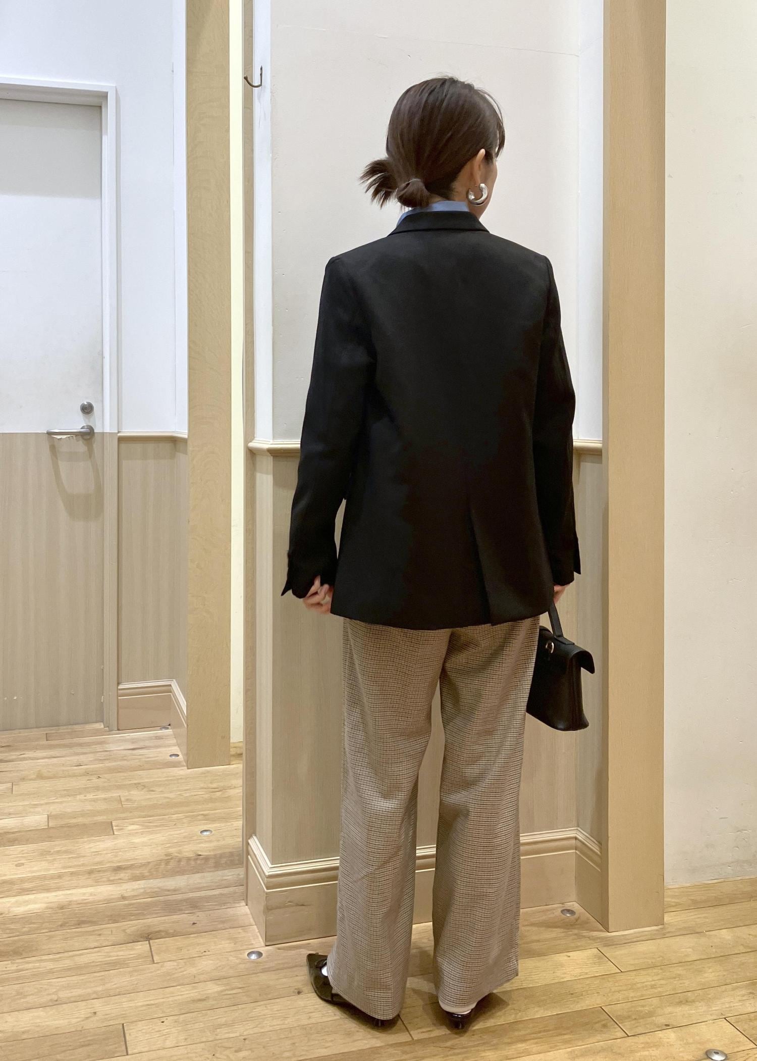 通勤服の定番の黒ジャケットを少しカジュアルにブルーシャツ×チェックパンツで合わせてみました。