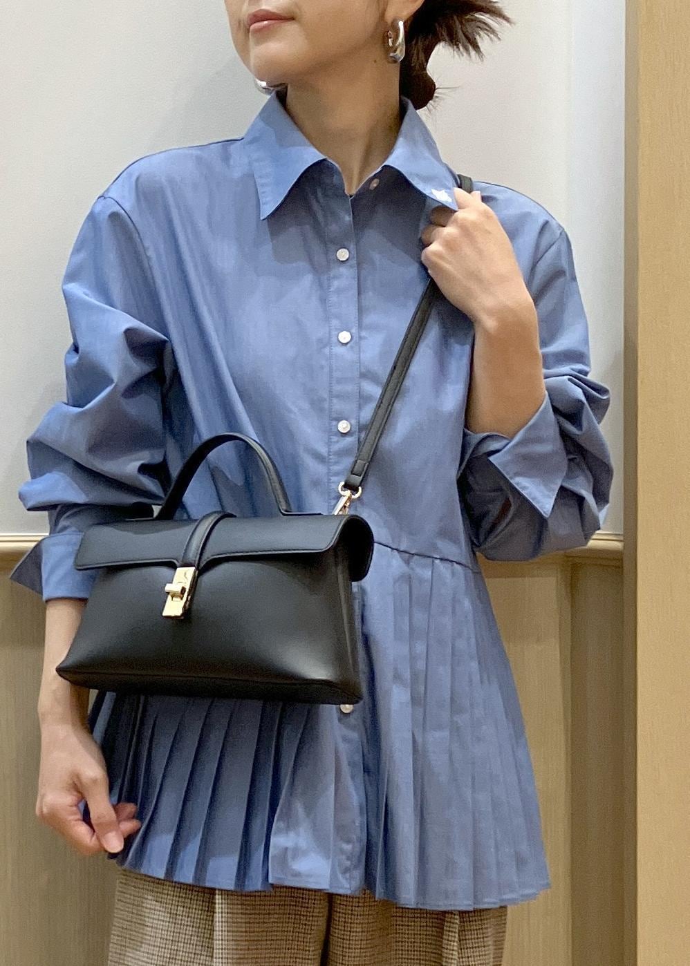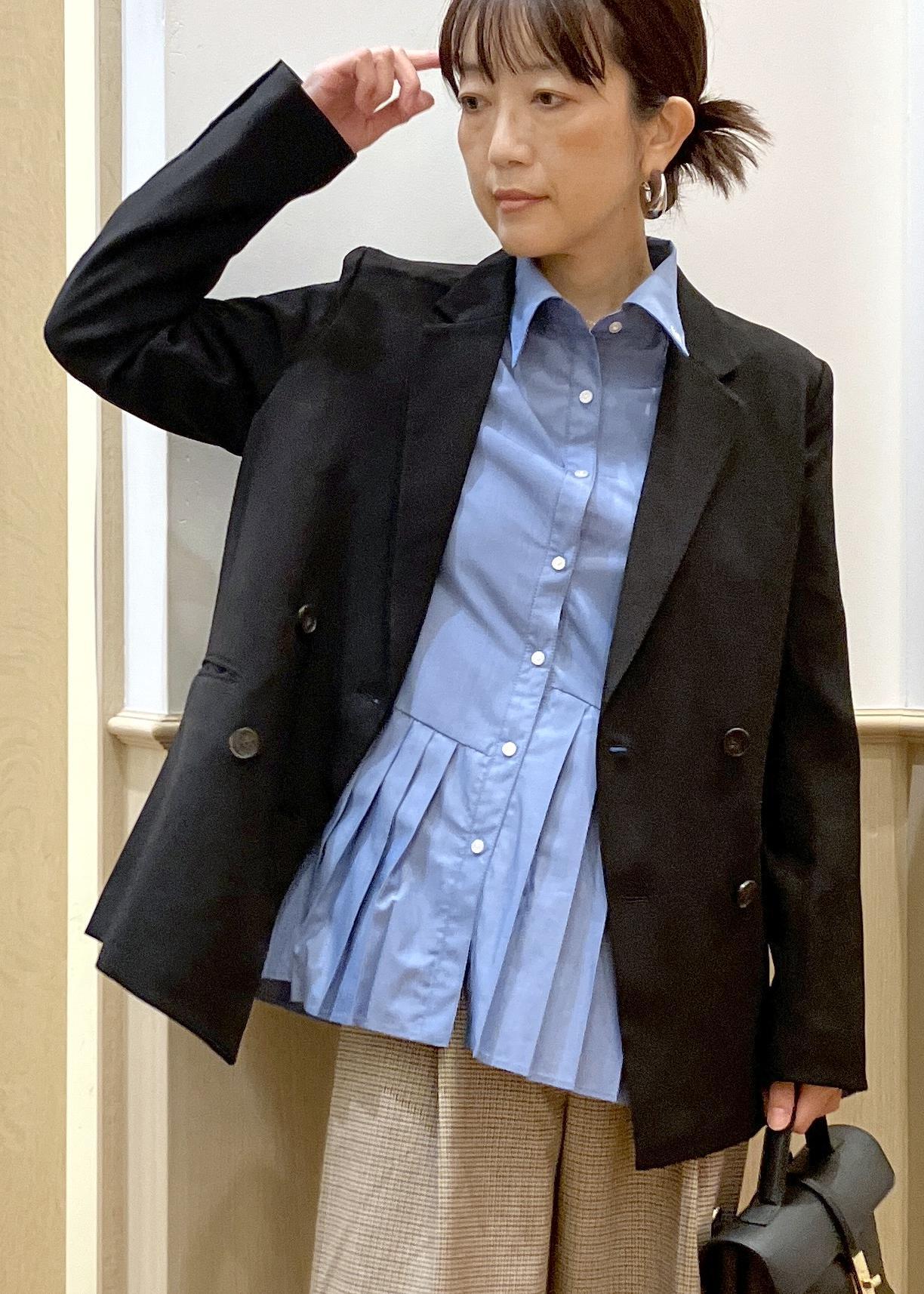 インに合わせたシャツは裾のプリーツがアシンメトリーに入ったデザインなので1枚でもカワイイ!ジャケットを脱ぐ場面がある日でも◎