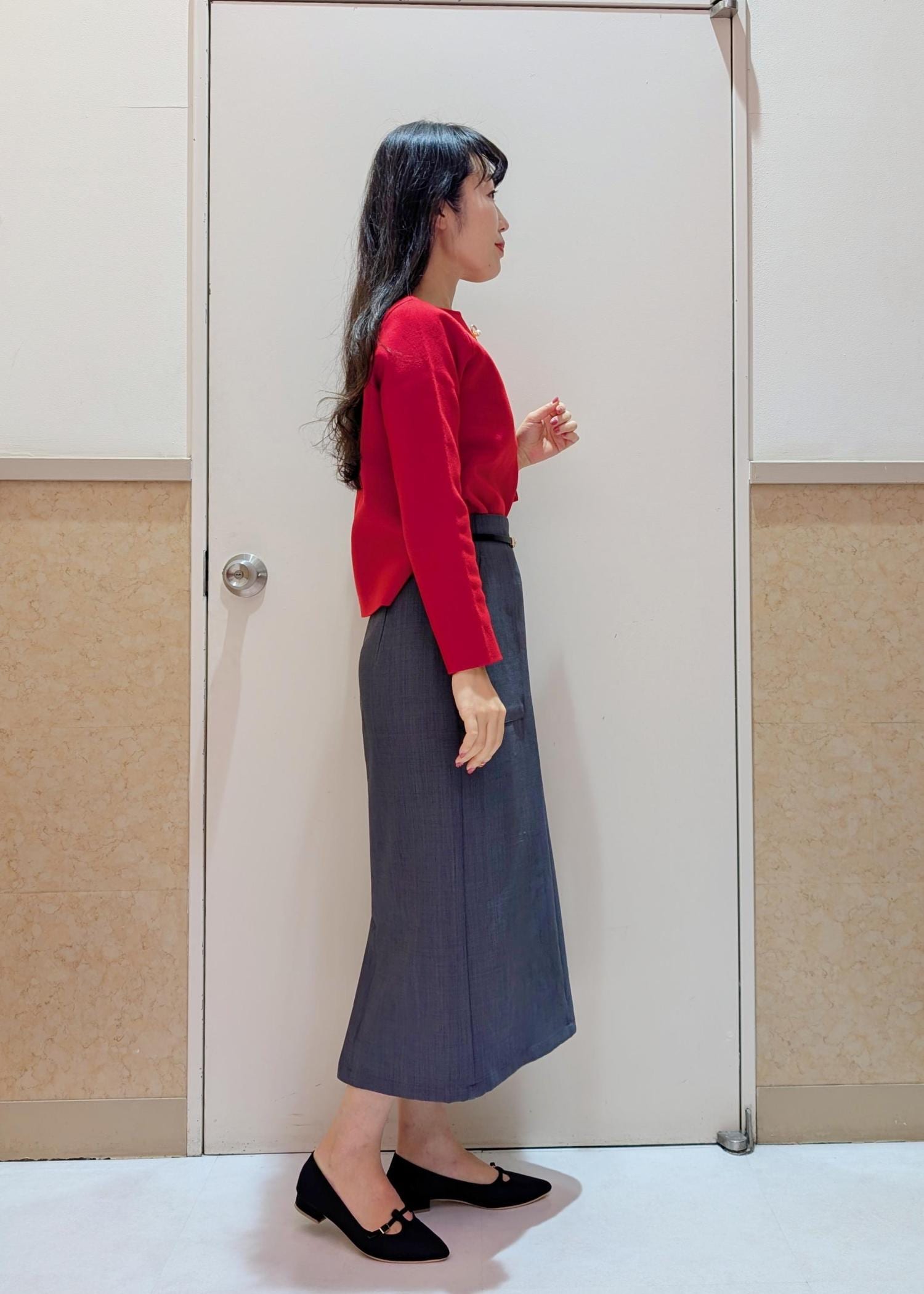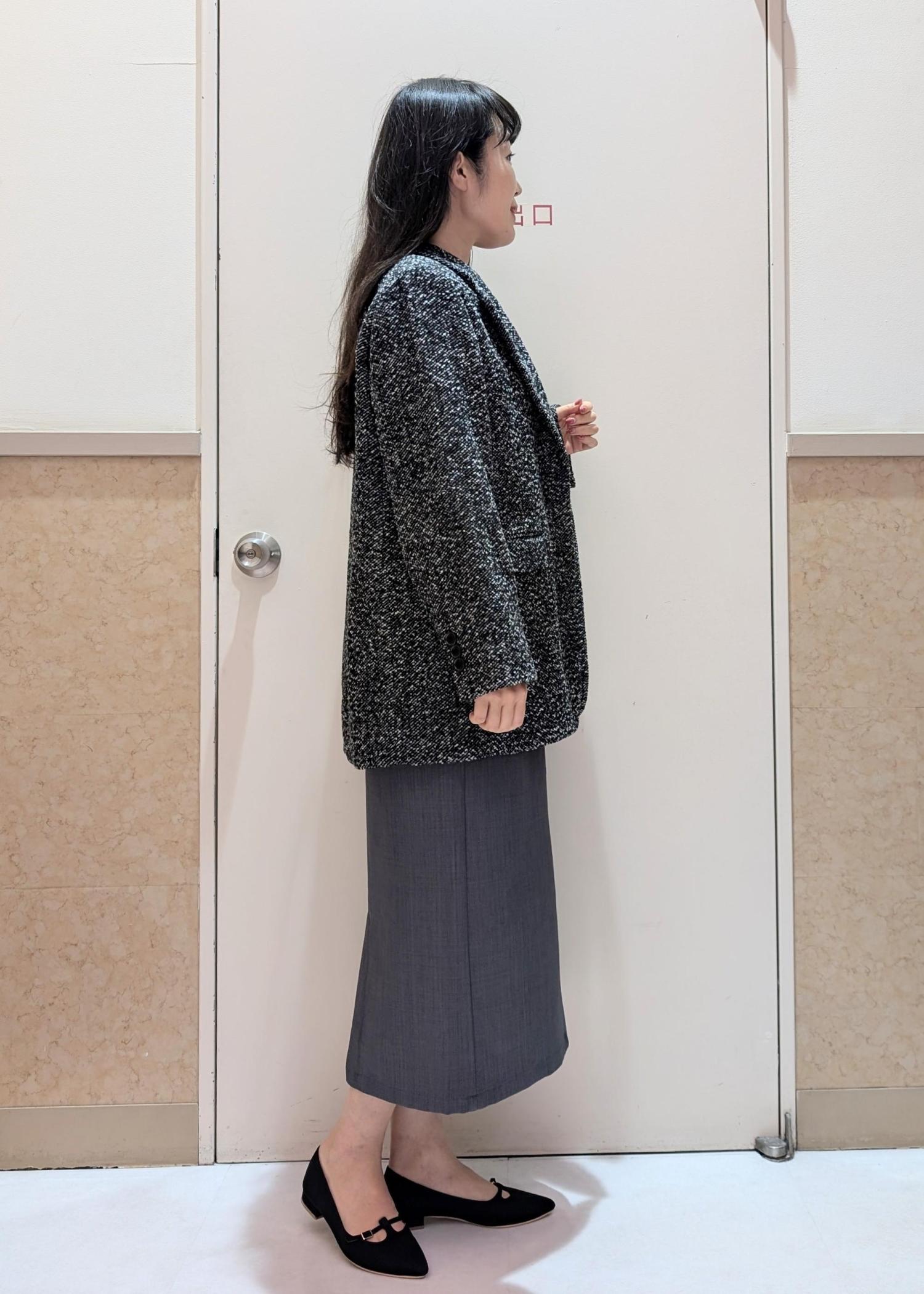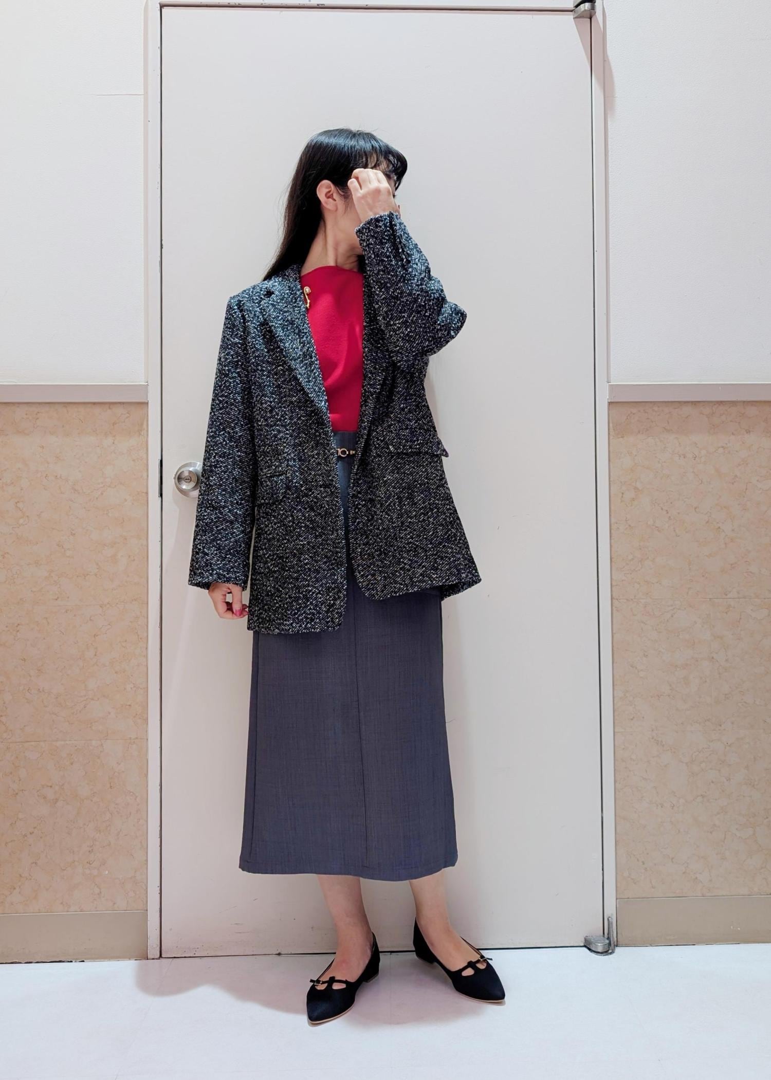 ジャケットがややビッグシルエットなので、ボトムははタイトスカートでバランスを取りました(^^)