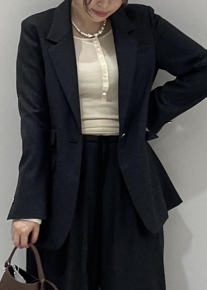 トップスのシングルジャケットは深めの襟元や、後ろのスリットがあるおかげでかなりすっきり見えします。ボトムスは締め付け感が全くなくとても着やすいです☺︎