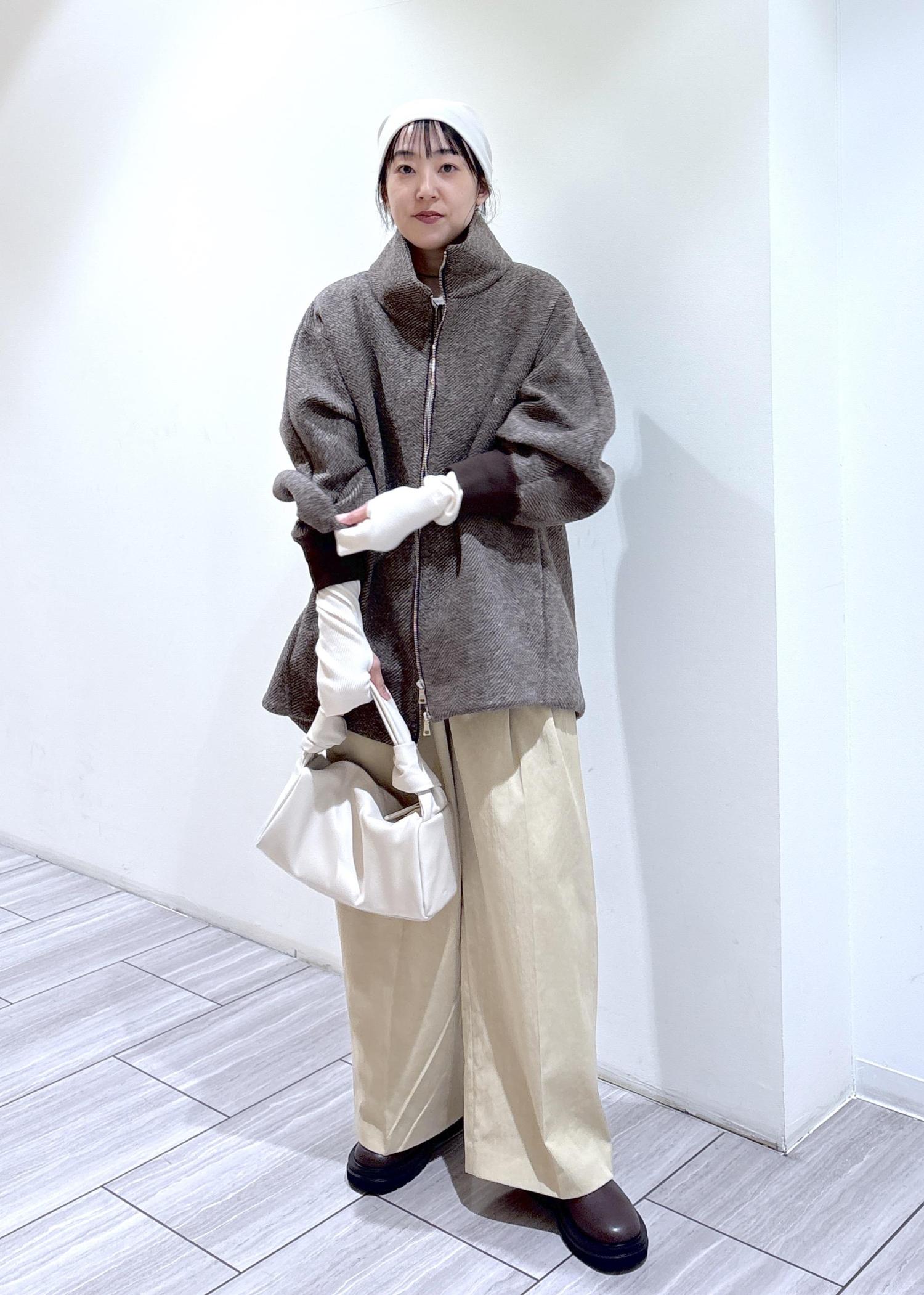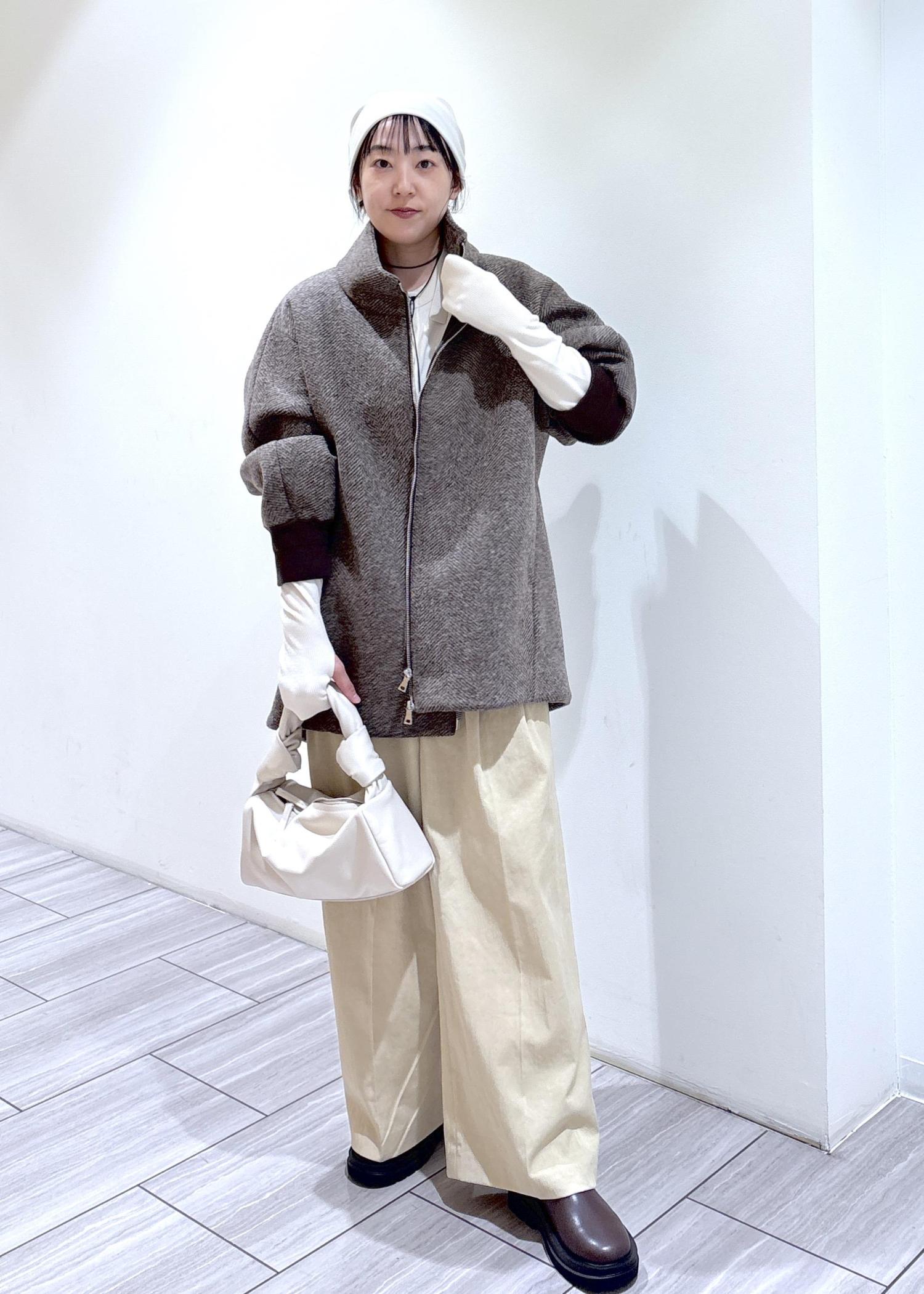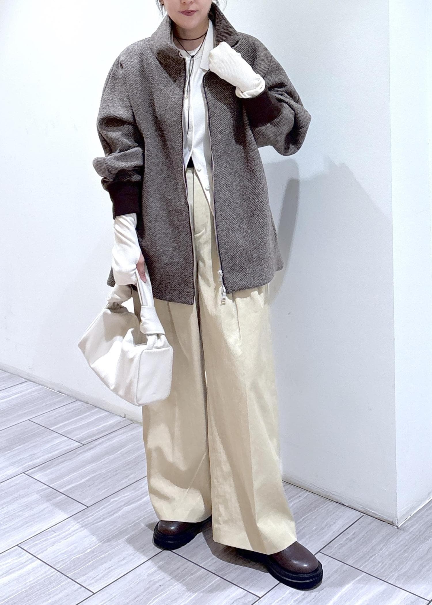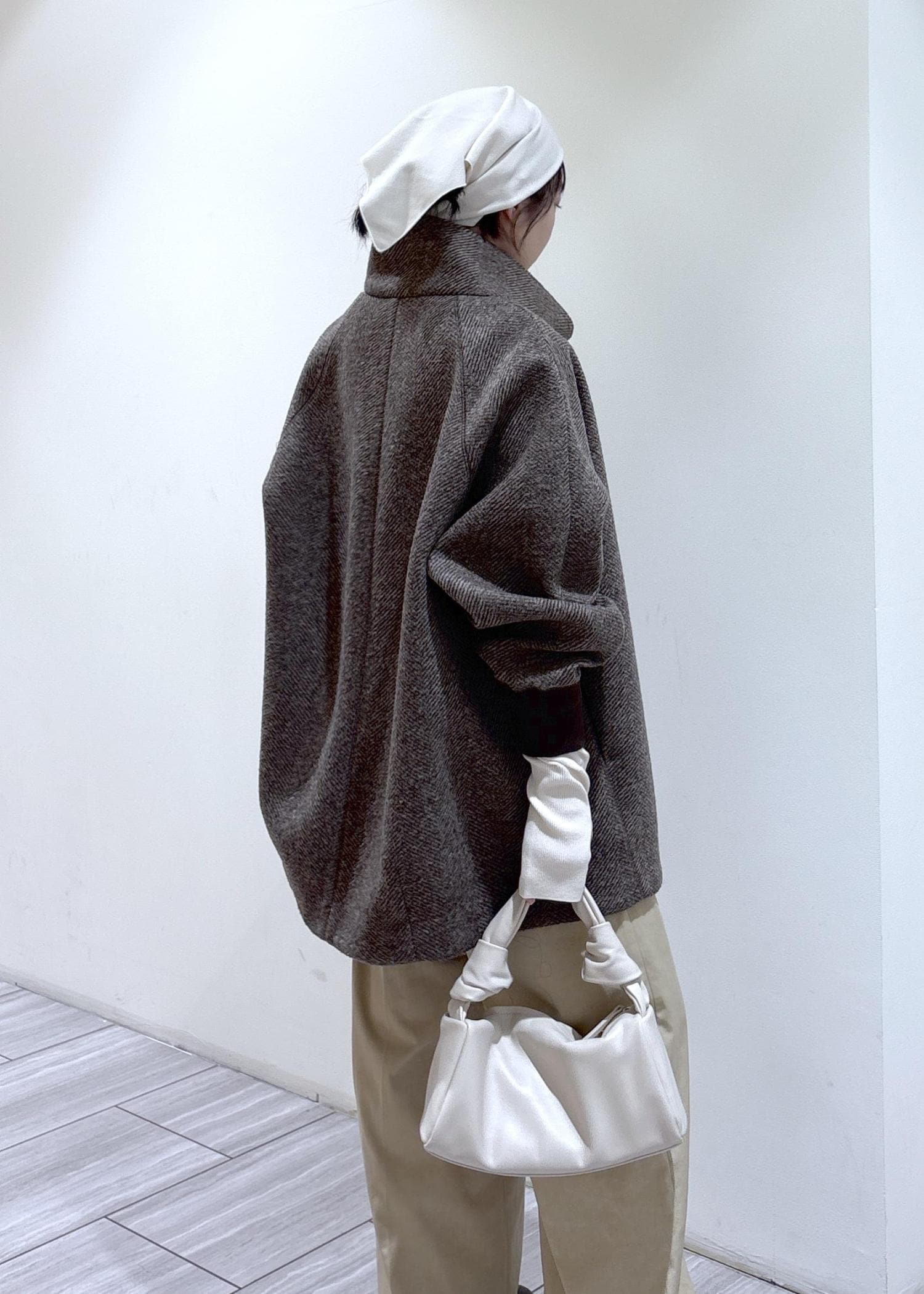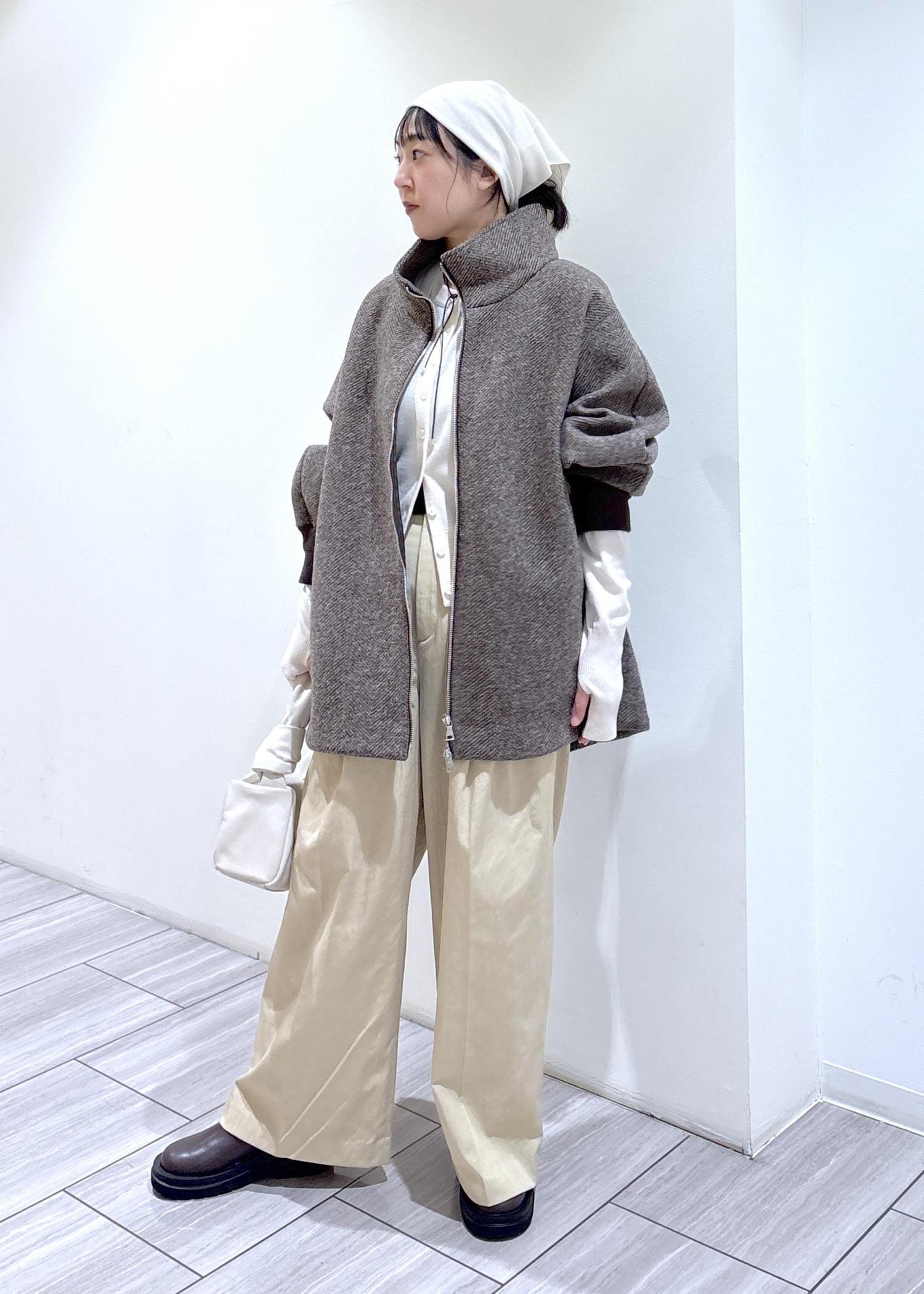 ADAM ET ROPÉ FEMMEヘリンボンツイードボンディングコーディガンブラウン系 / F¥26,400レビュー丸みのあるフォルムで、ヒップラインまですっぽり隠れる長さ。スタンドは程よいゆとりがあり、首の締めつけなく、ファンデーションなども付かない広さです◎
