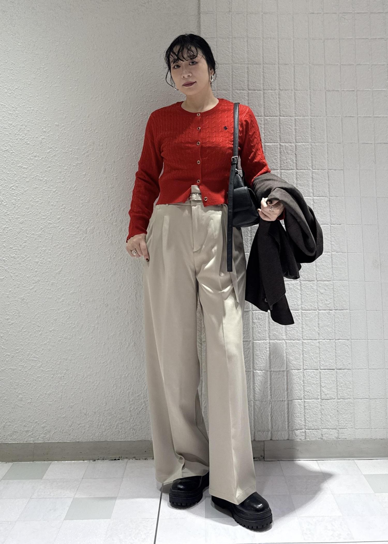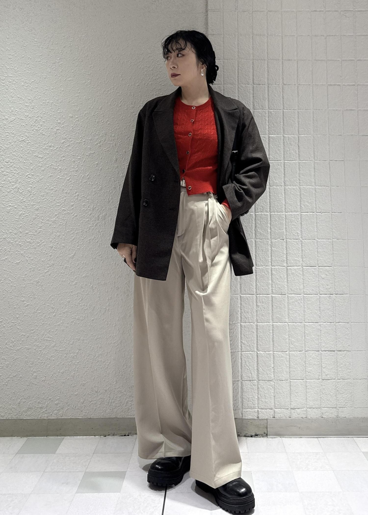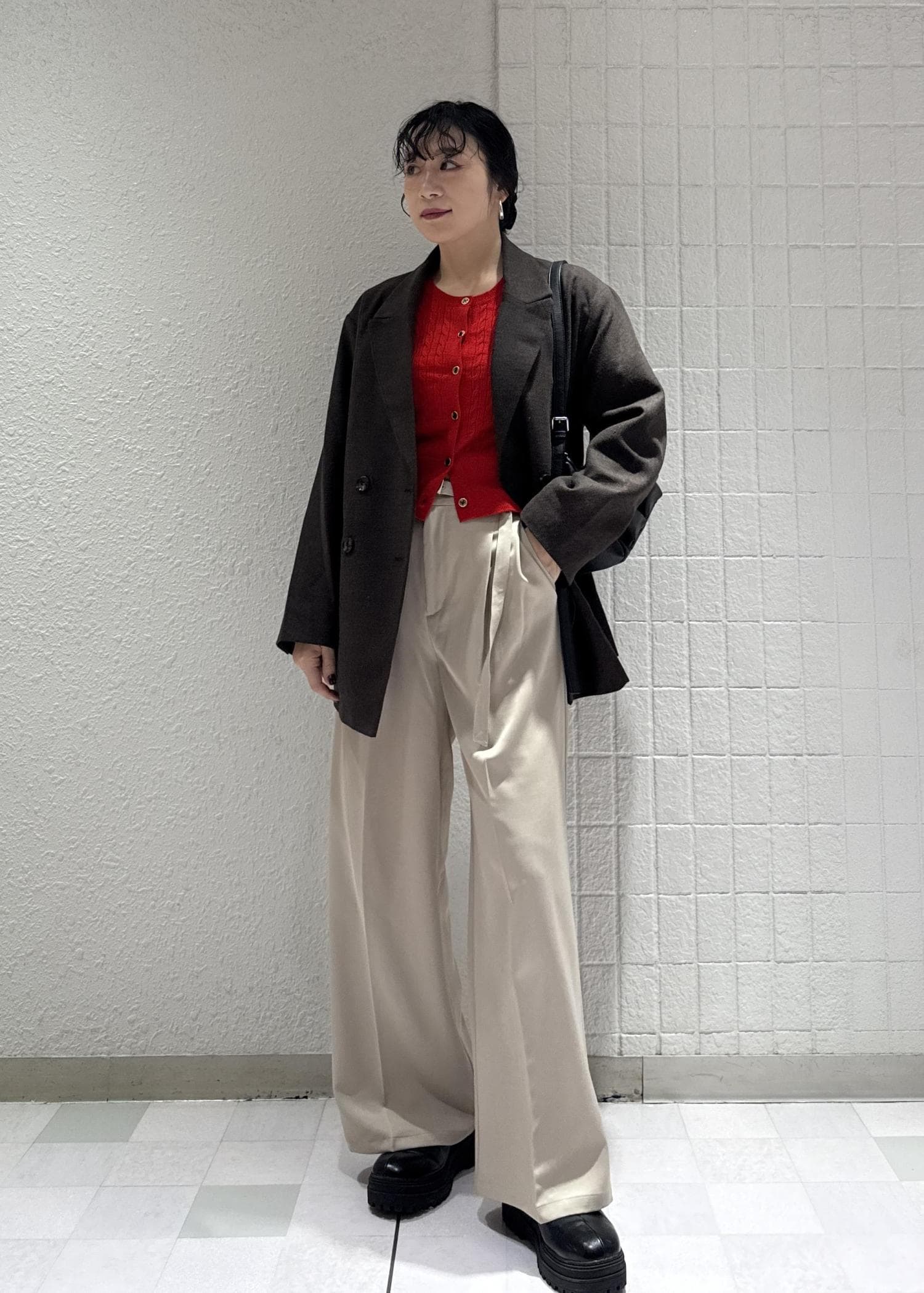 秋らしい濃いブラウンのジャケットに赤いカーディガンがポイントなコーデ♪