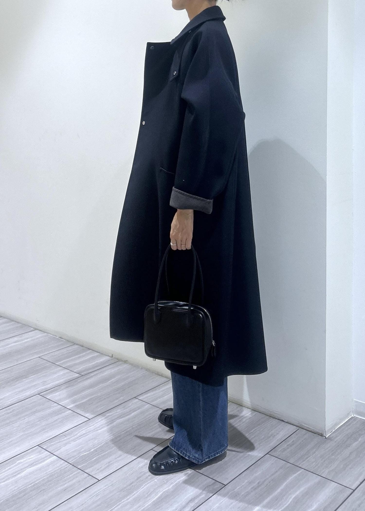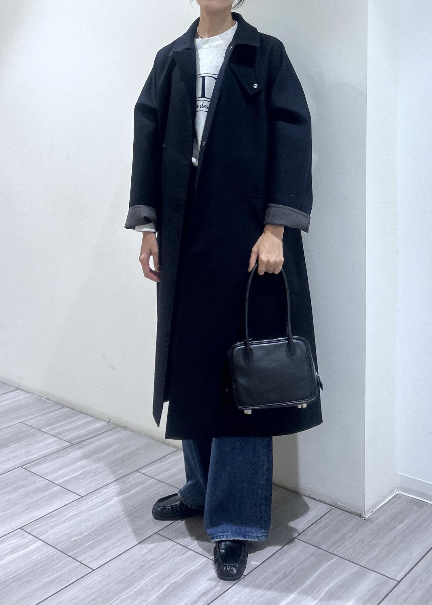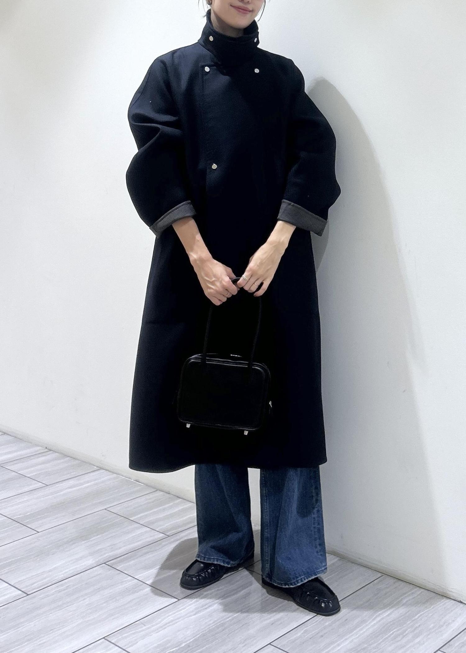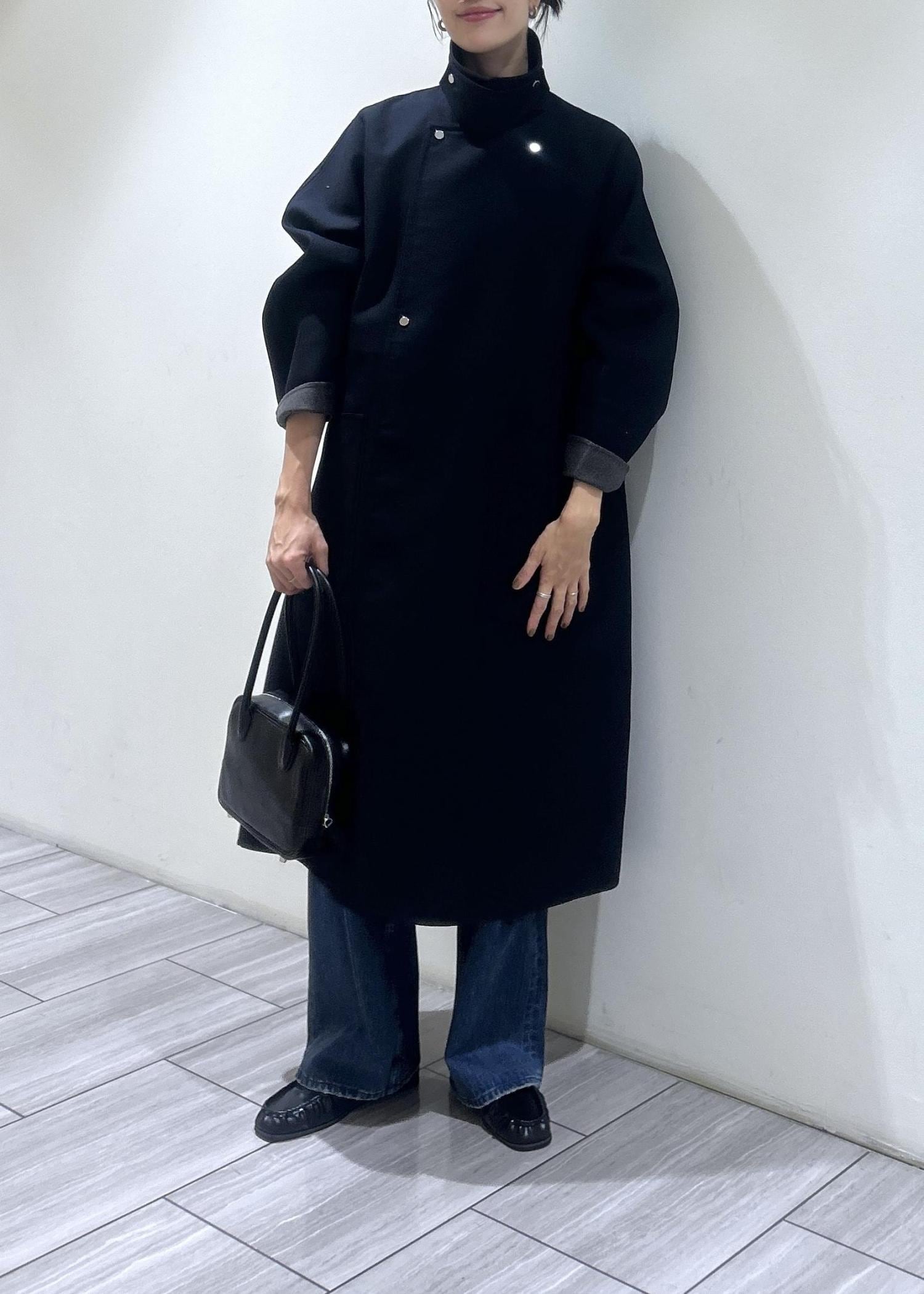 ADAM ET ROPÉ FEMMEソモウリバーロングコートネイビー系 / F¥88,000レビューマニッシュな雰囲気のリバーコートで、軽い着心地なのにしっかり暖かく、スタンドネックで雰囲気も変えられる万能アウターです。厚手のものも着れるくらいのゆったりサイズなので、インナー次第で長い期間着用できます◎