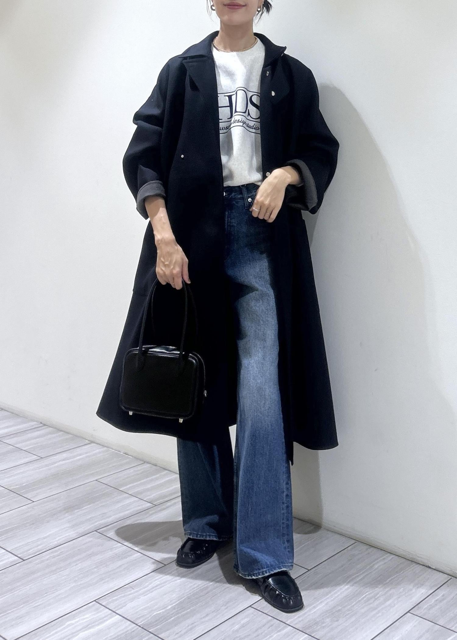 チャンピオン別注のロゴスウェットにデニムを合わせたリラックスカジュアルに、マニッシュなリバーコートで大人っぽく上質な着こなしに。