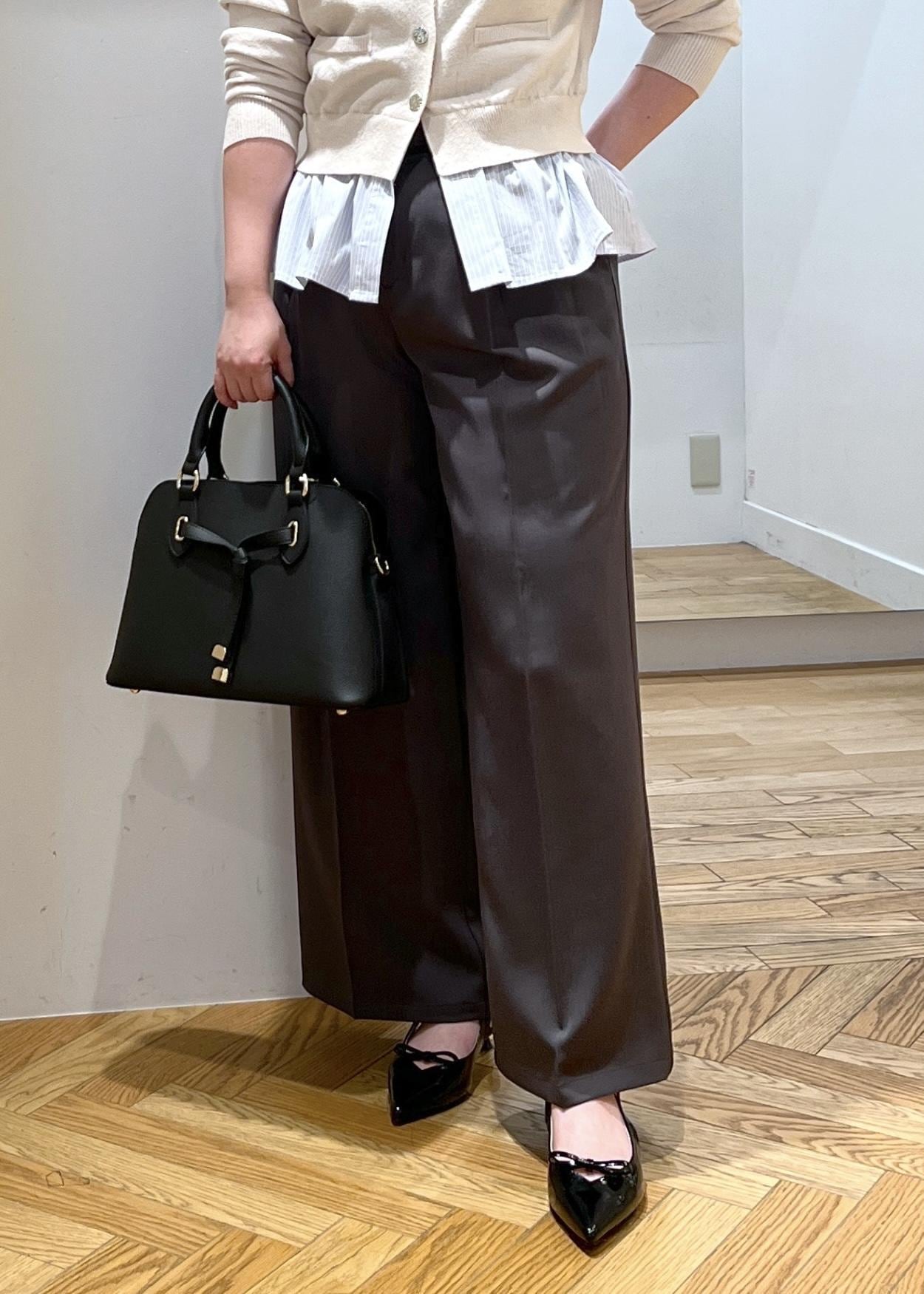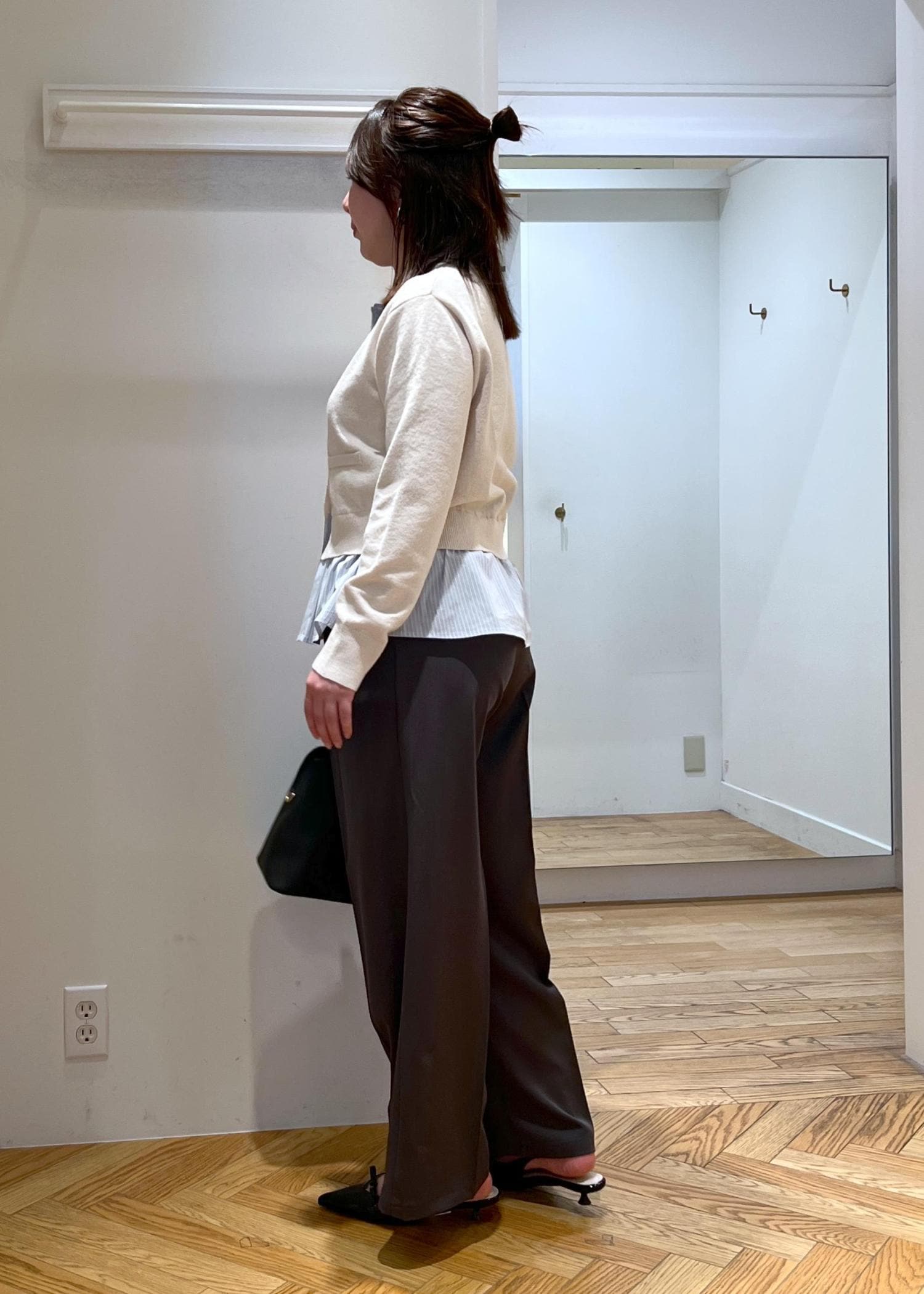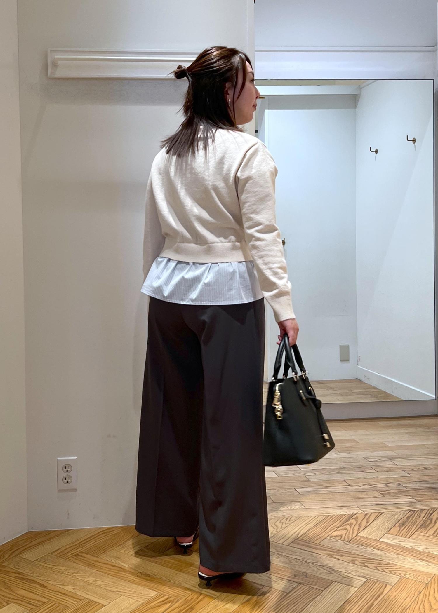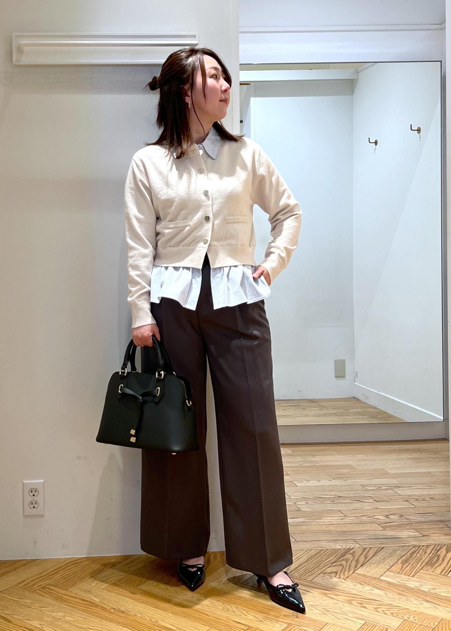 レイヤード風のトップスにとろみ感のあるパンツでお仕事スタイルです。