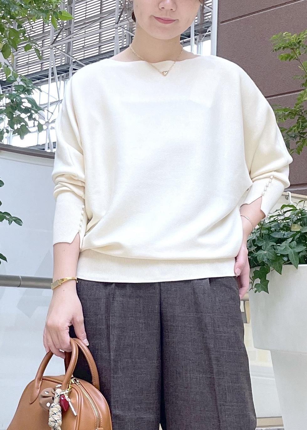 大人気のマシュマロパールドルマントップスを使った秋コーデです。