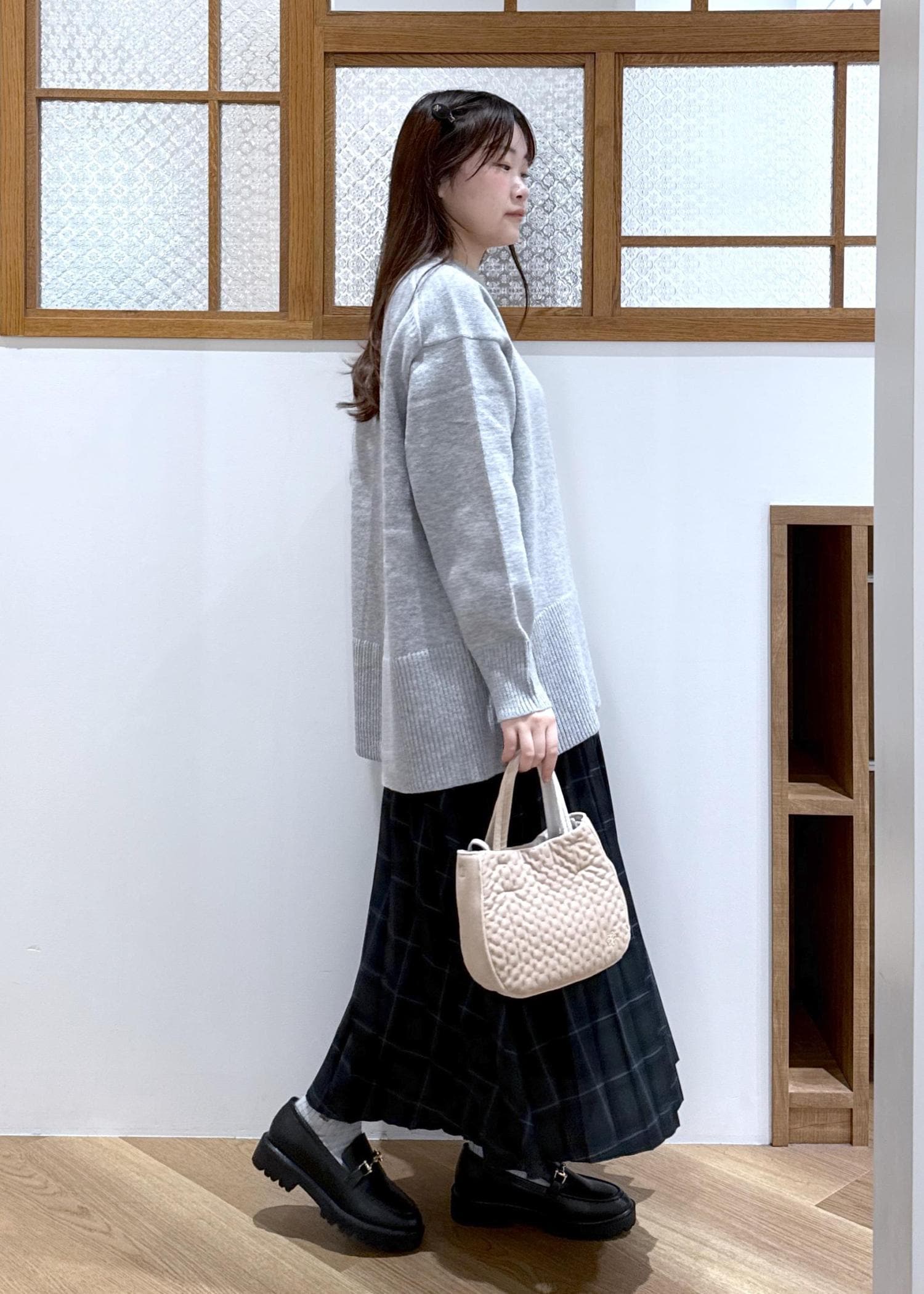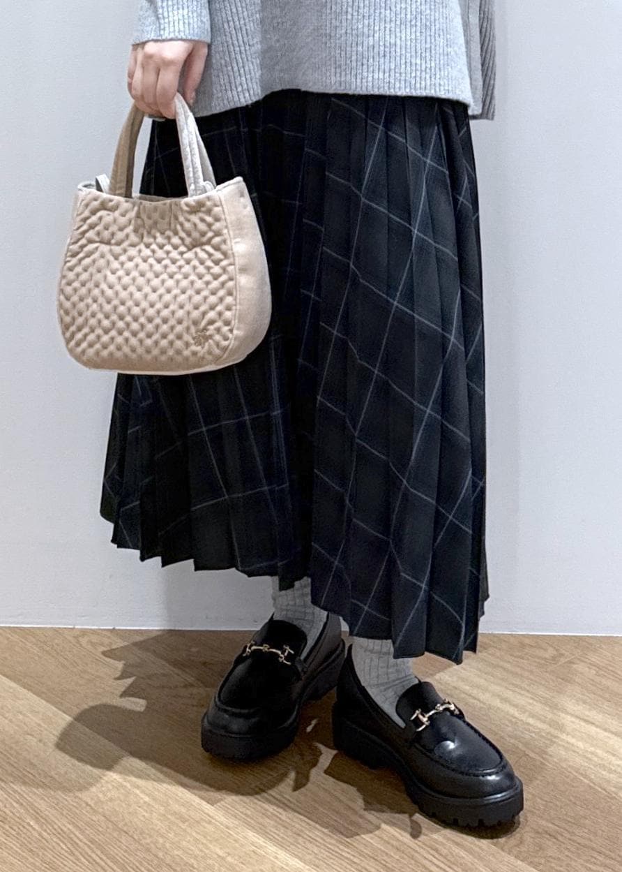 バッグはベロア生地のものを合わせ、秋らしさをプラスしています。