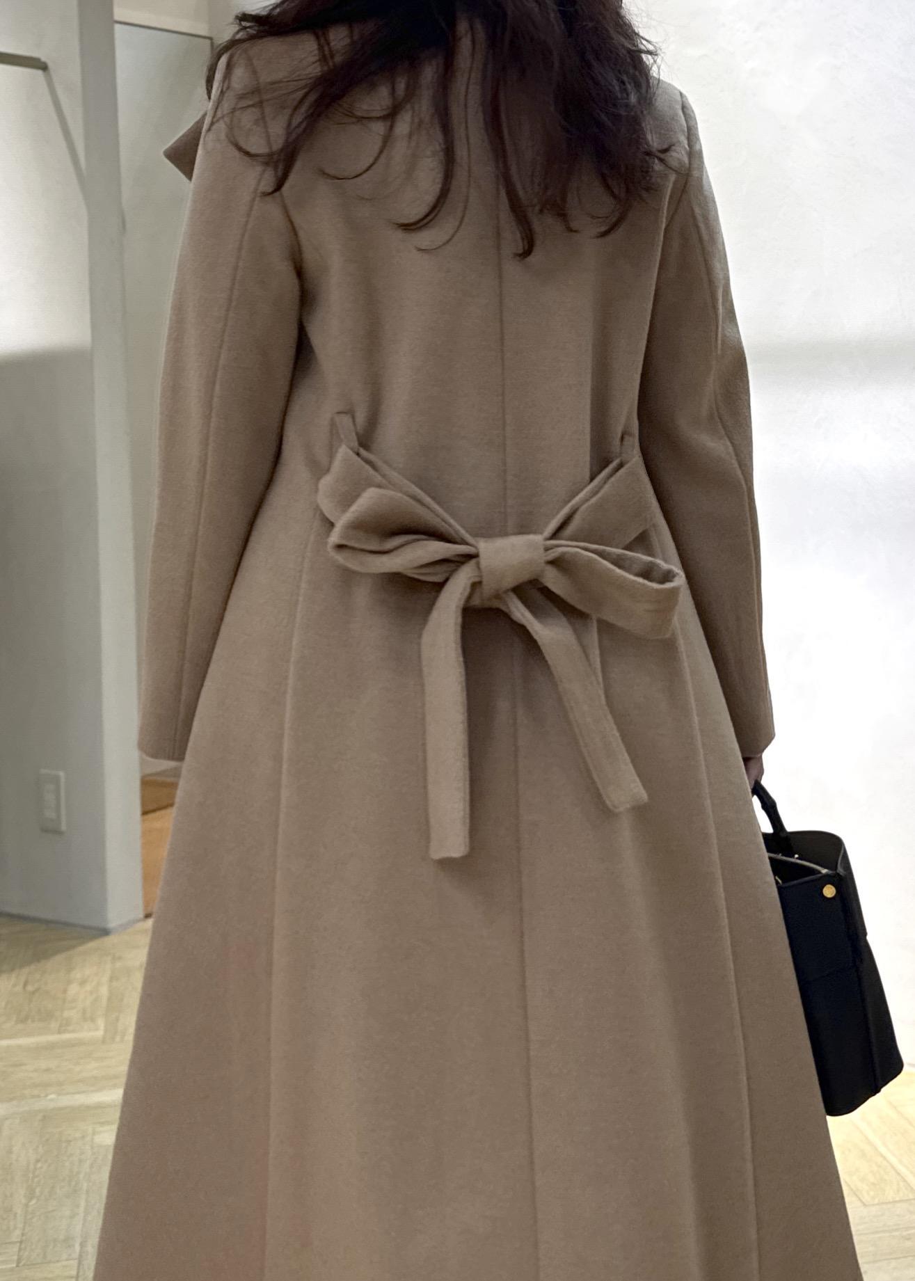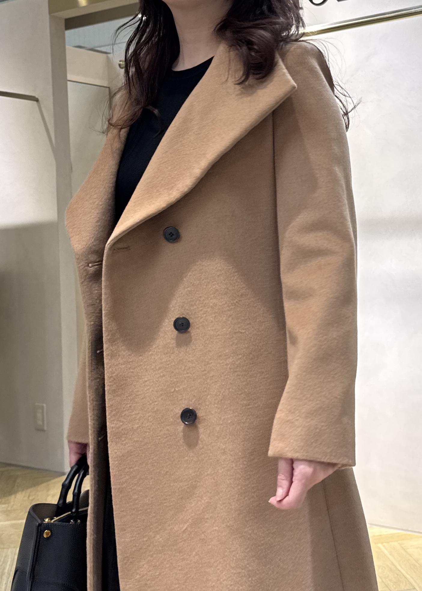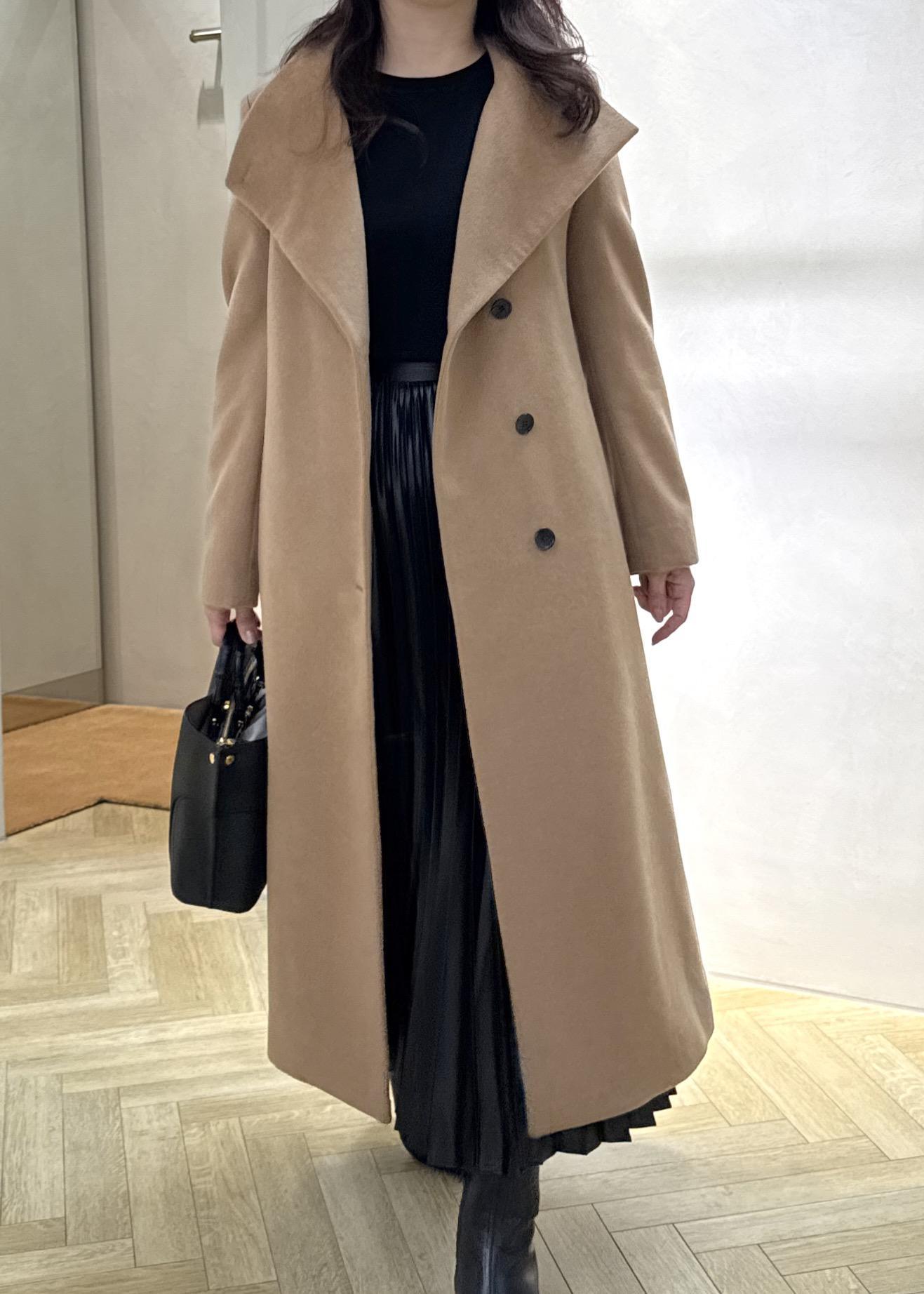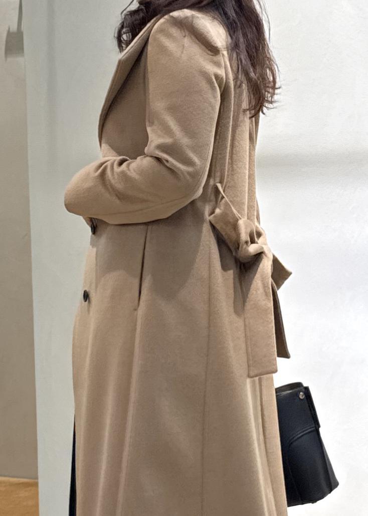 広がりの少ないスッキリとしたシルエット、腰位置高めのベルトがスタイルアップ効果抜群。カシミヤ混の上品なツヤがとても素敵で軽くて暖かいオススメアウターです!