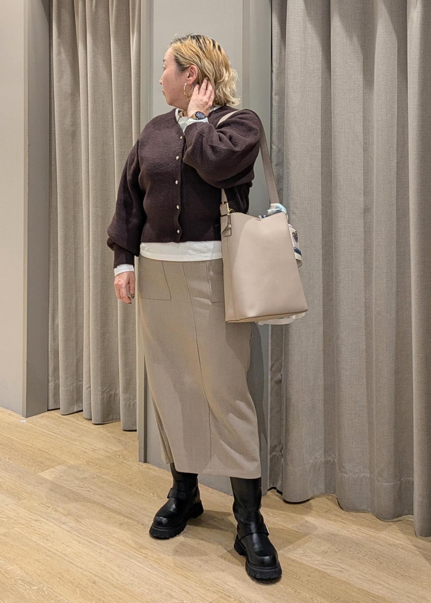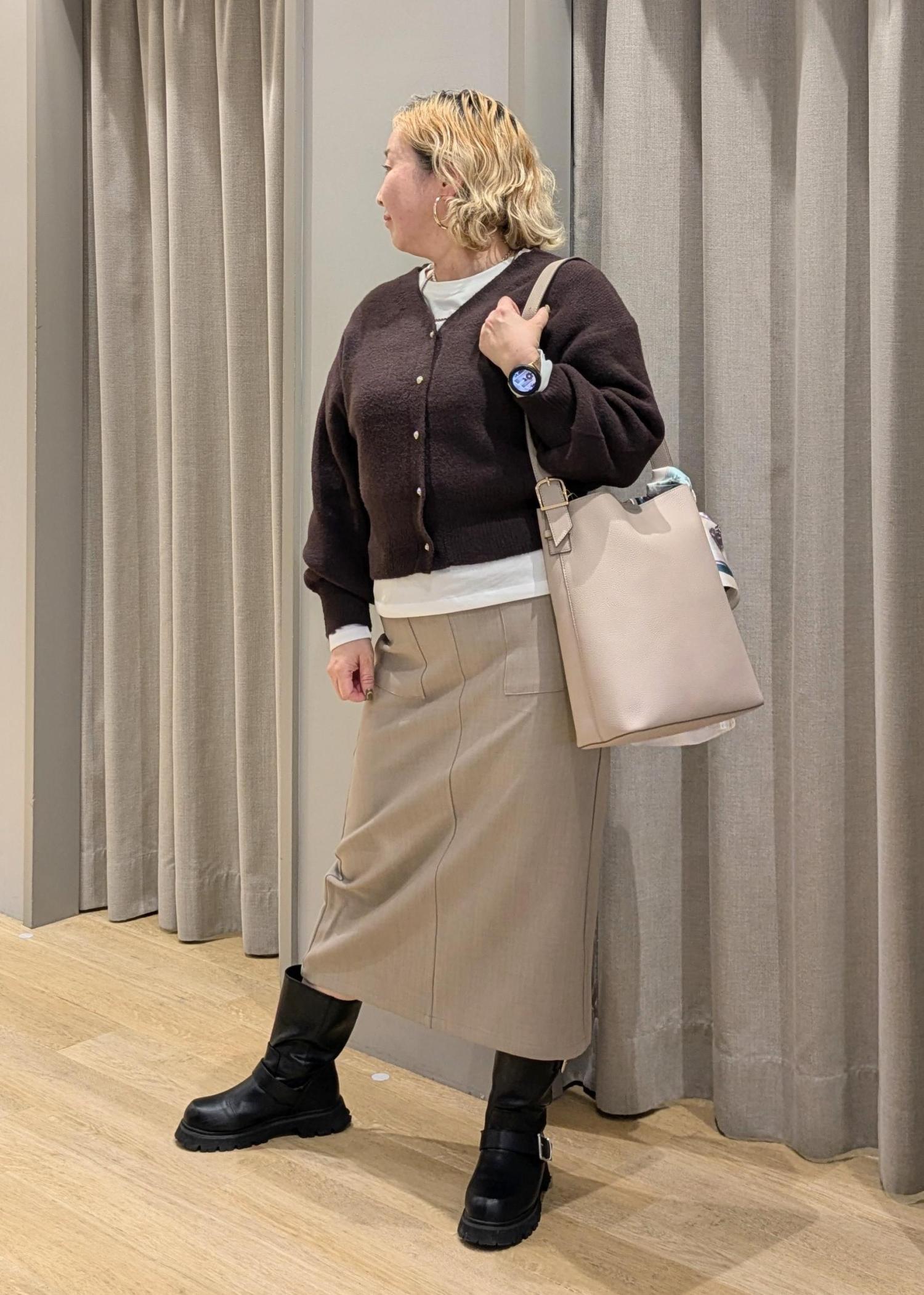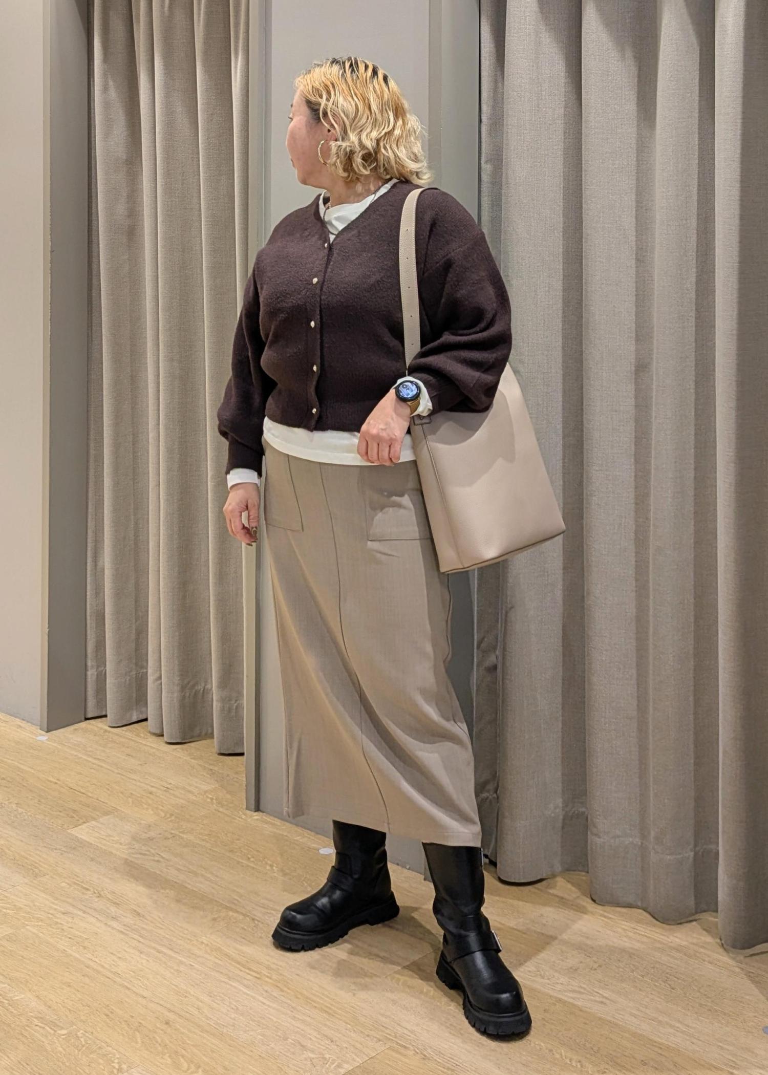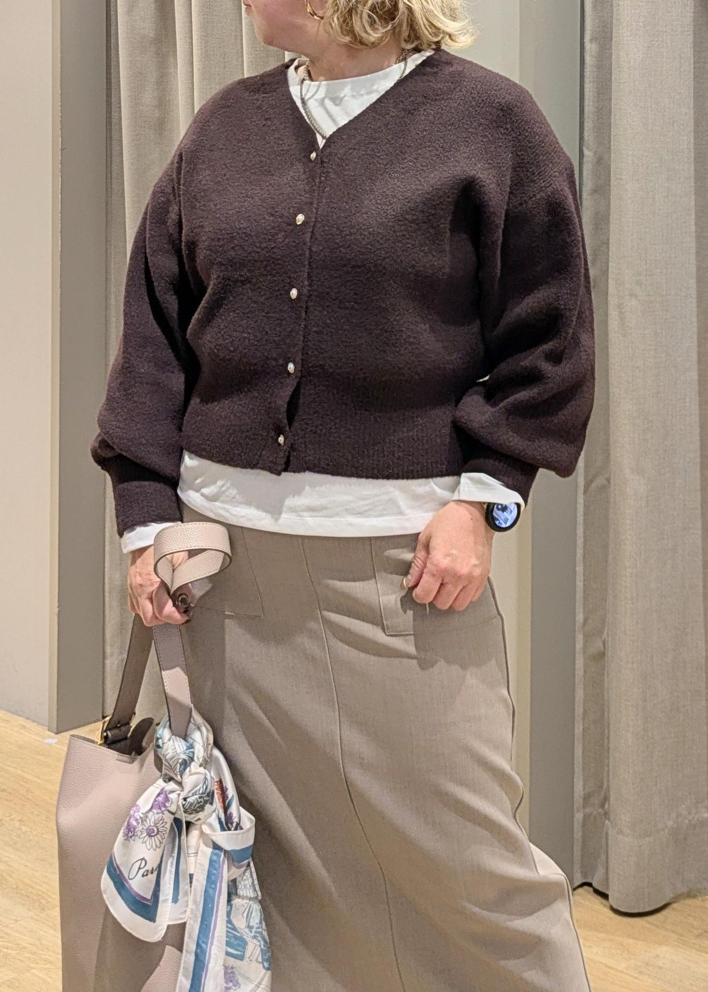 ゆったりカーデで上半身をふんわりカバーしつつ、